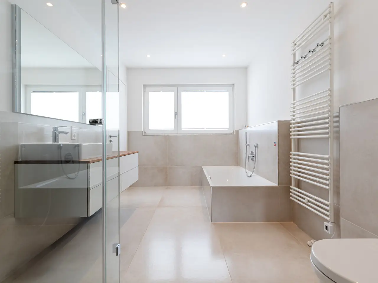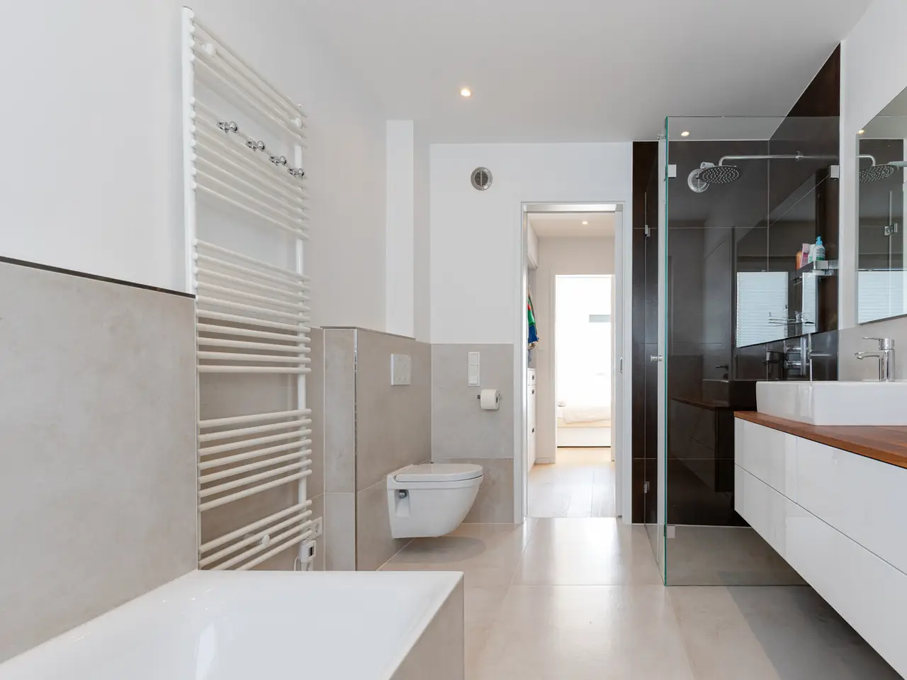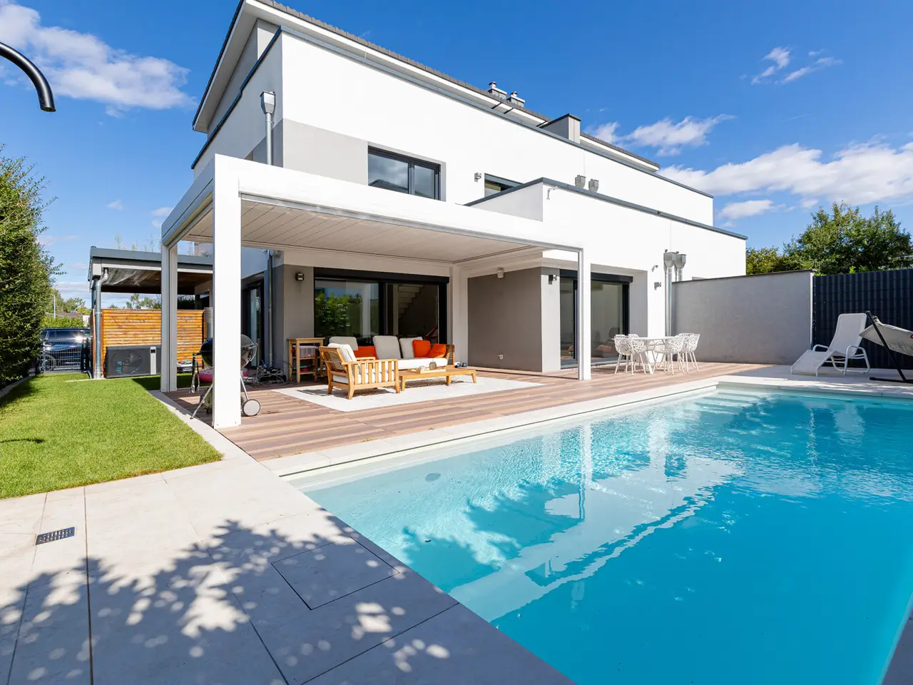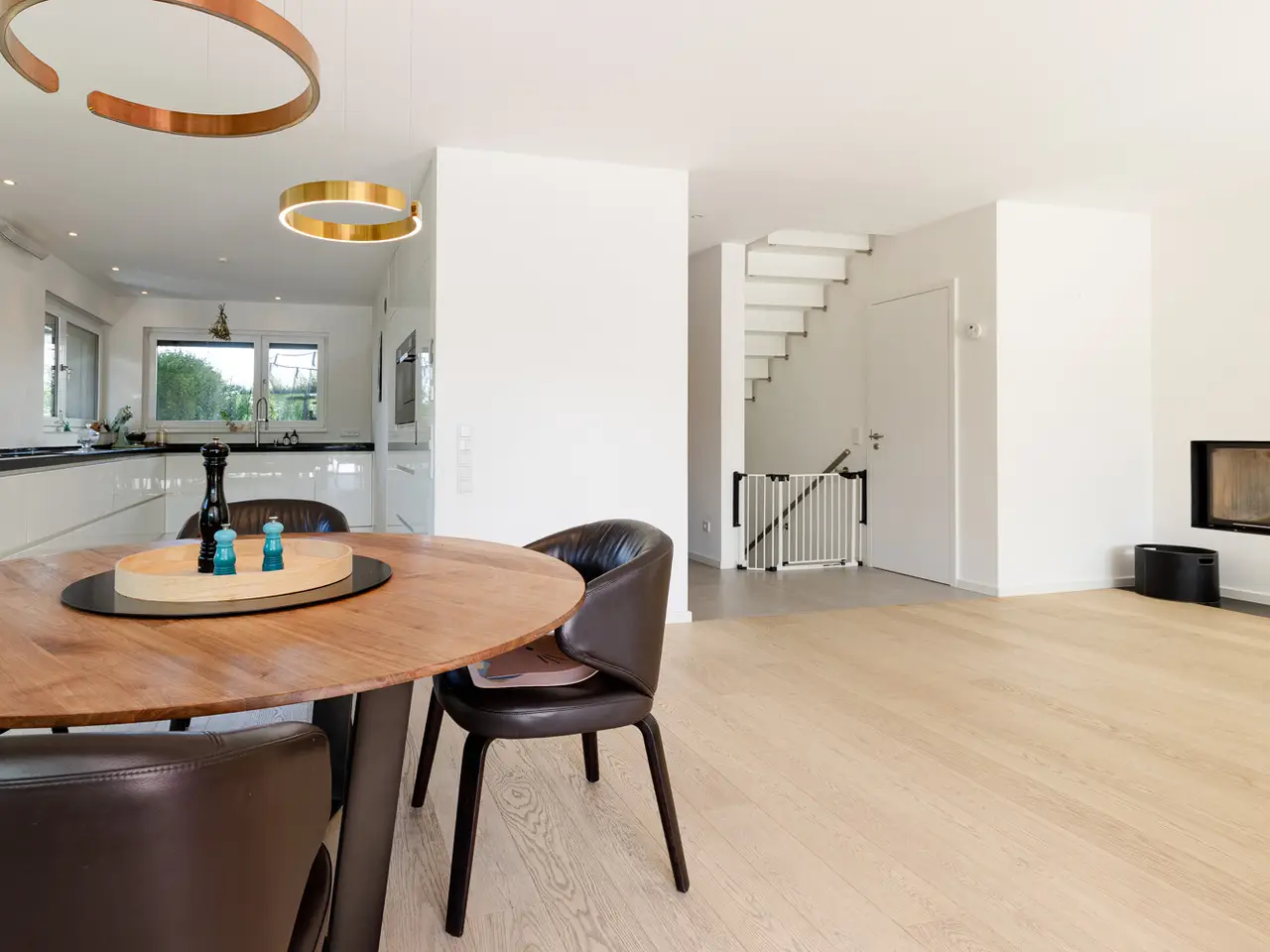 This modern semi-detached house from 2017 stands on a plot of approx. 471 m² and offers around 240 m² of living space. It is ideal for families who value style, comfort and a well-thought-out room layout. The open-plan living and dining area forms the heart of the house. Generous window fronts flood the room with natural light and open up a direct view of the garden with heated pool, outdoor shower and counter-current system. The covered terrace with modern pergola extends the living space outdoors and invites you to spend relaxing hours with family and friends. High-quality parquet flooring, air conditioning and the exclusive kitchen with granite worktop and Miele appliances ensure a stylish living ambience. Lighting, blinds and other functions can be conveniently controlled centrally via the integrated smart home system. There is also a practical laundry room on the first floor, which is ideally integrated and functional and features durable floor tiles. This makes it easy to organize everyday life without taking up living space on the upper floor. Upstairs, you will find three flexible bedrooms and modern bathrooms that are ideal for families with individual space requirements. A special highlight awaits you on the top floor: a private sauna area with shower and private terrace, the perfect place for relaxing wellness moments. Alternatively, this area can also be designed as a spacious parents' area with plenty of privacy. The versatile outdoor area is impressive: the sheltered garden behind the house with its heated pool offers a green oasis that is ideal for relaxation and leisure. The front garden is ideal as a play area for children - it is safe, clearly laid out and offers enough space for play equipment or vehicles. So everyone in the family has their own space. The offer is rounded off by sustainable home technology, including an air-to-water heat pump, a solar system and a water softening system. Three parking spaces right next to the house offer additional convenience.