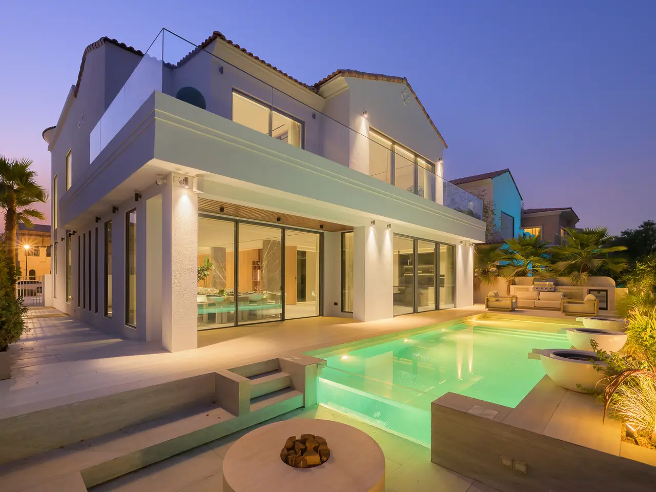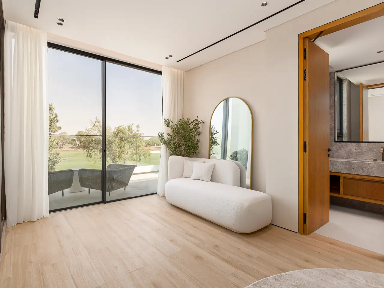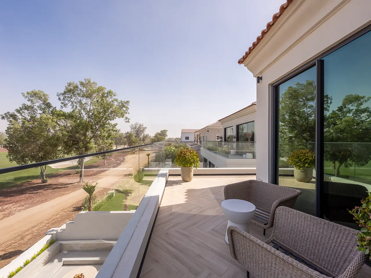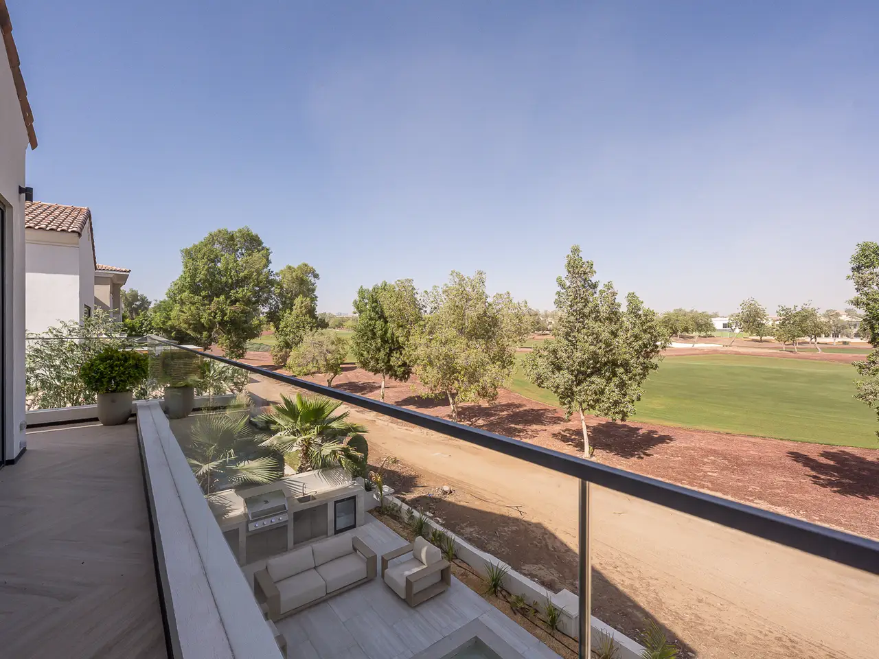 PRIME By Betterhomes are delighted to introduce this immaculate, fully upgraded 5 bedroom villa set in the heart of Wildflower, Jumeirah Golf Estates. - 5 Bedrooms - 7 Bathrooms - Maids + Drivers - Luxury Finishes - Earth Golf Course Views - Garage for Two Cars - 7,689 Plot Size - Smart Home Technology - Entertainers Garden - Miele Kitchen Appliances - Wood Flooring and Travertine Throughout This elegant villa is not just a home, it's a statement of luxury living set in one of Dubai's most sought after communities. As you step inside, you're greeted by a sleek, contemporary design infused with Scandinavian style to give a warm homely feel. The beautiful use of Travertine and solid wood allows the home to feel bright and modern. On the first floor you have a spacious guest en-suite bedroom, open plan kitchen with Miele appliances, prep kitchen, maids + drivers room and a spacious living/dining area. The entertainer's garden offers stunning views of the golf course, comes with an outdoor BBQ area, sunken fire pit, infinity pool and grass patch for the kids. Upstairs there are a further 4 en-suite bedrooms which are all spacious with balcony access. The two master bedrooms have large walk-in wardrobe and share a spacious balcony with a calming golf course view.