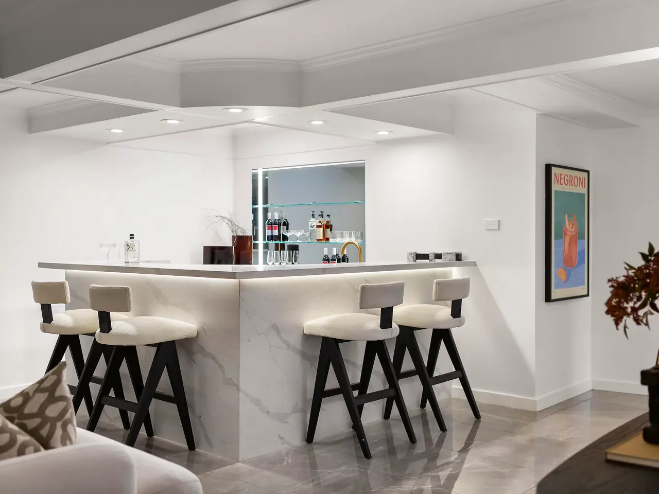 Striking island kitchen with premium finishes and marble-effect stone surfaces