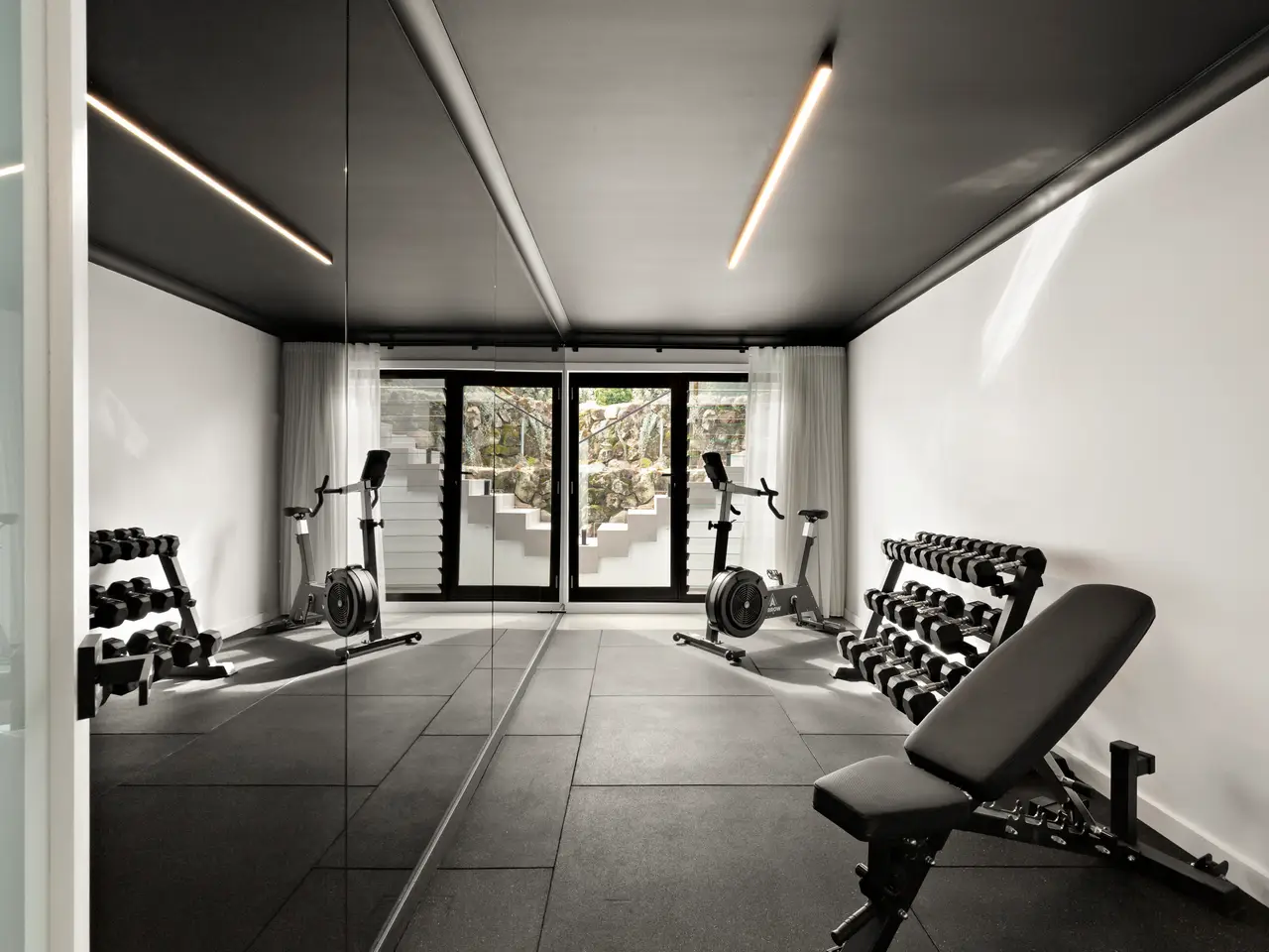 Large home gym with outdoor access, louvered windows, and adjoining bathroom