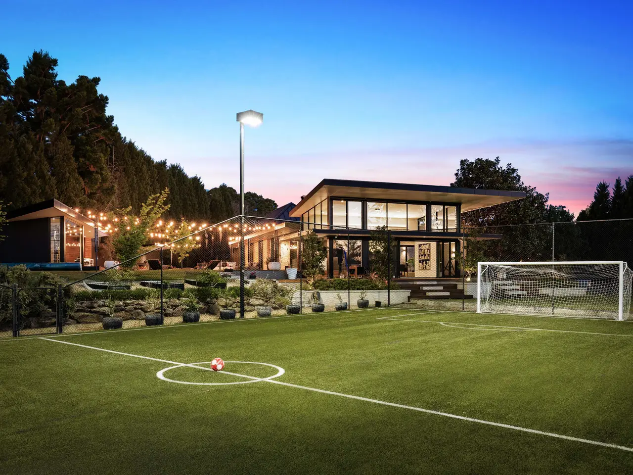 Outdoor fire pit & synthetic grass football pitch