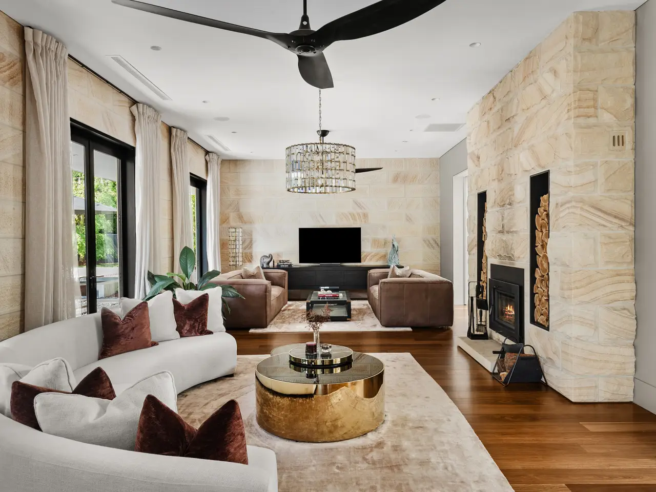 Feature chandeliers & zen suspended fireplace