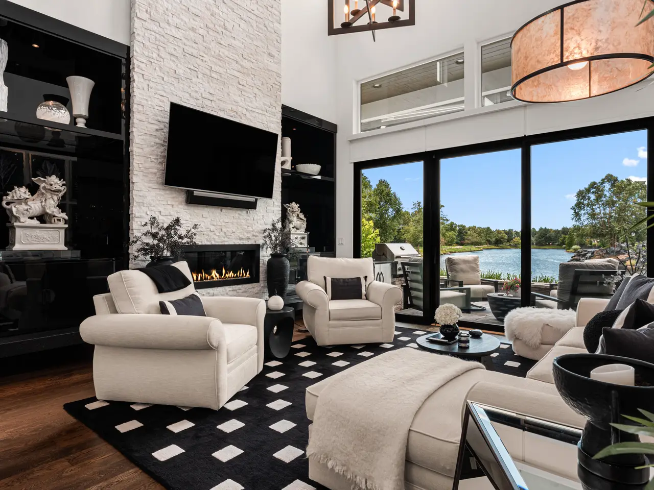 Experience refined living in this one-of-a-kind custom-built residence, set on a private waterfront lot within the prestigious gated Lakemoor community. Situated on a quiet, dead-end cul-de-sac with direct Greenbelt access, this prime location is just steps from the renowned Crave restaurant and the Lakemoor District shops. The sleek, modern interior is adorned with soaring double-height ceilings, rich hardwood flooring, and expansive windows that flood the home with natural light. The open-concept living space centers around a dramatic floor-to-ceiling stacked stone fireplace and flows seamlessly onto a covered patio equipped with a full outdoor kitchen. The kitchen features a curved granite island, Thermador and Sub-Zero appliances, a walk-in pantry, and a convenient dumbwaiter. The luxe master is set on the main level while the upper level hosts a large bonus room and full Jr. Suite. Enjoy exceptional amenities including two resort-style pools, sports courts, & walking paths with fabulous walkability!