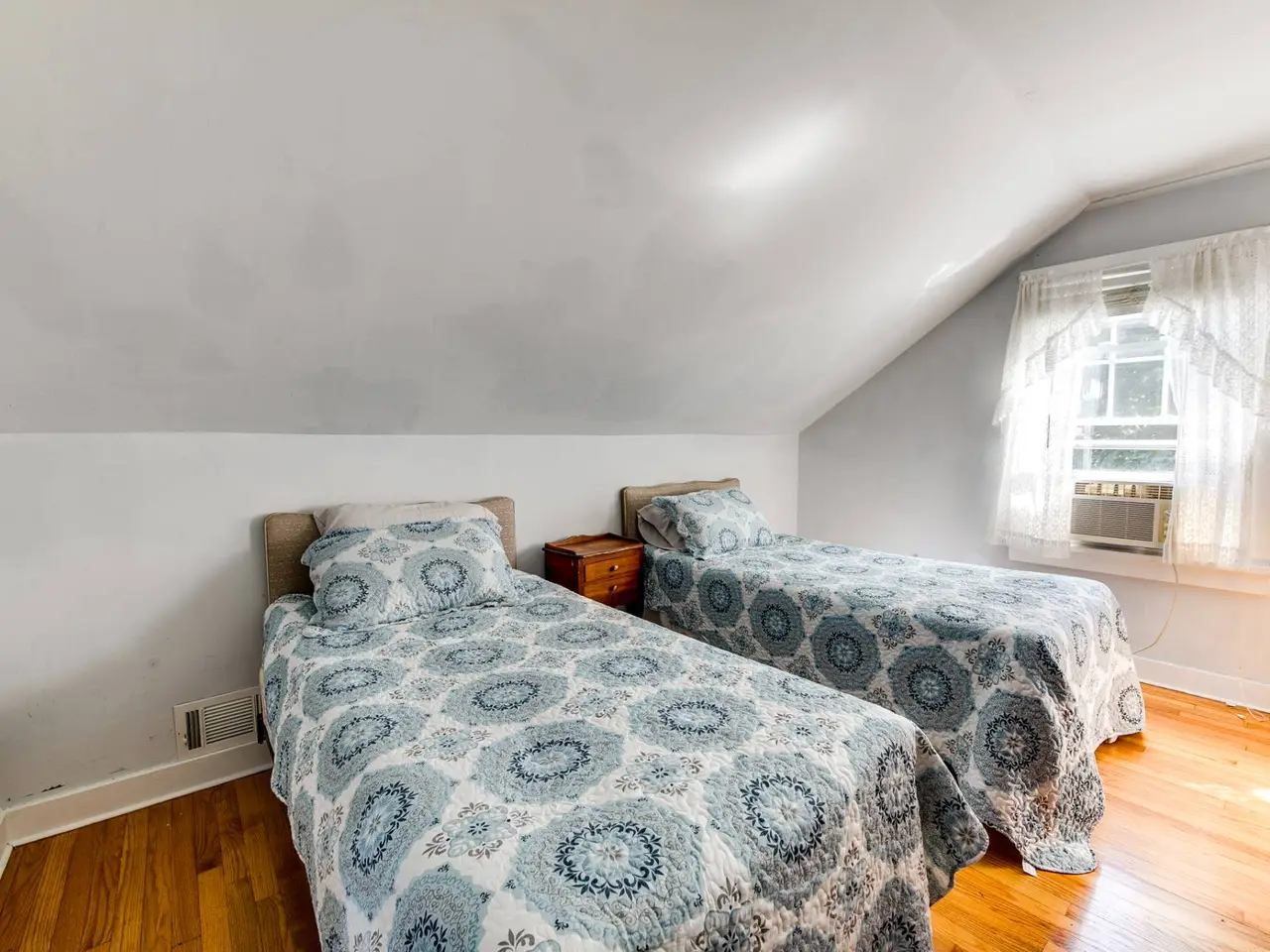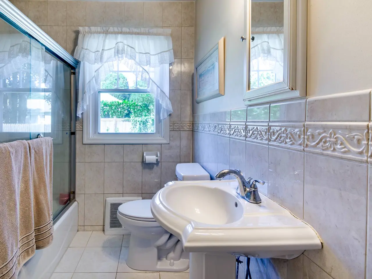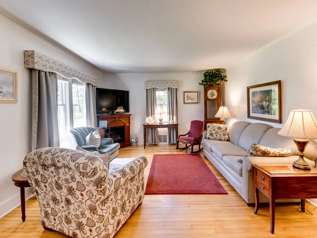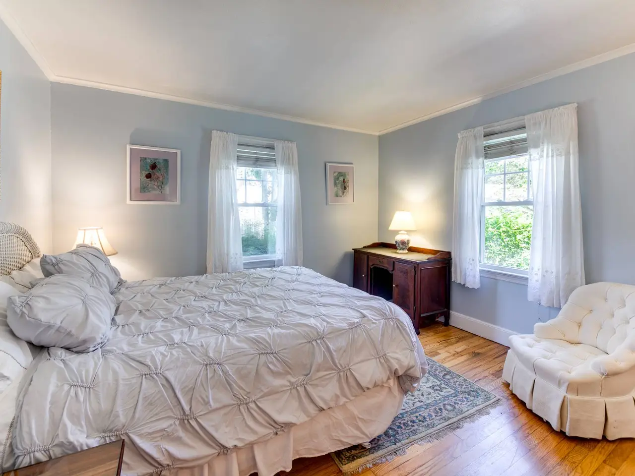 Just a stone's throw away from East Hampton's North Main Street, this charming 3-bedroom, 2-bathroom cottage is cute as a button and offers all the conveniences that come with village life. Enjoy nearby ocean beaches, shopping, restaurants, and museums, as well as the ease of having the Jitney and train station just a mile away. Upon entering the front door, you'll be greeted by a cozy living room with wood floors that flow into the adjoining dining room through a wide graceful arched doorway. Other original architectural features include two glass panned built-in corner cabinets in the dining room and a set of built-in drawers and shelving in the downstairs primary bedroom. An adjacent renovated full bathroom serves the first floor. Just off the dining room is a bright and cheerful eat-in kitchen with access to the laundry room and a full unfinished basement. The second floor offers 2 additional bedrooms and a shared full bathroom. This 1800 square foot home sits on a neatly landscaped .34-acre lot with front and rear stone driveways, a detached one car garage, and a spacious backyard for relaxing and entertaining. Don't miss this perfect summer retreat!