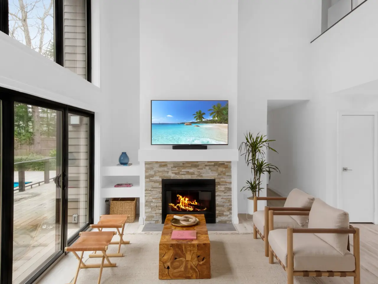 Located just moments away from Gardiners Bay, Three Mile Harbor and Sammy's Beach, this wonderful 2,100 square-foot contemporary home, set on a shy acre, is the perfect summer retreat. Upon entry, you are welcomed into a brilliant living and dining space with soaring ceilings, a wall of windows and sliders that lead to the backyard. A wood-burning fireplace centers the expansive room. The adjacent open-style kitchen offers a seamless gathering space for entertaining. The main level includes three guest bedrooms and two full baths. The primary bedroom is located on the second level and features a cathedral ceiling and large ensuite bath. The back of the property boasts a 20 x 40' heated pool surrounded by decking and a lushly landscaped yard.