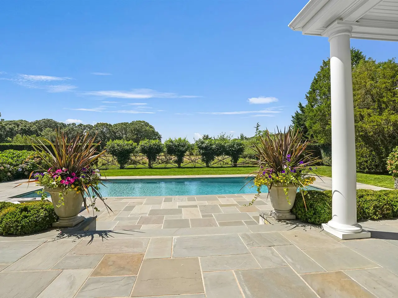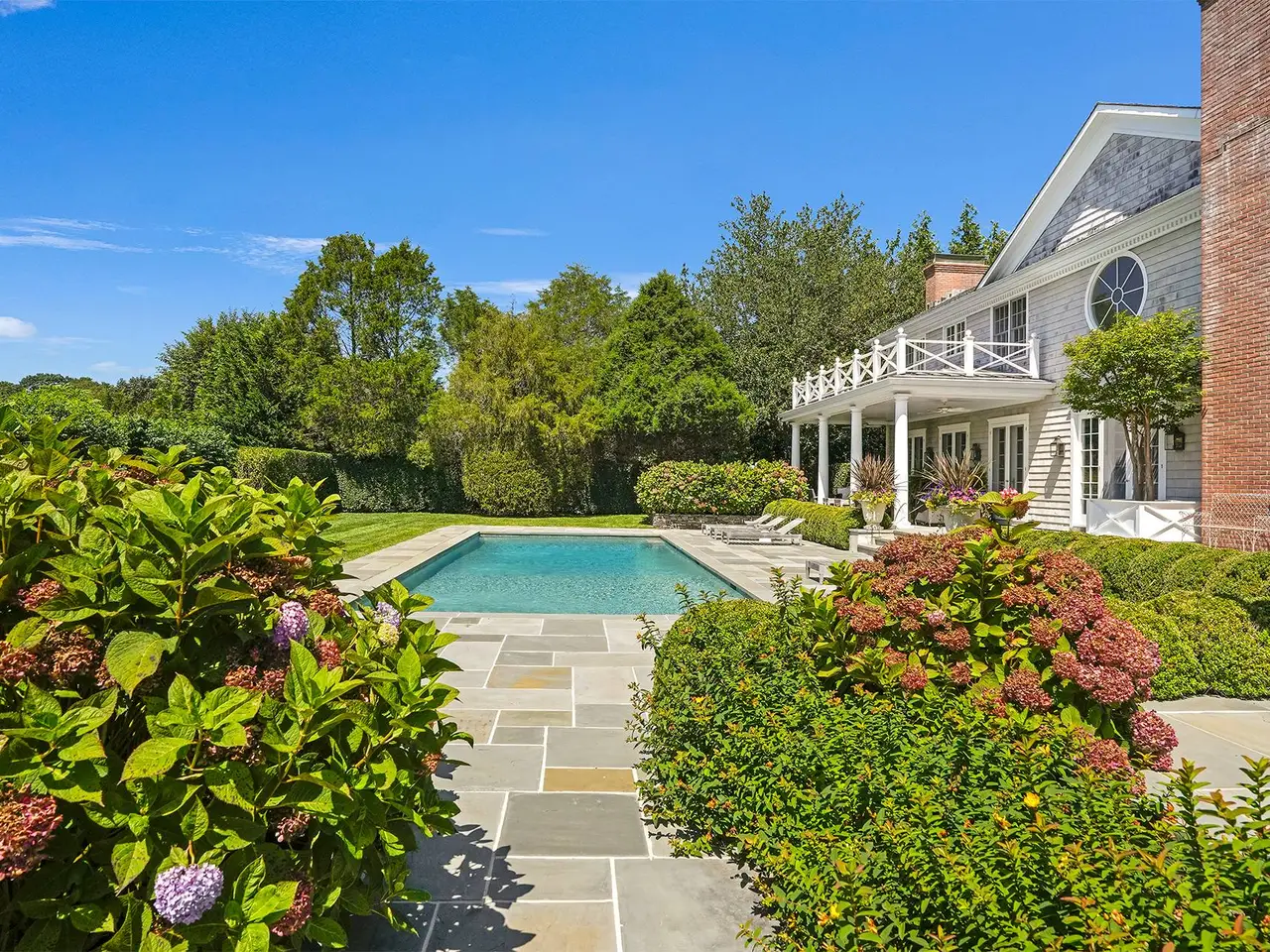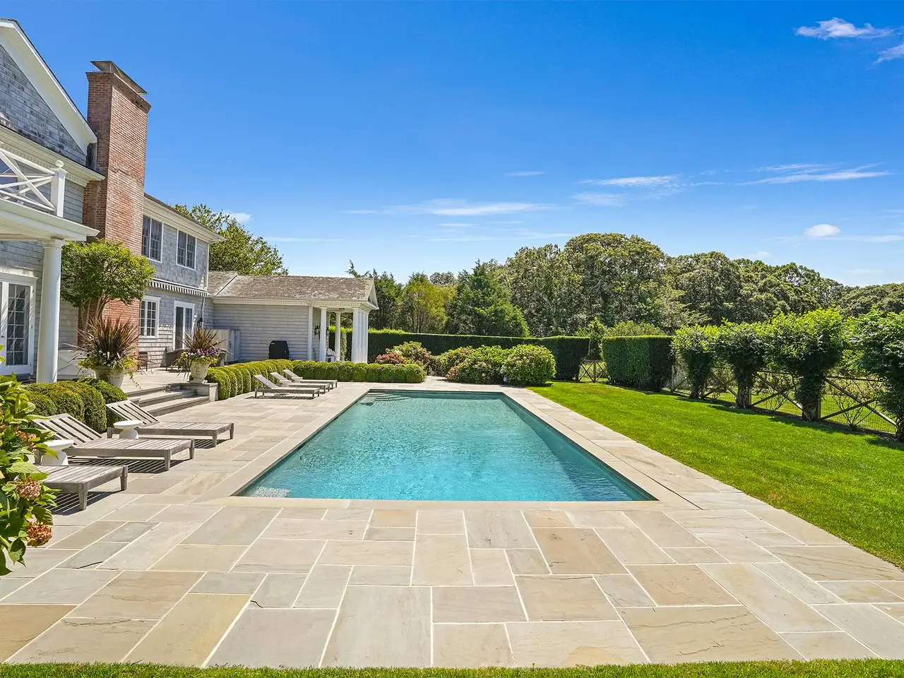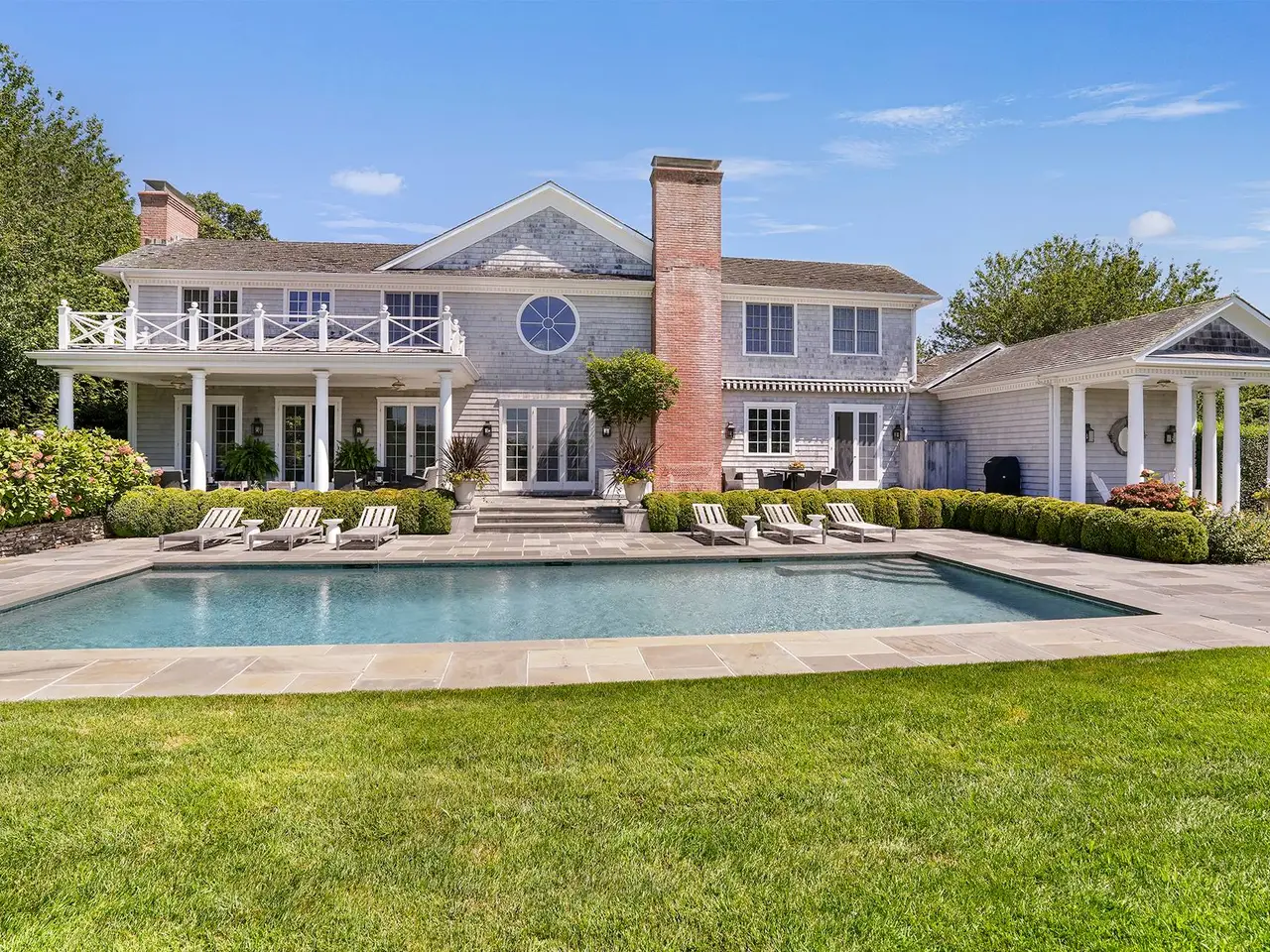 This elegant 3,000 sq. ft. traditional, designed by acclaimed interior designer Larry Laslo, combines contemporary comfort with refined architectural detail. The home's clean lines, sophisticated palette, and Hollywood Regency accents create a residence that is both stylish and welcoming. The main level features a formal entry with a striking black-and-white checkerboard floor, leading into a spacious living room, dining area, and kitchen. Eleven-foot ceilings, substantial crown moldings, and a double-height foyer with a grand staircase contribute to the home's impressive scale. The upper level is thoughtfully laid out with a private primary suite on one wing and a guest suite plus study/library on the other. The study is designed for versatility, offering a convertible option for additional overnight accommodations. A marble laundry room completes the interiors. South-facing principal rooms provide abundant natural light and open views across a wide field. Outdoor amenities include a heated gunite pool, bluestone patio, and covered porch, offering multiple areas for entertaining and summer living. Conveniently located just minutes from East Hampton Village, the property is close to shopping, galleries, dining, theaters, and beaches. Listing ID: 743623