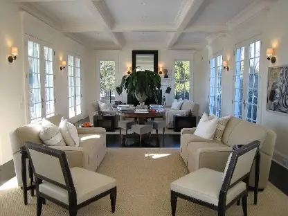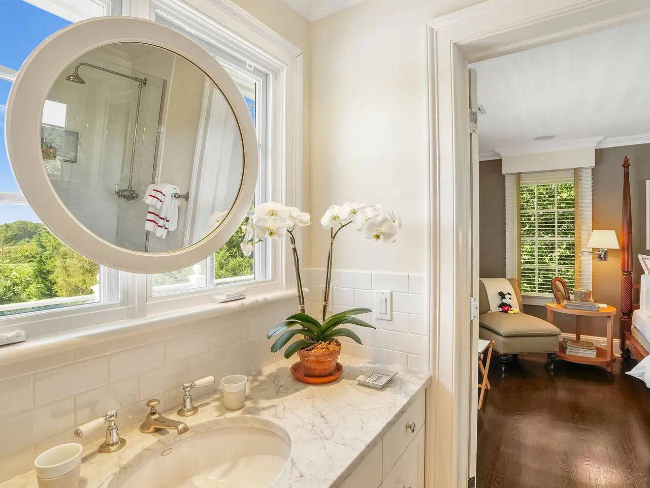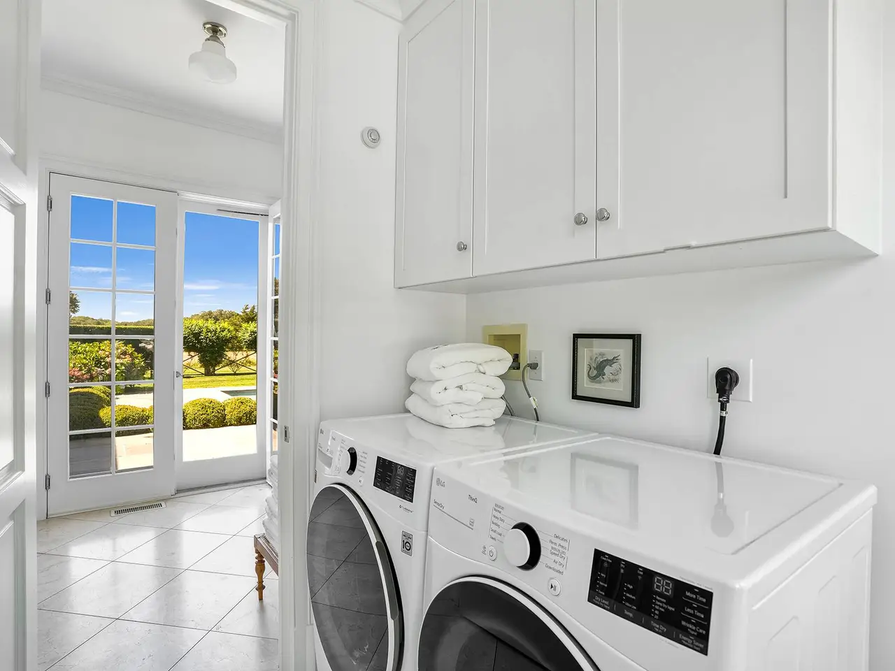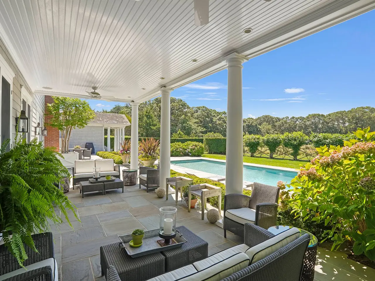 This elegant 3,000 sq. ft. traditional, designed by acclaimed interior designer Larry Laslo, combines contemporary comfort with refined architectural detail. The home's clean lines, sophisticated palette, and Hollywood Regency accents create a residence that is both stylish and welcoming. The main level features a formal entry with a striking black-and-white checkerboard floor, leading into a spacious living room, dining area, and kitchen. Eleven-foot ceilings, substantial crown moldings, and a double-height foyer with a grand staircase contribute to the home's impressive scale. The upper level is thoughtfully laid out with a private primary suite on one wing and a guest suite plus study/library on the other. The study is designed for versatility, offering a convertible option for additional overnight accommodations. A marble laundry room completes the interiors. South-facing principal rooms provide abundant natural light and open views across a wide field. Outdoor amenities include a heated gunite pool, bluestone patio, and covered porch, offering multiple areas for entertaining and summer living. Conveniently located just minutes from East Hampton Village, the property is close to shopping, galleries, dining, theaters, and beaches. Listing ID: 743623