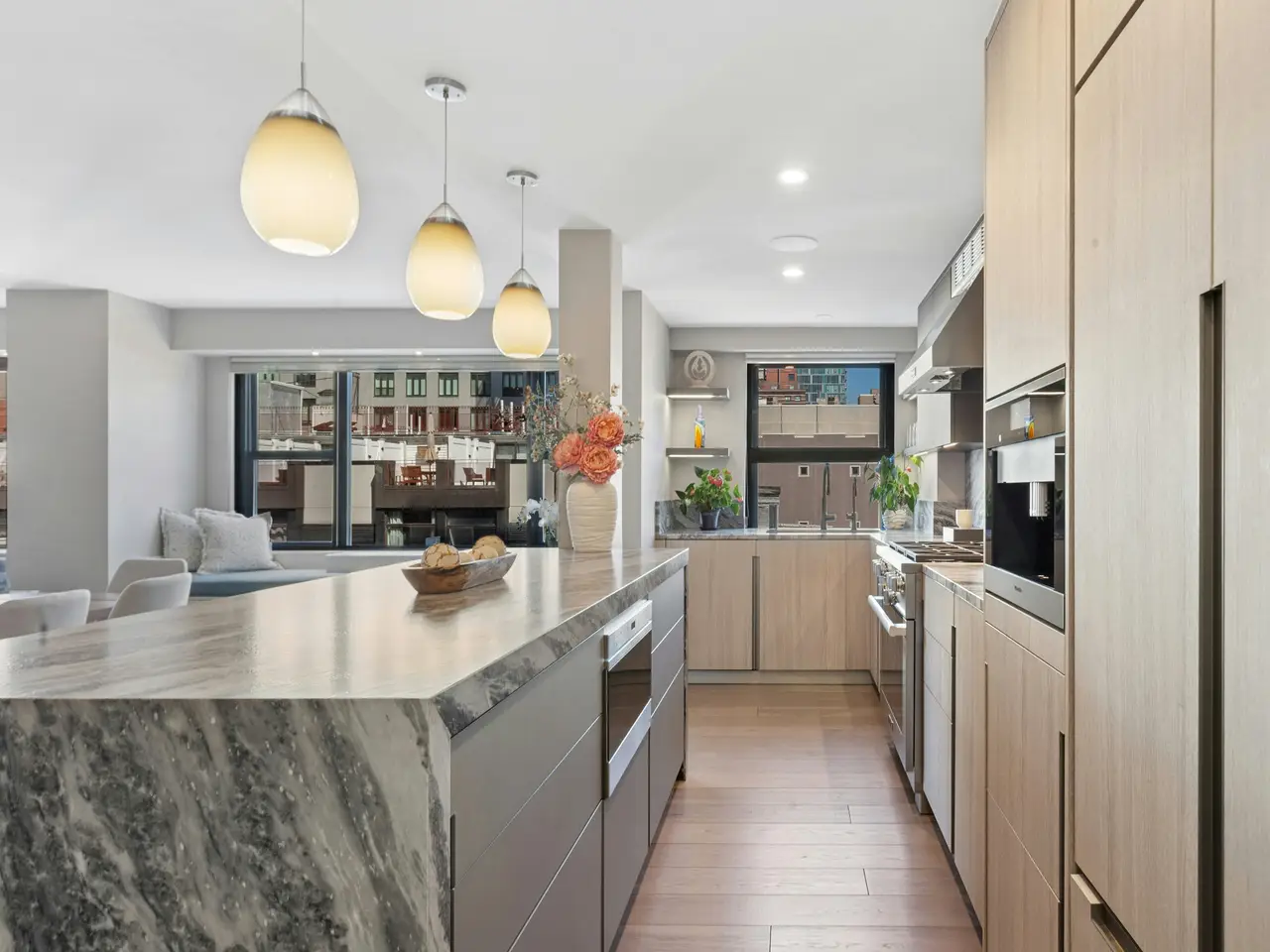 Experience expansive living and refined design in this beautifully renovated two-bedroom, three-bath residence, set within one of the Village's most sought-after full-service co-ops-The St. Mark. This impressive home is the product of a thoughtful transformation from a three-bedroom layout into an airy, open-concept space perfect for both everyday living and entertaining. A formal entry leads into a sweeping great room, where a wall of north-facing windows, a custom window seat, and expansive art walls create a serene and stylish ambiance. The chef's kitchen is a true showpiece, outfitted with sleek Italian Cucine Composit cabinetry, luxurious quartzite countertops and backsplash, and top-of-the-line appliances including a Miele gas range, dishwasher, built-in coffee system, a Sub-Zero French door refrigerator, and a Wolf microwave. A large picture window, The Galley sink, and a ZIP hot/cold/carbonated water system enhance functionality, while a dramatic waterfall island with designer pendant lighting anchors the space. A windowed guest bathroom featuring a soaking tub and shower completes the main living area with sophistication and charm. The exceptional primary suite features a king-sized bedroom with southern exposures, a spacious closet, and a large windowed laundry room with a stacked Miele washer-dryer and abundant built-in storage. The en-suite bath is a spa-like retreat with floor-to-ceiling Calacatta Gold and Bardiglio marble, a custom double walnut vanity, an oversized walk-in rain shower, and a Toto Neorest toilet. The second bedroom suite offers generous closet space and a renovated bathroom with a rain shower. Additional highlights include wide-plank hickory flooring, two walk-in closets, custom PTAC built-ins with added storage, and integrated Sonance speakers throughout the living room, kitchen, and primary suite for elevated comfort and convenience. The St. Mark is a meticulously maintained white-brick co-op. Residents enjoy 24-hour doorman and live-in resident manager service, central laundry, a playroom, storage, bike room, and direct-access on-site parking. Pets, 75% financing, and gifting are permitted with board approval. Please note: pieds- -terre, co signers, and co-purchasing are not allowed. A capital assessment of $289.50/month through December 2025 is for capital funding projects. Situated in one of Manhattan's most dynamic neighborhoods, you'll find world-class dining, shopping, and nightlife nearby. From Michelin-starred restaurants to buzzing caf s and bars, entertainment abounds. Tompkins Square Park, Washington Square Park, and Union Square are all nearby, along with Wegmans, Trader Joe's, Whole Foods, and high-end boutiques. NYU, Cooper Union, and top cultural venues like Webster Hall and Irving Plaza are just minutes away. Transit is a breeze with the N/Q/R/W, 4/5/6, L, PATH, multiple bus routes, and CitiBike stations all within close proximity.