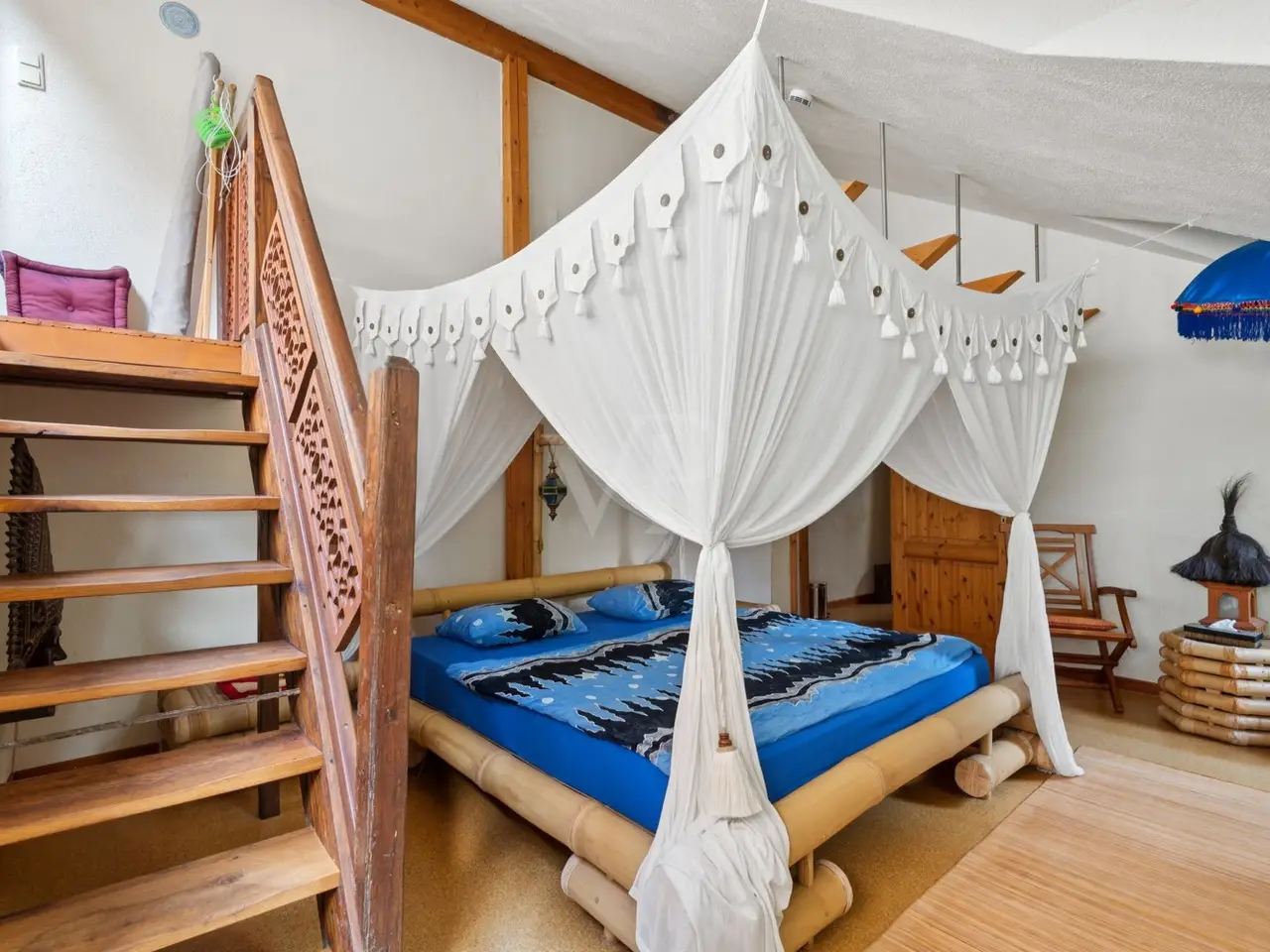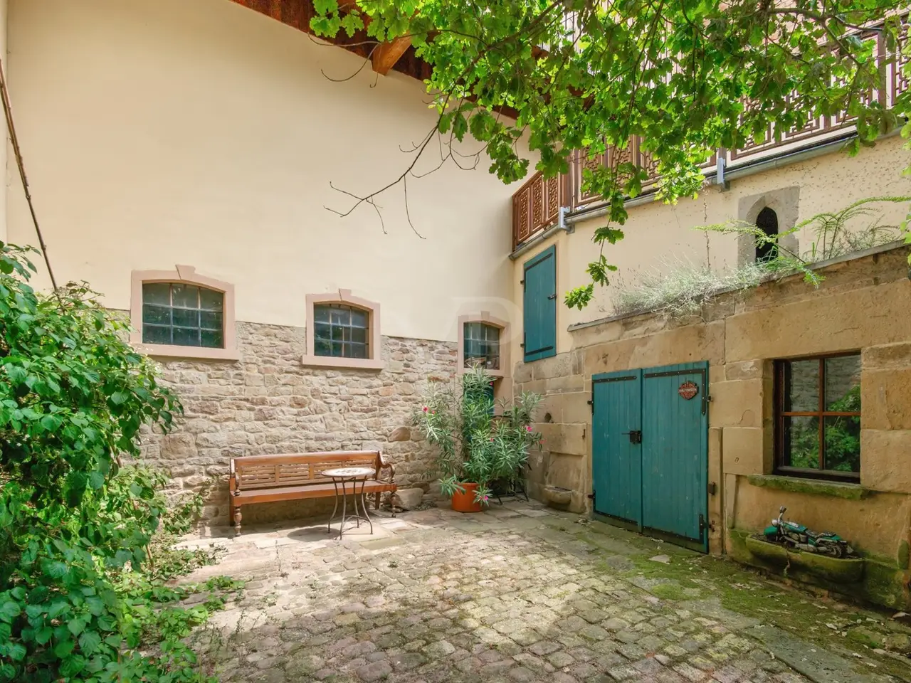 The property on offer here, in the form of a listed 3-sided farmhouse, combines Rhine-Hessian history with modernity as well as a high quality of living and working in a quiet yet very well connected location in an incomparable way. The property, which was first mentioned in the church records of the Eberbach monastery in 1591, consists of a main house with a first floor apartment with a private terrace for personal use, with individual guest and hotel rooms including bathrooms on the upper and top floors, as well as a hotel kitchen, a breakfast room and a training room on the top floor with a view over Eckelsheim. There is also an apartment building opposite in the courtyard with three apartments of different sizes, each equipped with a kitchenette, bathroom, dining and sleeping area. The top floor apartment also has a roof terrace. If this space is still not enough for you, the two adjoining barns offer plenty of scope for further expansion on the ground and top floors. This constellation offers future owners all kinds of living and usage options. Whether multi-generational, live and work, live and rent, commercial, Airbnb, bed and breakfast or as a complete investment, all of these can be combined and implemented here. The farmstead was completely renovated in 1990 and has been continuously expanded. Great importance was attached to the historical character and the building biology aspects using clay plaster, cellulose and wood fiber insulation. From an energy point of view, efficient condensing boilers powered by liquid gas with solar hot water support have been installed. The service water is supplied by a professional system from a 12 m³ cistern. After entering the property through the archway into the cobblestone courtyard with its old trees, you immediately feel at ease, unseen and at home. It immediately slows you down from a stressful everyday life. Once you have found your way around, you will be surprised that such a courtyard and building ensemble, which has been renovated with so much attention to detail, refurbished and well maintained, is so inconspicuous in the middle of an old village center. The individual guest rooms and apartments are all individually designed and have an Asian touch and cultural elements. An equally important aspect for future owners is the fact that no fundamental renovations are pending. Exceptions to this are the further expansion areas in the barns. You will find a detailed breakdown of all other conversions of the individual buildings over time, as well as the floor plans, under "Features, details" and "Layout". You are welcome to view this exclusive property on site and let the details speak for themselves.