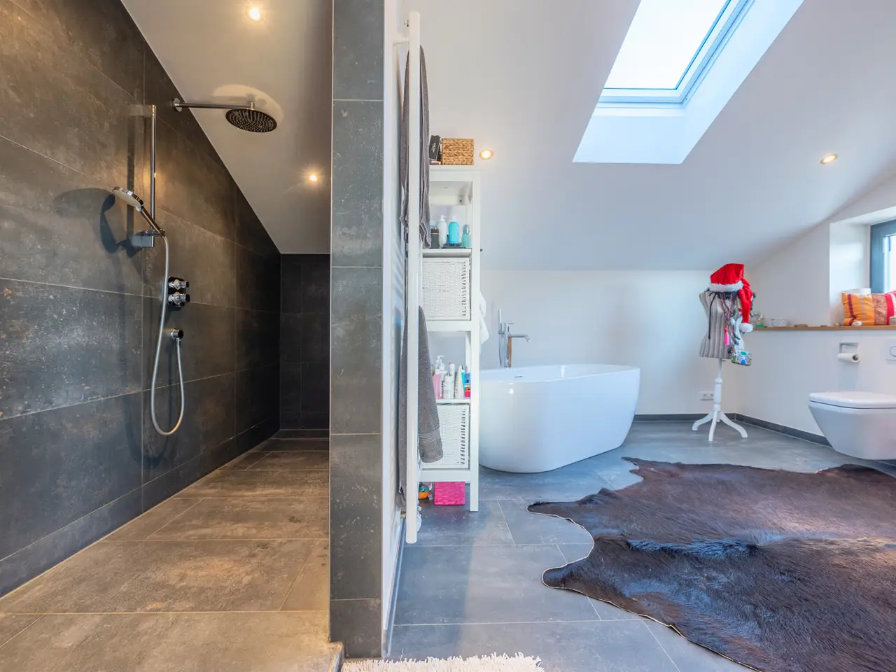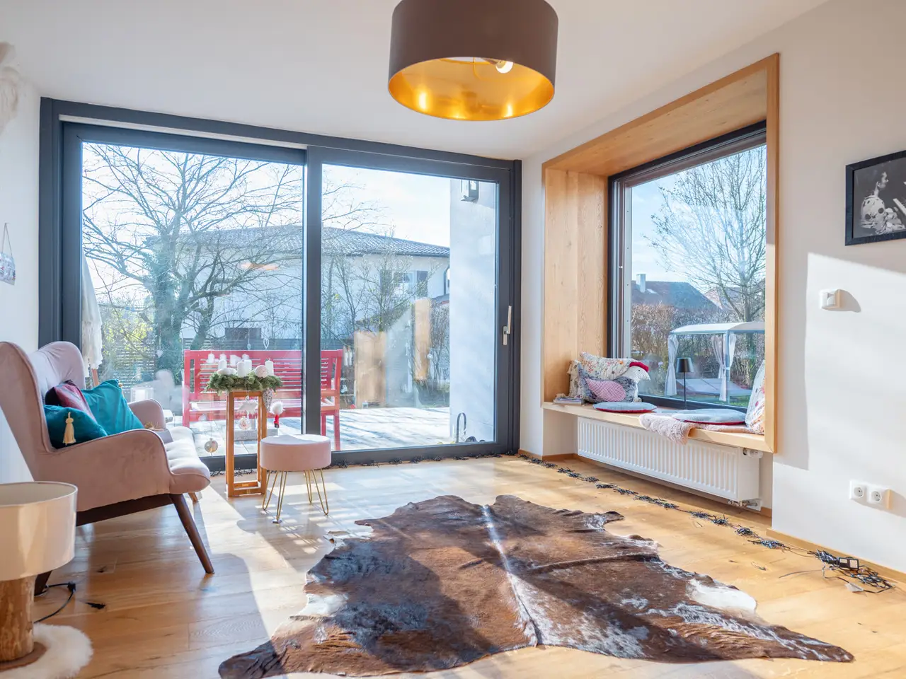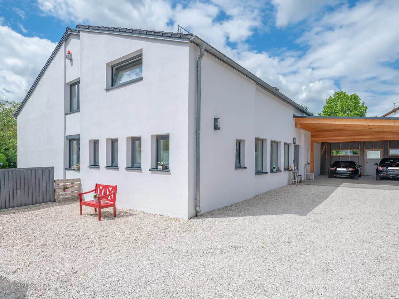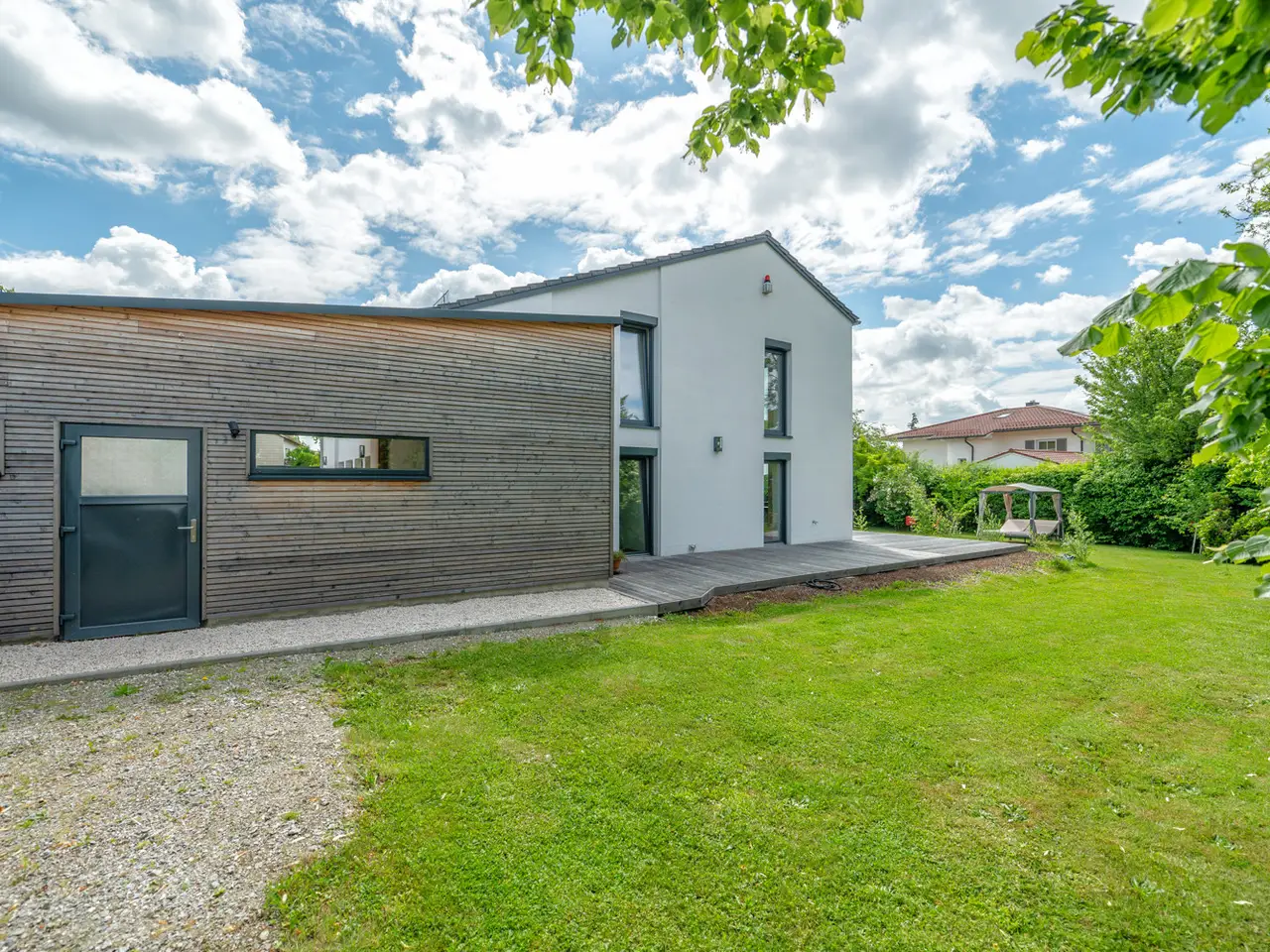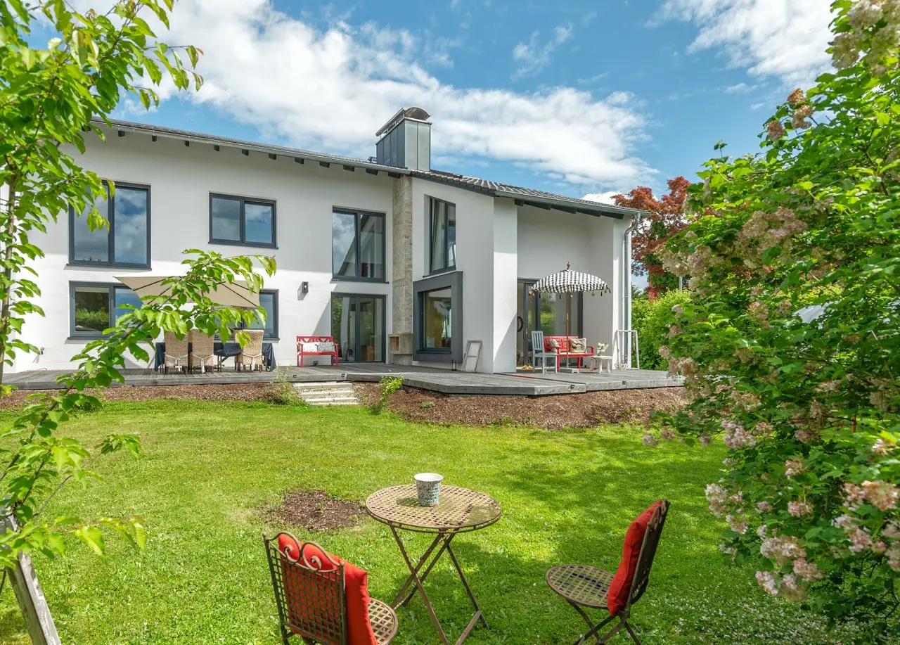For sale is a high-quality renovated detached house with a spacious granny apartment that combines modern living with timeless elegance. The property, built in 1961, was extensively renovated in 2022 and is situated on a spacious plot of approx. 1209 m² in a sought-after and central location in Eggenfelden. With a living space of approx. 250 m², spread over a total of 9 rooms, the house offers plenty of space for a variety of uses. The first floor welcomes you with an inviting and representative foyer, which impresses with an open staircase in solid oak. The open-plan living and dining area of approx. 45 m² impresses with real oak parquet flooring and large window fronts that offer a generous view of the mature garden. From here, you can access the spacious terrace of around 100 m² with an outdoor fireplace. The terrace is planked with extra-thick larch wood and extends over the entire south and west side of the house. The modern fitted kitchen meets all requirements and is equipped with an induction stove, a Bora extractor fan, a dishwasher and a solid oak worktop. A guest WC completes the space available in the main living area on this level. On the upper floor, a gallery leads to the bedrooms. The master bedroom not only offers plenty of space on approx. 35 m², but also its own en-suite master bathroom with natural light, free-standing bathtub, separate floor-level shower area, double washbasin, WC and electric underfloor heating. Two further rooms, which are ideal as guest or children's rooms, as well as a separate dressing room and an additional shower room complete the upper floor. High-quality details such as refurbished solid oak parquet flooring and electrically operated skylights underline the high standard. The granny apartment on the first floor with separate entrance extends over approx. 70 m² and offers two rooms, a fitted kitchen and a bathroom with shower and electric underfloor heating. This unit is ideal as a practice, office or guest apartment. From here you also have access to the spacious garden, which offers numerous design options. The basement of the house, which has separate access, houses a wine cellar as well as several storage rooms. A carport with space for two cars and additional parking spaces in the driveway are available for vehicles. A modern balcony power plant on the carport supports the energy efficiency of the property, which is rounded off by a new pellet heating system and a decalcification system. This property combines modern living comfort with a well-thought-out room layout and high-quality fixtures and fittings. The central yet quiet location in Eggenfelden, just a 5-minute walk from the town square, offers an ideal combination of urban infrastructure and living close to nature. A viewing is essential to discover the full potential of this special home. Make an appointment today to see this unique offer for yourself.