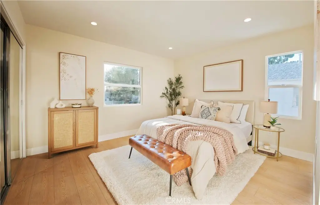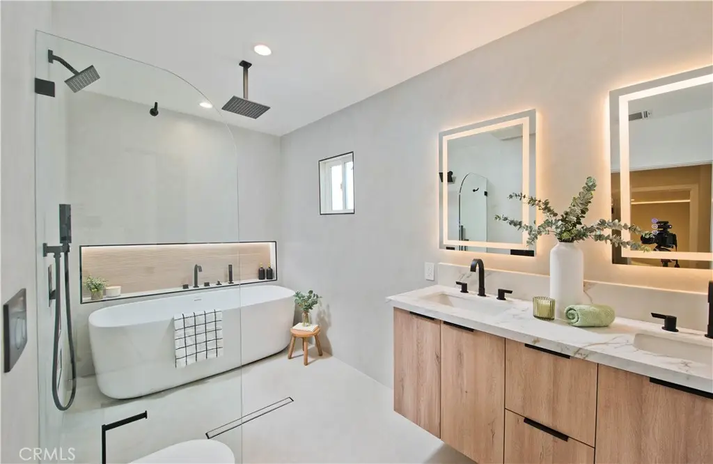 Welcome to 5864 Jamieson Ave, a stunning 3-bedroom, 3-bathroom home that has been reimagined & expanded to 1,993 sqft. Step onto the inviting front porch where modern design meets natural warmth. Vertical wood slat siding paired w/ sleek black accents creates eye-catching curb appeal, while elegant lighting adds a touch of sophistication. Inside, the oversized living room provides ample space for both relaxation & entertainment. Ambient LED lighting lets you set the perfect mood. At the heart of the home is a showstopping modern kitchen featuring an oversized marble waterfall island w/ seating for four—ideal for entertaining or casual meals. Two-tone cabinetry combines glossy white uppers & warm wood lowers for a clean, contemporary look. Stainless steel appliances, including a gas range & built-in hood, are seamlessly integrated. Striking pendant lights, recessed lighting, & natural window light keep the space bright & open. Adjacent, the elegant dining area features a custom vertical slat accent wall in a soft neutral tone, adding architectural interest. A hidden pantry offers sleek storage beyond the already generous cabinetry. Light wood floors flow throughout, complemented by recessed lighting & large sliding glass doors that open to the outdoor space, filling the home w/ natural light. The primary suite is a private retreat with its own spa-like bathroom, walk-in closet, & direct access to the deck & pool. The bathroom features a floating dual vanity with natural wood cabinetry, marble countertops, & LED mirrors. An oversized walk-in shower with a frameless glass enclosure & rainfall showerhead pairs beautifully with a freestanding soaking tub beneath a recessed accent shelf with ambient lighting. Matte black fixtures & large-format tile flooring complete the look. A spacious secondary bedroom & designer bath sit tucked into their own private wing. On the opposite side of the home, a secondary suite offers ideal guest accommodations, w/ its own access to the deck via sliding glass doors. The stylish en-suite includes a large shower, designer vanity, & LED mirror. Outside, an expansive deck offers space to relax & entertain beside the sparkling pool. A generous grassy area is perfect for play, with a large shed to keep things tucked away. Upgrades include fingerprint door access, wood slat accents, LED lighting, new roof, new AC, fully remodeled interior & exterior, laundry room for side-by-side units, direct garage access, Ecobee thermostat & more.