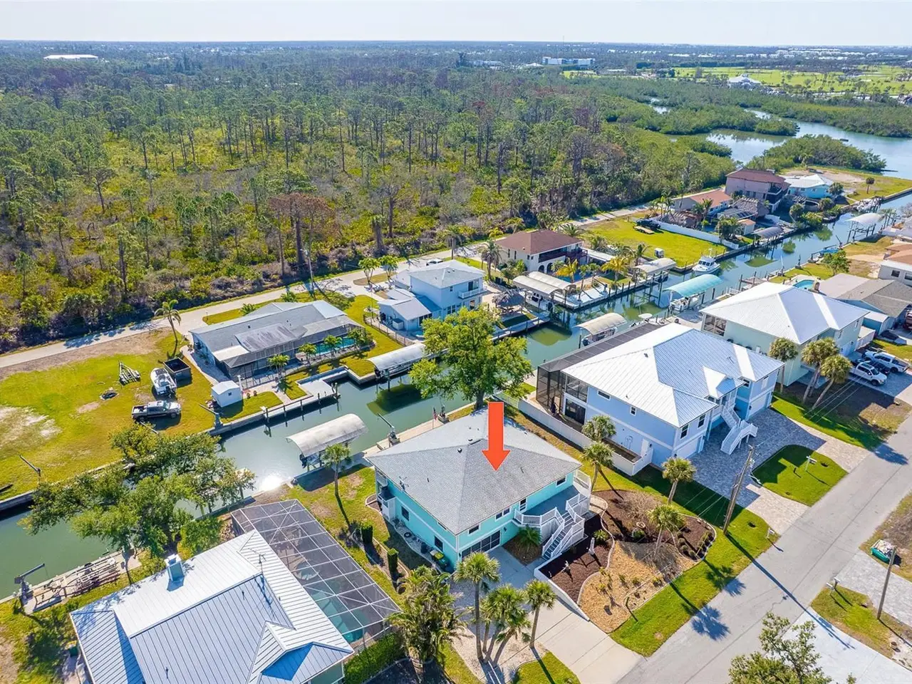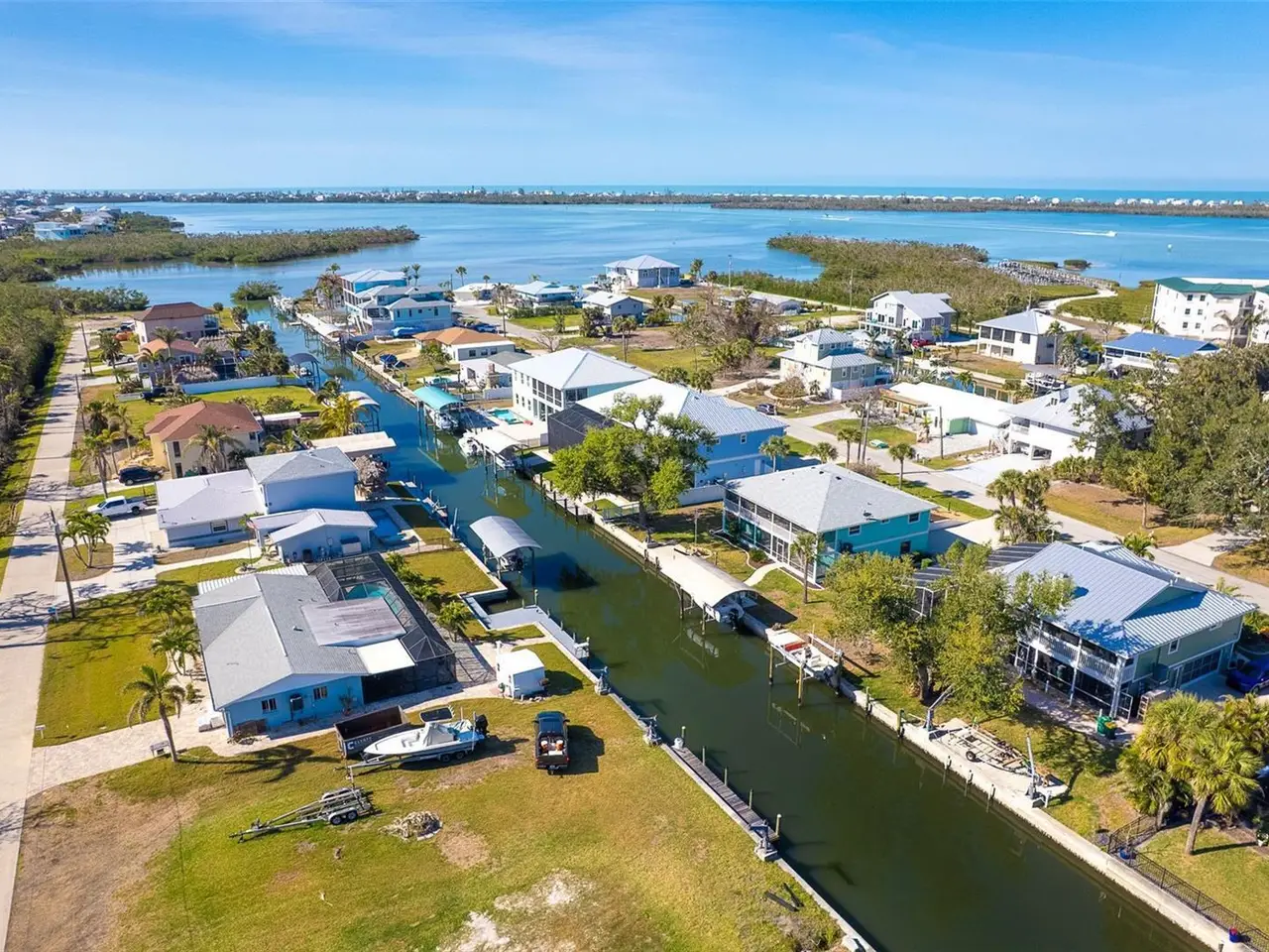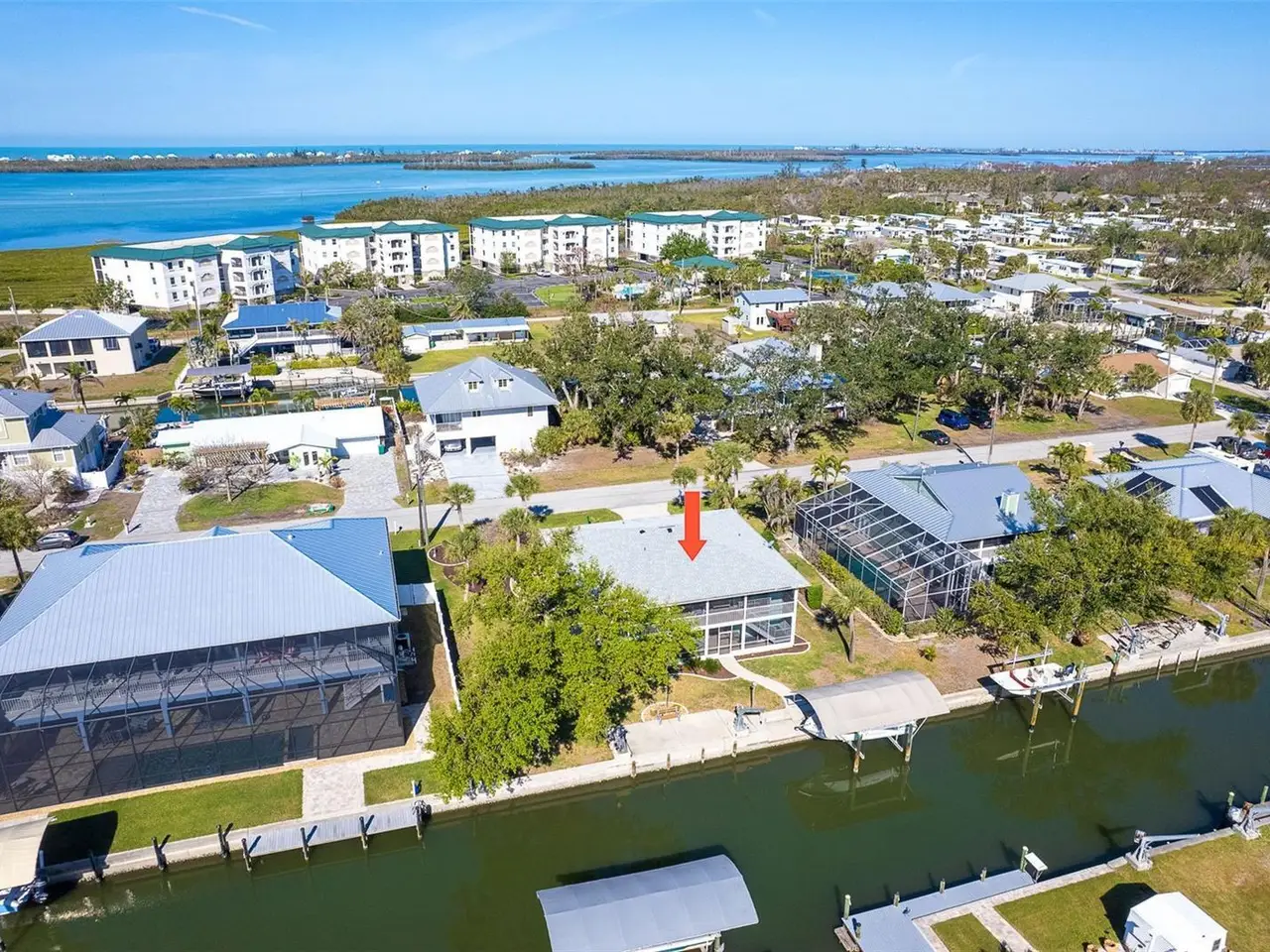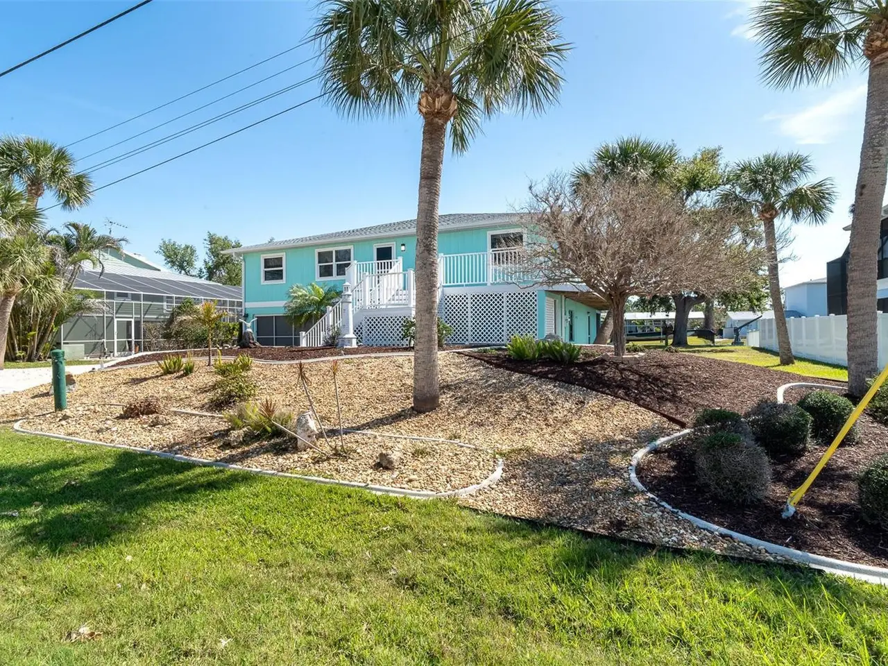 Waterfront Boatable Retreat with Deep Water Access & Stunning Views! Discover the ultimate coastal lifestyle with this elevated 3-bedroom, 2-bathroom home, perfectly situated on an oversized lot with 100 feet of water frontage. Boating enthusiasts will appreciate the sailboat-accessible deep water, a covered boat lift, a concrete seawall, and a dock with an extended concrete entertainment area - ideal for soaking up the Florida sunshine or hosting waterfront gatherings. Just minutes from the Intracoastal Waterway and the Gulf of Mexico, this property offers unparalleled convenience for those who love to explore by boat. Designed for peace of mind, this elevated home remained high and dry during storm season, with the first floor dedicated to a spacious garage and workshop area. Upstairs, the wraparound porch provides breathtaking sunrise and sunset views while offering a perfect spot to relax and enjoy the serene surroundings. Inside, the open and airy split floor plan welcomes you with a coastal-inspired ambiance and stunning water views from the spacious and open dining and great room area, where large sliding glass doors seamlessly blend indoor and outdoor living. The fully updated kitchen is a chef's delight, featuring granite countertops, stainless steel appliances, elegant glass-front cabinets, and ample storage with three pantries. A built-in desk with water views and a door leading to the lanai adds both function and charm. The primary suite is a tranquil retreat with double built-in closets, an ensuite bath with granite countertops, a walk-in shower, and a linen closet for added convenience. The guest bedrooms are equally impressive - one featuring a Murphy bed and sliding glass doors to the lanai, allowing for flexible use as a bedroom or home office, while the second oversized guest room includes a built-in closet and shares a guest bath with a tub/shower combo, granite countertops, and a linen closet. Enjoy dual screened-in lanais, with one upstairs and another on the lower level, providing multiple spaces to savor the waterfront views. Additional highlights include a 2023 roof, 2023 A/C unit, 2024 hot water heater, and 2024 refrigerator and microwave. The elevated A/C system is positioned at the top floor level for extra protection and peace of mind. Beautifully landscaped grounds and a screened garage add to the home's appeal. This exceptional property offers a rare opportunity to own a storm-resilient waterfront home that combines luxury, functionality, and breathtaking views. Schedule your private tour today and make this waterfront oasis your own!