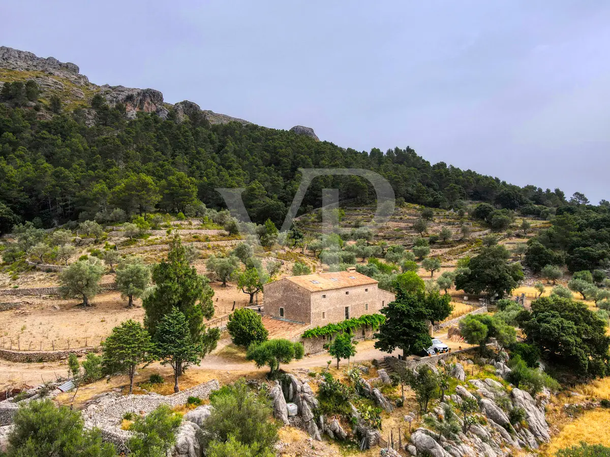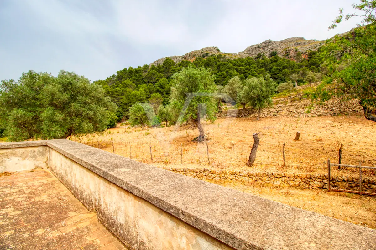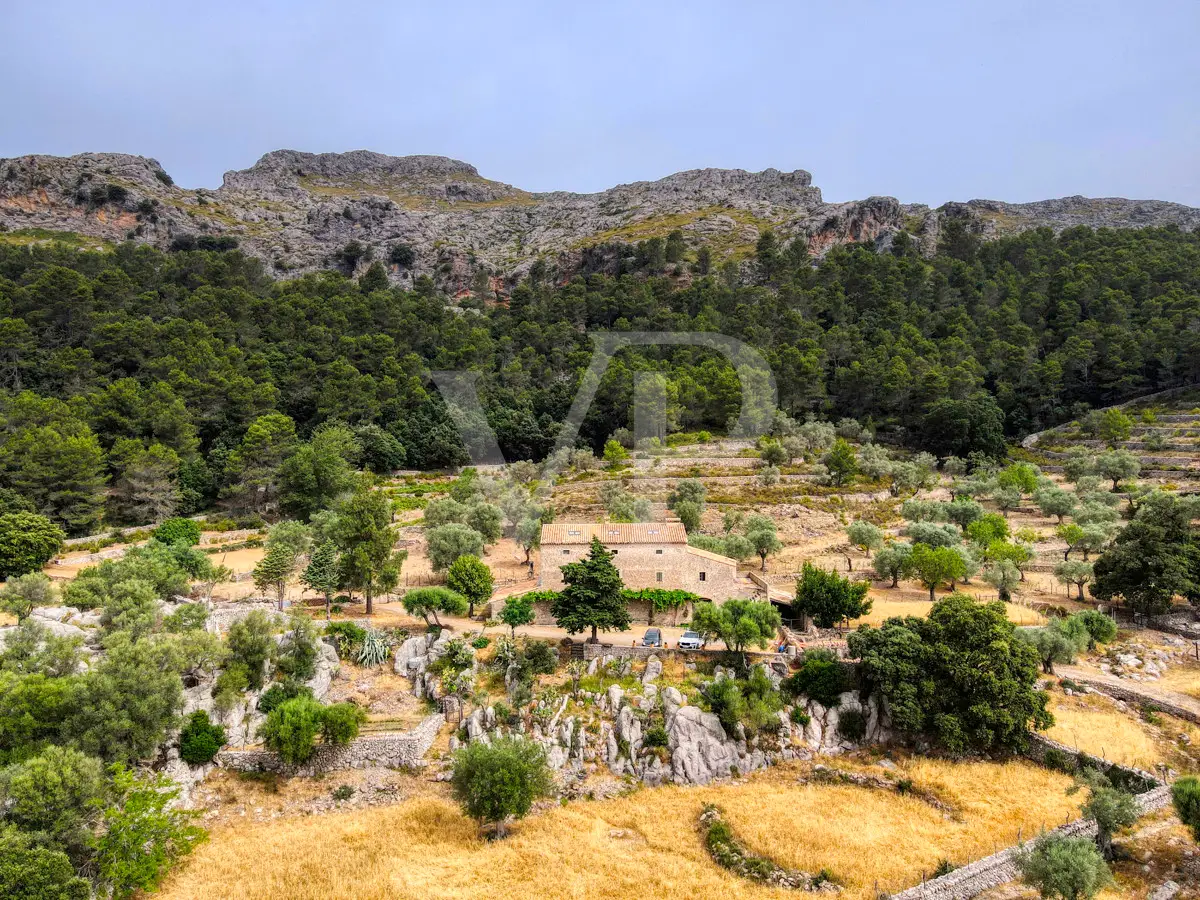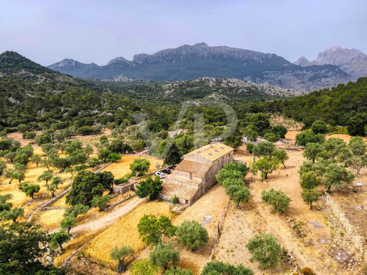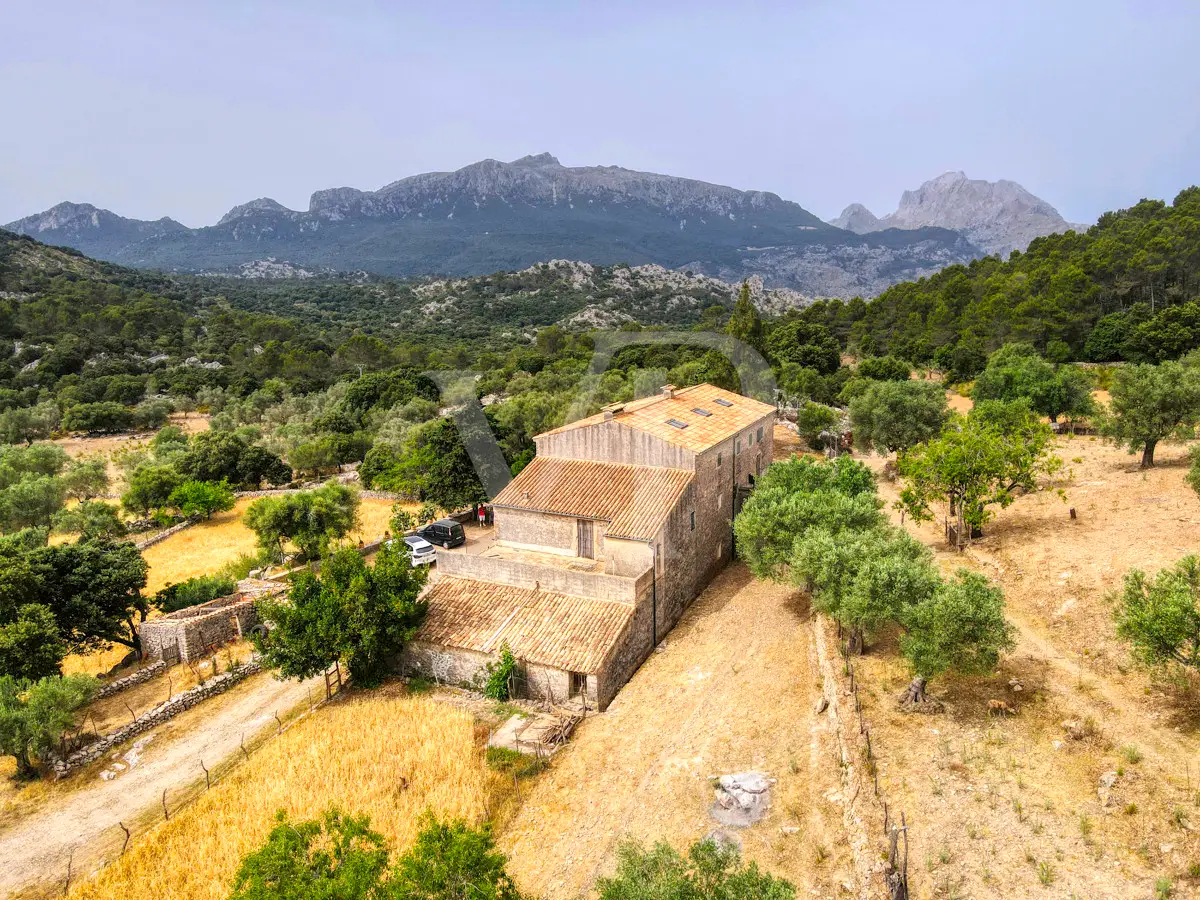For sale is this fantastic historic finca located on 80 hectares in the natural landscape of the Serra de Tramuntana in Escorca. The finca includes approximately 8 hectares of olive groves, 23 hectares of holm oaks, 4 hectares of almond trees, 27 hectares of scrubland and 3.8 hectares of farmland. The farm is certified with the designation "organic production", which has meant a long conversion period. The production of high quality and tasty oil, fantastic honey and sheep grazing helps to sustain the farm by taking advantage of its large extension. The houses of the old farm "Possessió" are located at an altitude of 500 metres above sea level and are over 700 square metres in size and spread over three floors. The ground floor consists of an entrance hall, an old kitchen with a large fireplace, a storage room, an annex with an old bread oven, another fireplace and a spacious living room, and another annex at the back used as a garage. There is also a small independent storage room. On the first floor, a long corridor distributes all its bedrooms, direct exit to a fantastic terrace, living room with fireplace, the old owners' kitchen, large pantry and the old bathroom. The upper floor consists of two large rooms with sloping ceilings, separated by thick walls. This property surprises not only by the dimensions of the construction, but also by the size of the plot and its location. The thick stone walls, high ceilings with original wooden beams and original terracotta tiles are exceptional. The property has electricity, two of its own water wells, a natural water source from the mountains, a "safareig" water deposit and the possibility to build another one. All this gives this finca an abundance of water. An ecological finca that is part of Mallorca's culture and history, nestled in a fantastic and unique setting.