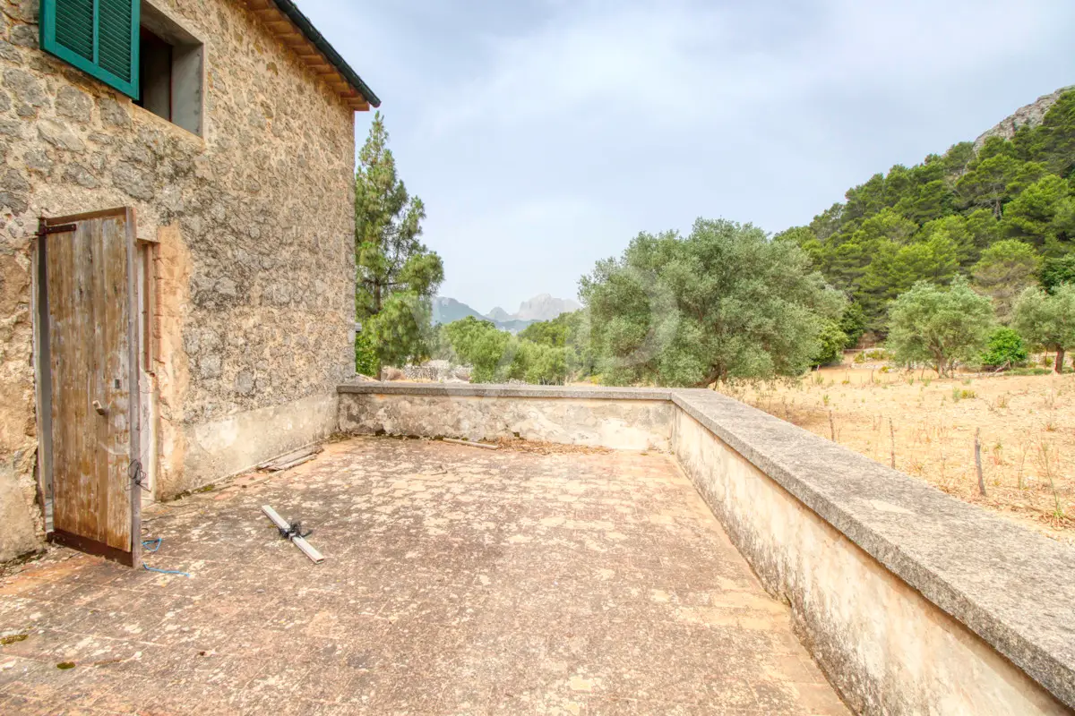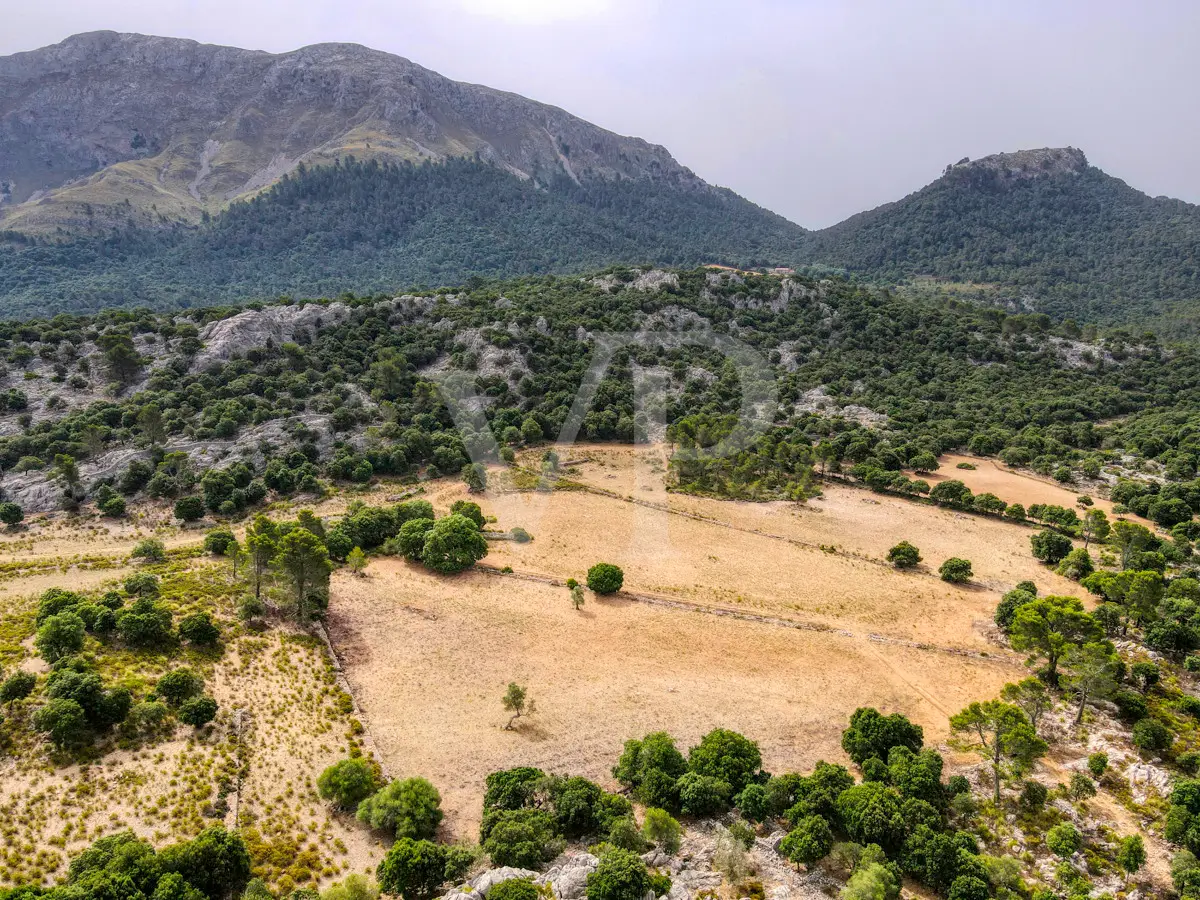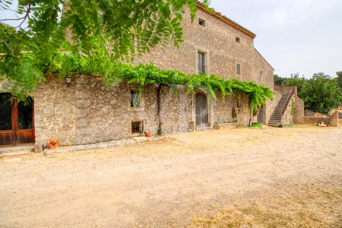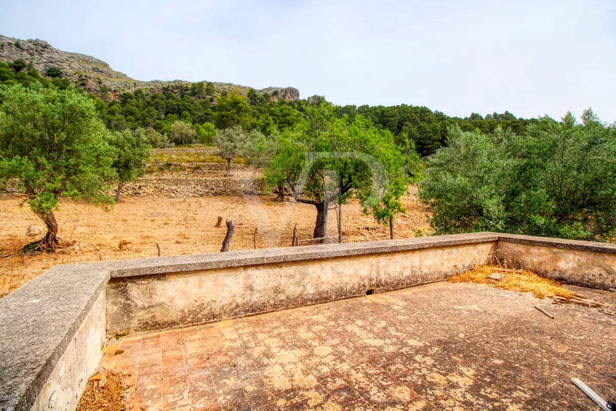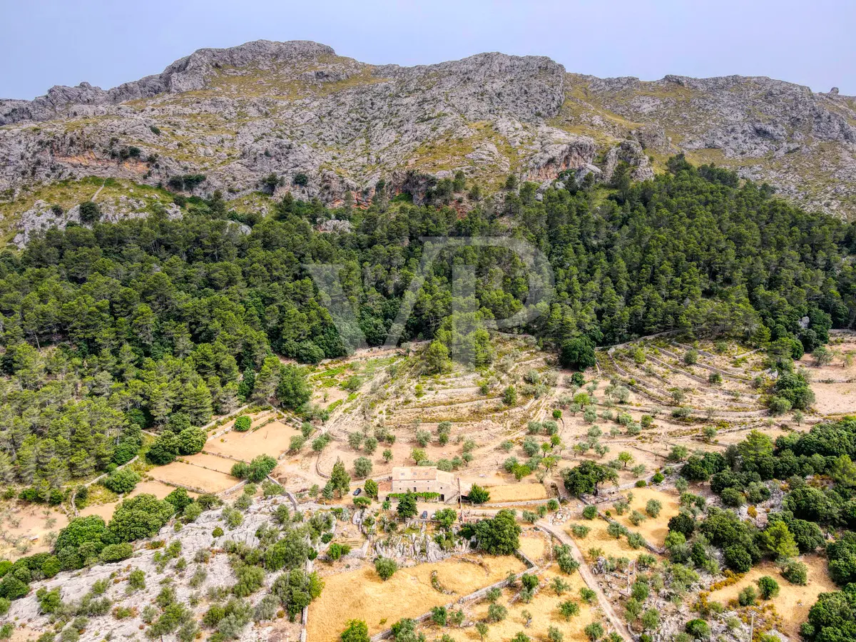 For sale is this fantastic historic finca located on 80 hectares in the natural landscape of the Serra de Tramuntana in Escorca. The finca includes approximately 8 hectares of olive groves, 23 hectares of holm oaks, 4 hectares of almond trees, 27 hectares of scrubland and 3.8 hectares of farmland. The farm is certified with the designation "organic production", which has meant a long conversion period. The production of high quality and tasty oil, fantastic honey and sheep grazing helps to sustain the farm by taking advantage of its large extension. The houses of the old farm "Possessió" are located at an altitude of 500 metres above sea level and are over 700 square metres in size and spread over three floors. The ground floor consists of an entrance hall, an old kitchen with a large fireplace, a storage room, an annex with an old bread oven, another fireplace and a spacious living room, and another annex at the back used as a garage. There is also a small independent storage room. On the first floor, a long corridor distributes all its bedrooms, direct exit to a fantastic terrace, living room with fireplace, the old owners' kitchen, large pantry and the old bathroom. The upper floor consists of two large rooms with sloping ceilings, separated by thick walls. This property surprises not only by the dimensions of the construction, but also by the size of the plot and its location. The thick stone walls, high ceilings with original wooden beams and original terracotta tiles are exceptional. The property has electricity, two of its own water wells, a natural water source from the mountains, a "safareig" water deposit and the possibility to build another one. All this gives this finca an abundance of water. An ecological finca that is part of Mallorca's culture and history, nestled in a fantastic and unique setting.