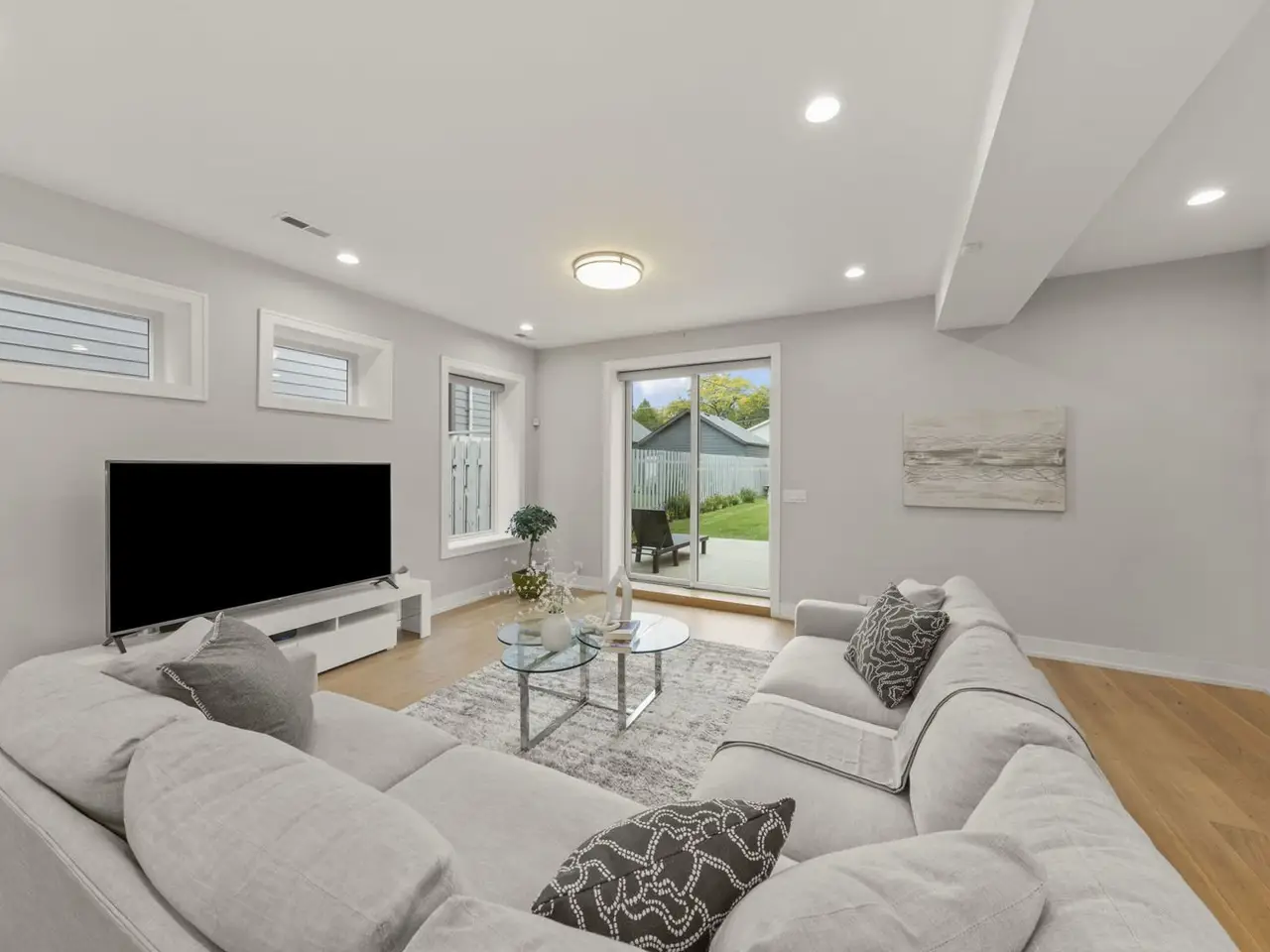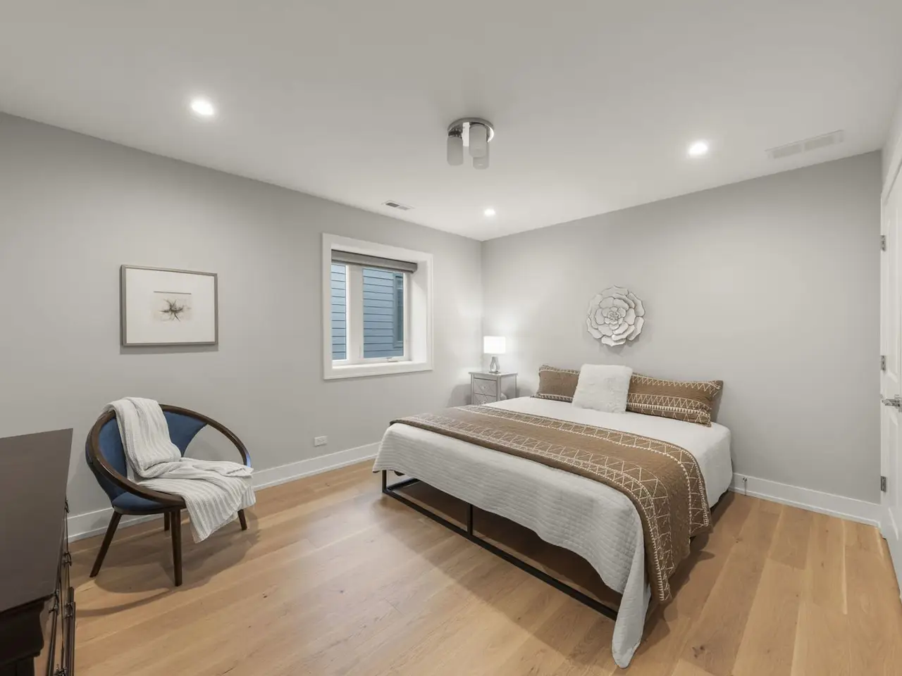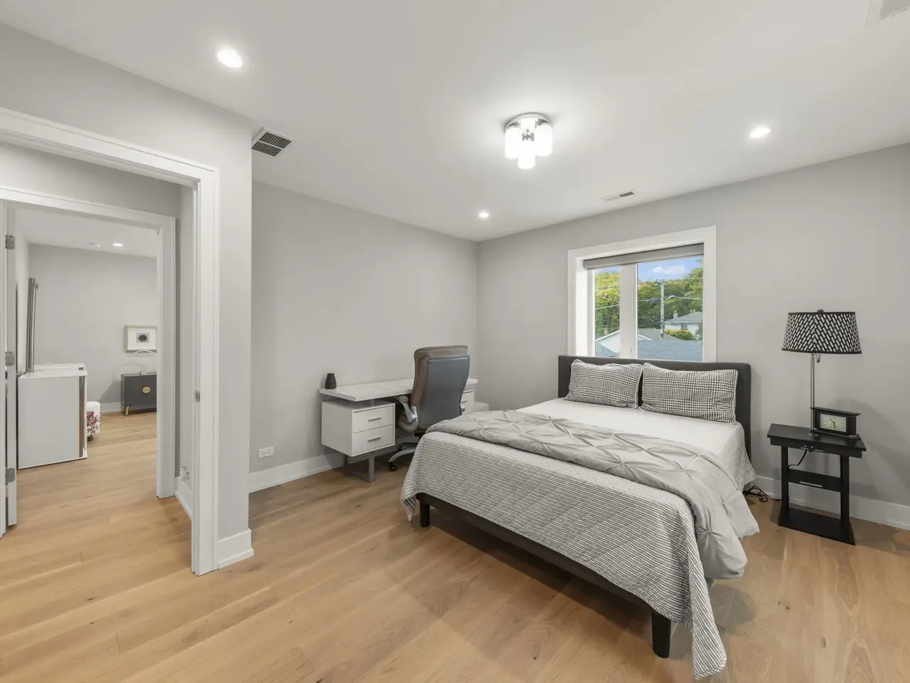 East-facing and beautifully designed, this exceptional home blends modern luxury with thoughtful functionality. Step inside to discover 6" wide hardwood plank flooring throughout and a stunning open-concept layout that flows effortlessly from the grand entryway to the expansive kitchen and family room. The chef's kitchen impresses with 42" cabinetry, a quartz waterfall island with open shelving, a wine fridge, overhead vent hood, and a gently textured subway tile backsplash. A walk-in pantry and spacious dining area make entertaining easy. The living room, family room and optional office/craft/bedroom ALL feature flexible layouts. Sliding glass doors provide access to the covered AND uncovered patio areas, overlooking an expansive flat yard-perfect for a playset, garden, or future pool. The fully fenced yard includes two gates, concrete walkways, and garden bed. Upstairs, find five bedrooms including a versatile ensuite with dual closets AND the primary en-suite offering a large walk-in with California Closet storage plus an additional flex room ideal as a nursery, prayer room, or second closet. The upper-level laundry room features Samsung washer/dryer, utility sink, and ample cabinetry. Every detail has been thoughtfully chosen including elevated-Hunter Douglas shades (automatic on the main level), Andersen windows with deep 14" sills, Nest thermostat, Vivint security system, Navien tankless water heater, and dual Trane HVAC. The three-car garage offers custom shelving and a Tesla charger that stays. Situated walking distance to schools, near Devon Market and close to the beach, this home delivers convenience, comfort, and cutting-edge design.