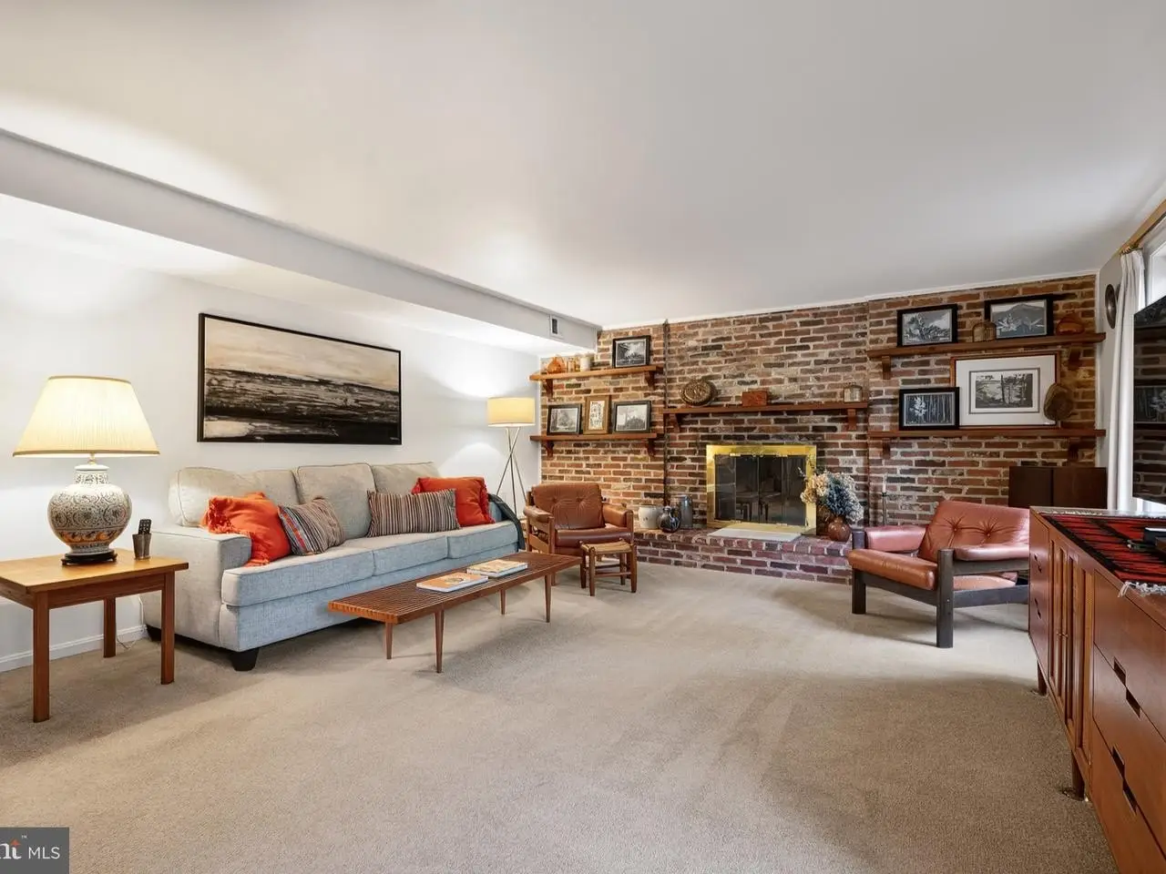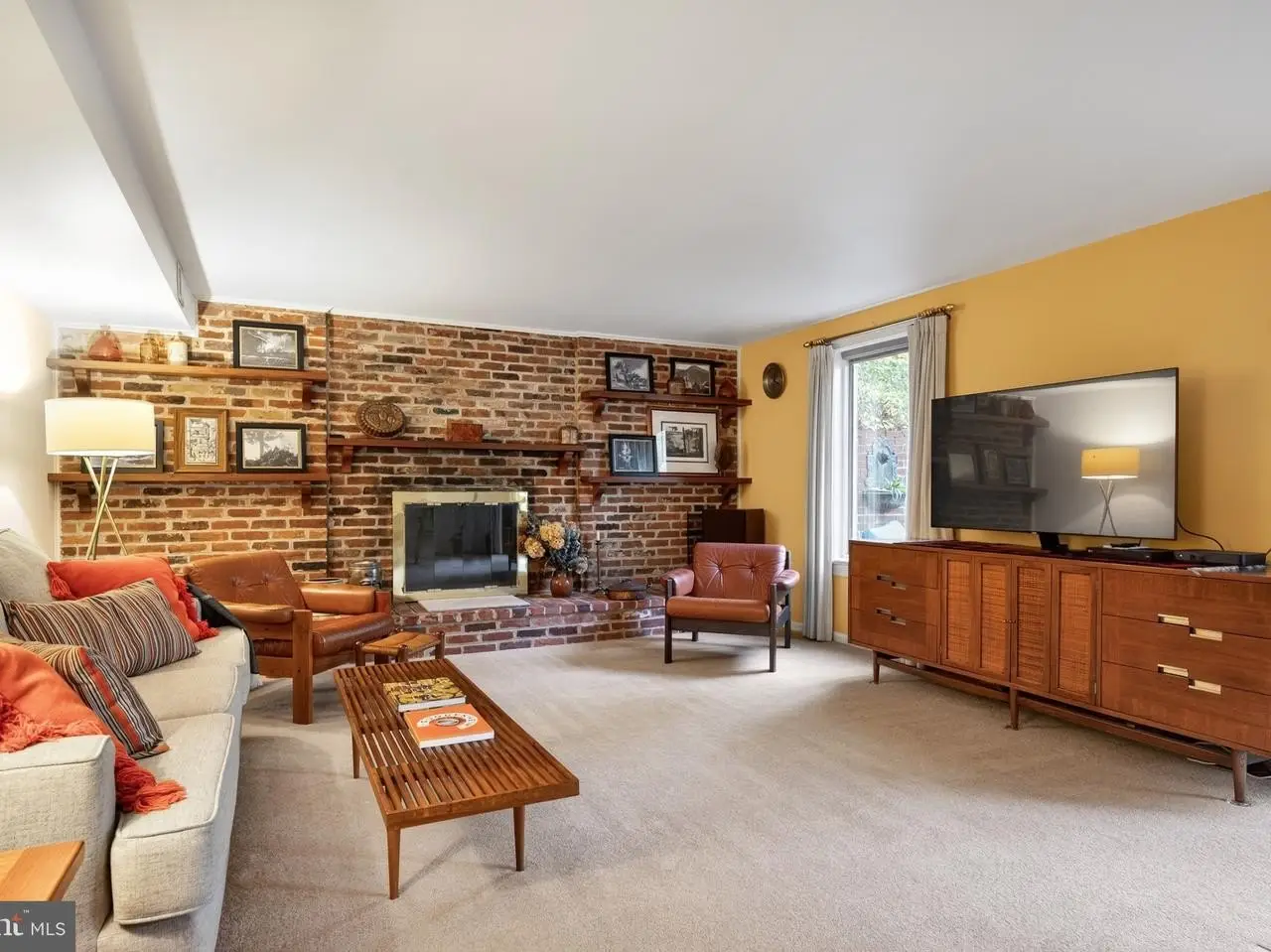 • Cozy fireplace with dramatic brick wall