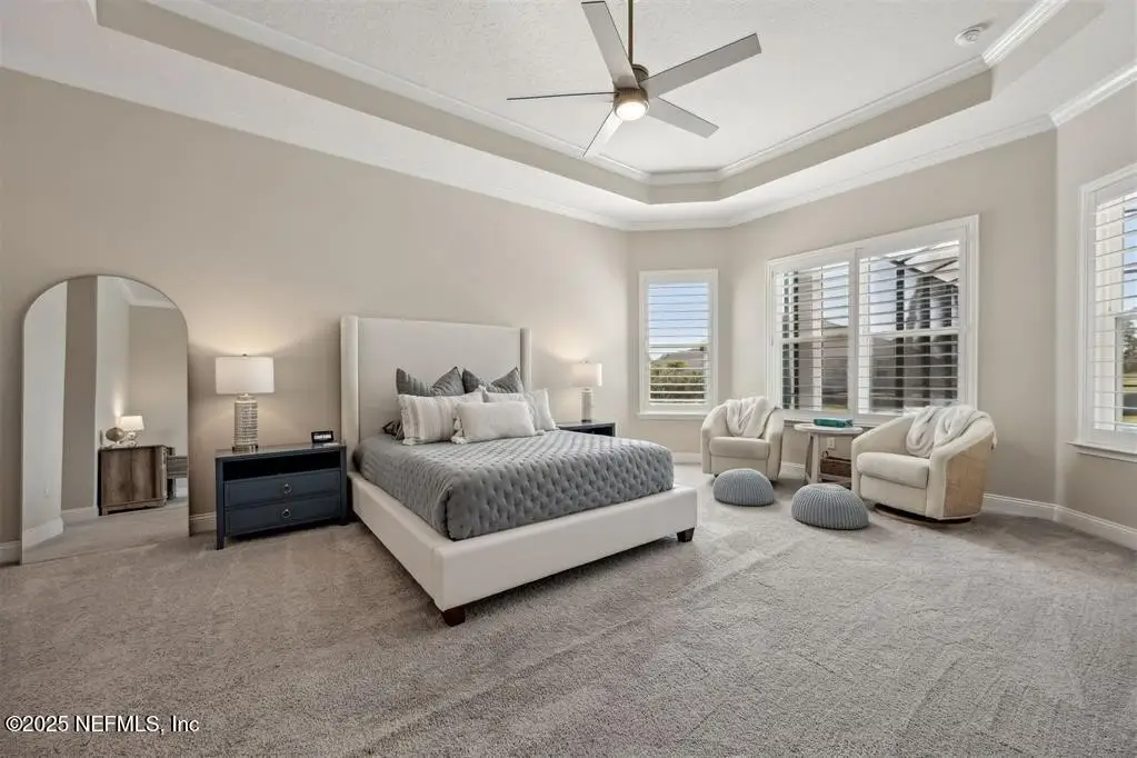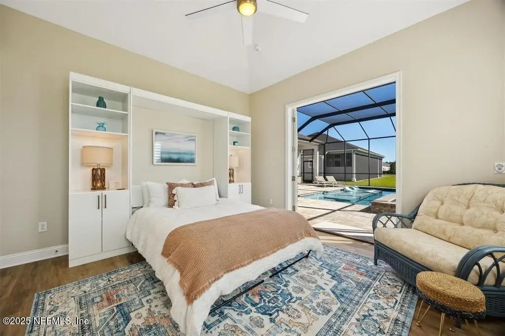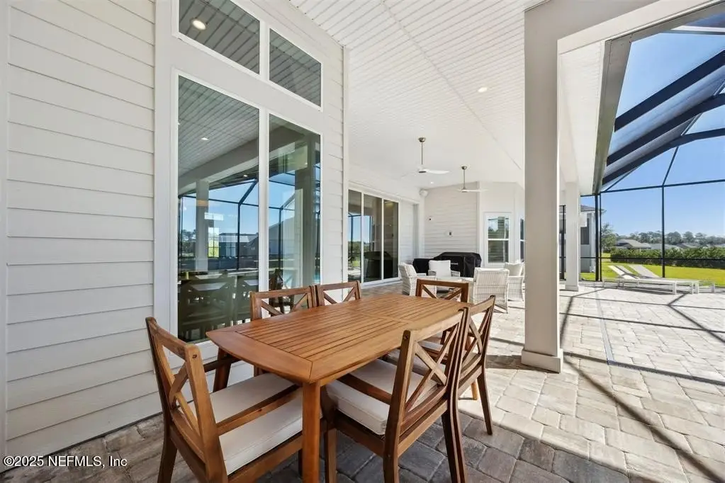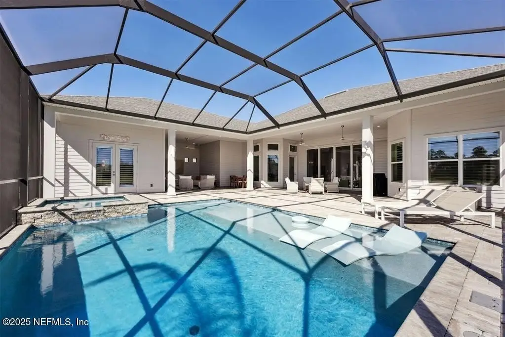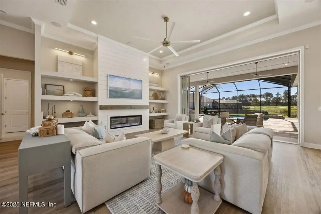 Step inside this stunning Egret V by ICI Homes, offering 4 bedrooms, 4.5 baths, and 3,395 sq. ft. of refined living space in Amelia National Golf & Country Club. A bright open layout features trey ceilings, a gas fireplace with custom built-ins, and waterfall sliders leading to a saltwater pool & spa overlooking the 15th green. The gourmet kitchen impresses with an island, breakfast nook, upgraded cabinetry, wine fridge, and hidden pantry. Each bedroom has its own en-suite bath, while the primary suite offers two walk-in closets and a spa-like bath. Additional highlights include a private office, casita with Murphy bed & full bath, and a three-car garage. Outdoor living shines with a screened lanai, grilling area, and heated spa-perfect for entertaining or relaxing in style. CDD paid off.