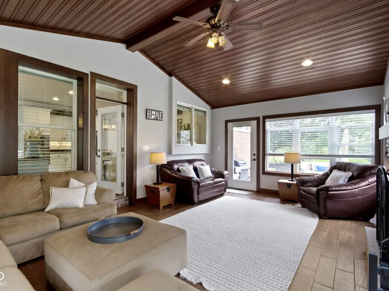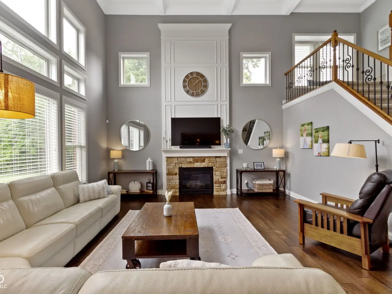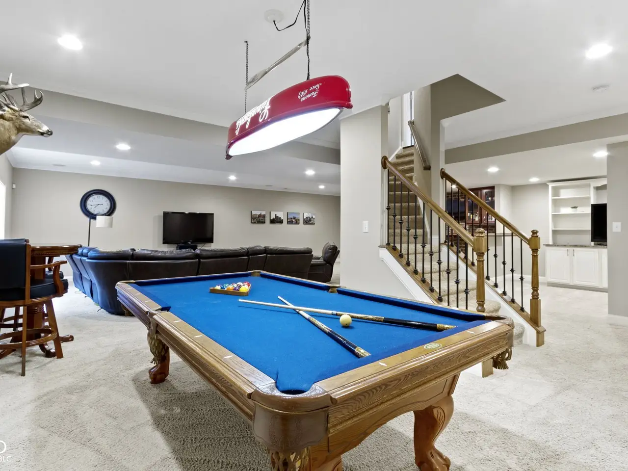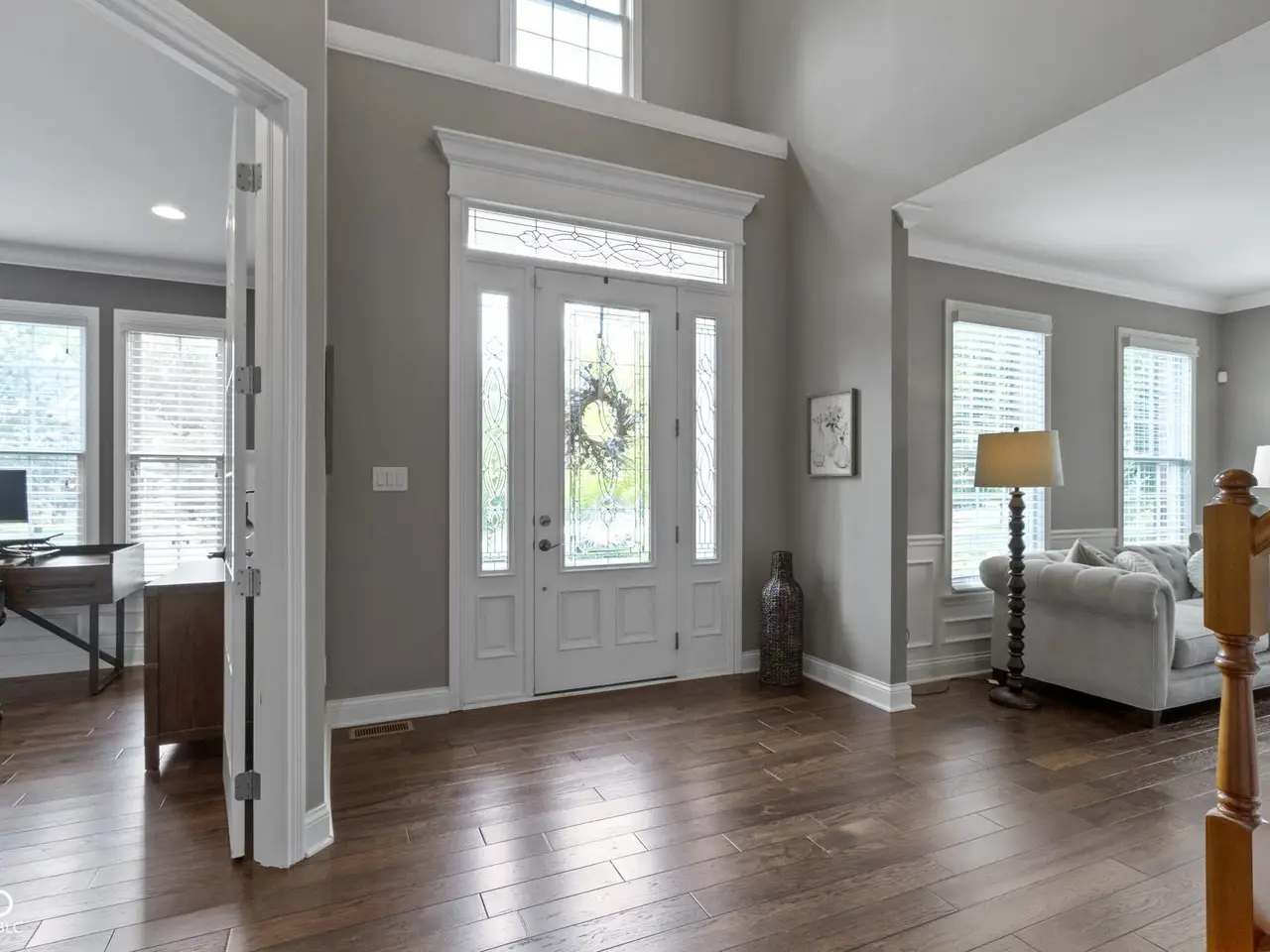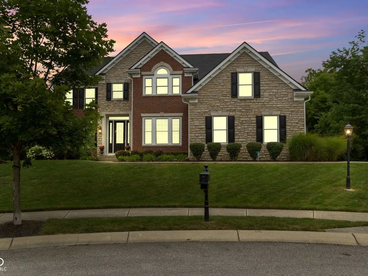 Nestled at the end of a culdesac on a premier lot, this timeless 5 bedroom/4.5 bath home awaits you in one of Fishers most desirable neighborhoods-the WOODS of THORPE CREEK! Upon arrival, you are greeted with gleaming hardwood floors and soaring 2 story foyer with detailed trim work. French double doors lead to your private office with beautiful wainscotting. A thoughtfully designed floor plan offers a separate living room and a formal dining room complete with new lighting. Large eat in kitchen is a chef's delight offering an abundance of updated white shaker cabinets, tile backsplash, granite, gas cooktop in the center island, and all stainless steel appliances ready to entertain! Speaking of entertaining, directly off the kitchen enjoy intimate gatherings in the ADDED three season room with cozy gas fireplace perfect for many months of the year! Two story great room is drenched in natural light by a wall of windows with coffered ceilings, stone gas fireplace and family friendly staircase. Upstairs find your owner's suite, three addt'l bedrooms with BRAND NEW carpet. Owner's suite includes a large sitting room, raised dual sinks, w/in shower, soaking tub, and WIC with adjustable wood shelving. Don't miss the Andersen wood core windows with detailed casings. Open walkway leads to 3 additional bedrooms that are generously sized and one with private bath. All bedrooms offer walk in closets! ESCAPE downstairs to your full finished basement with a wet bar, beverage fridge, billiard area, family/rec room and an additional bedroom with full bath. A true extension of the home with storage and closets. OUTSIDE is your amazing backyard with paver patio and firepit not to mention a large wooded side lot for added privacy, a space perfect for playset or a future pool! Home is situated on .47 acre and includes 3 car side load garage. Separate family entrance into laundry and mudroom! NEW Roof 2025 and HVAC 2023. Perfect location, don't miss this one!