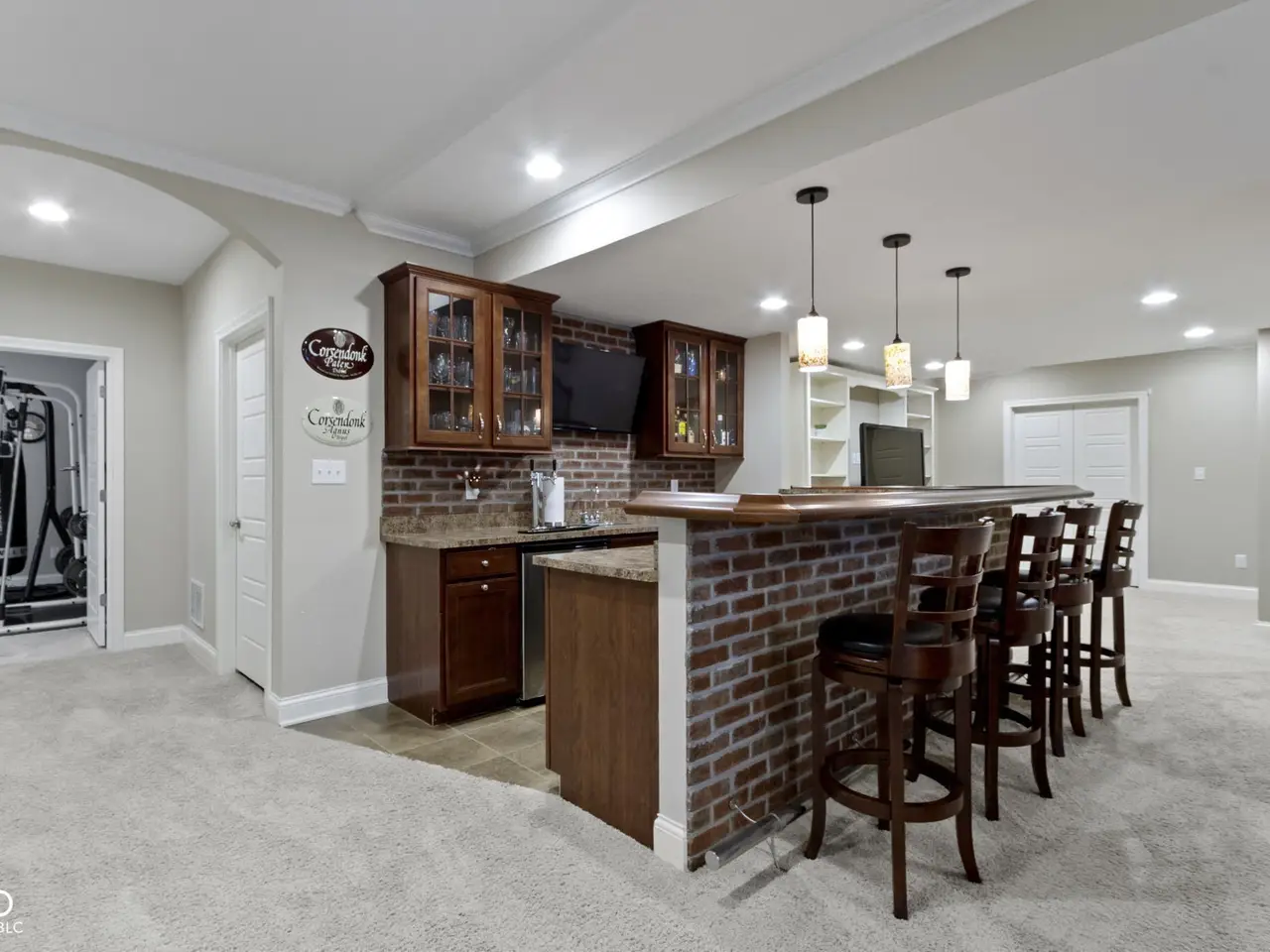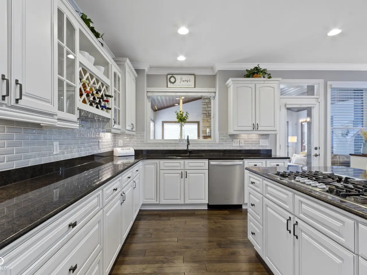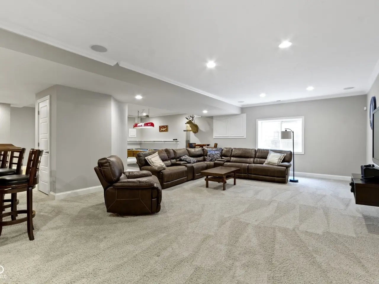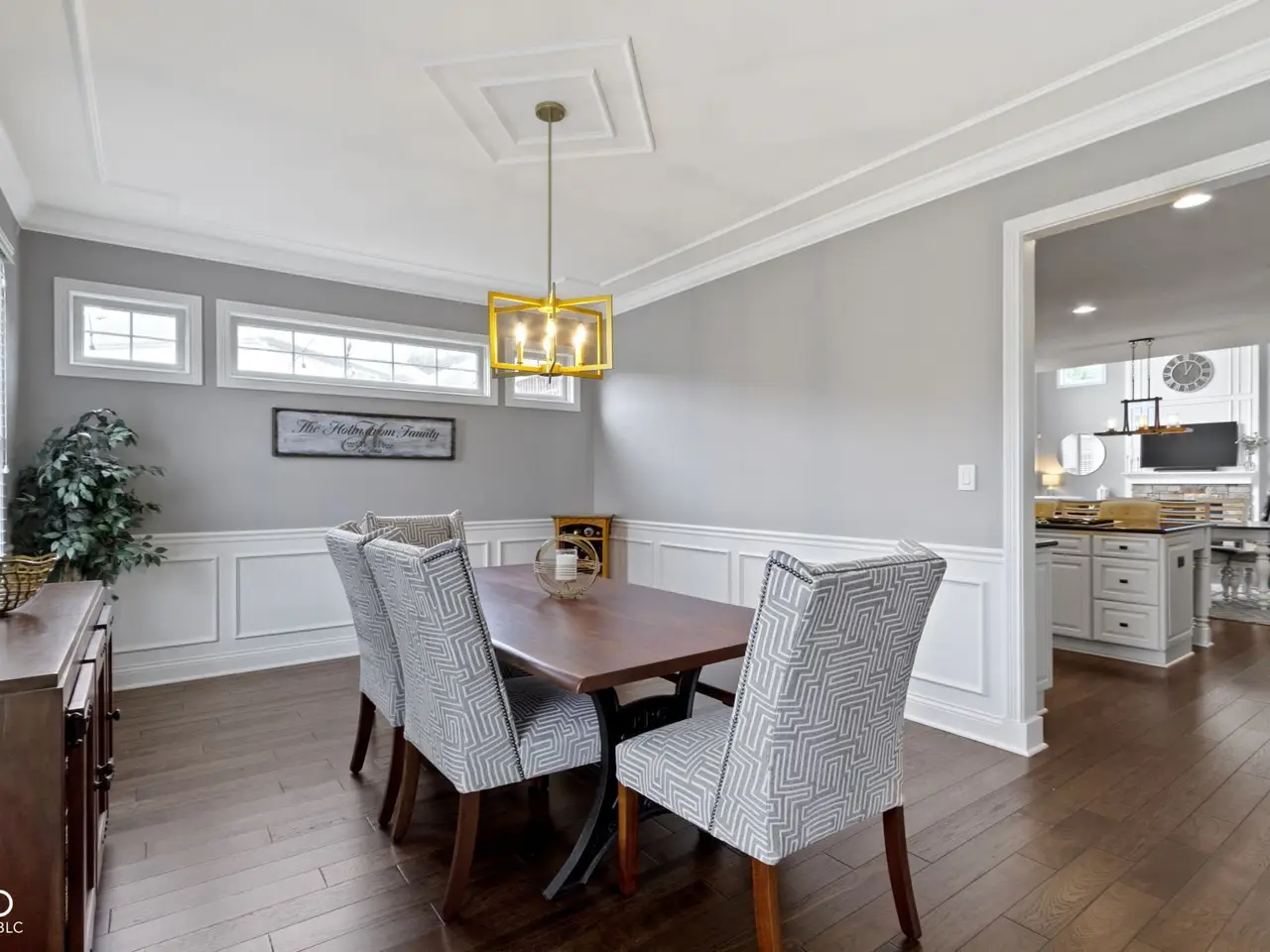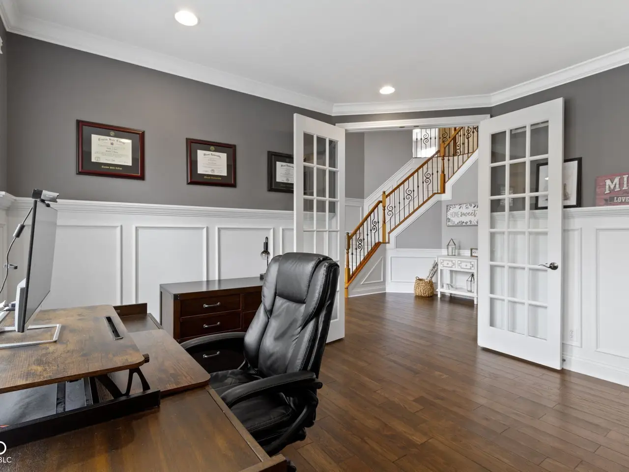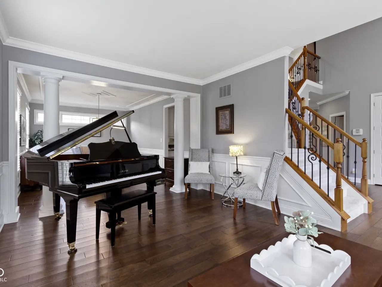 Nestled at the end of a culdesac on a premier lot, this timeless 5 bedroom/4.5 bath home awaits you in one of Fishers most desirable neighborhoods-the WOODS of THORPE CREEK! Upon arrival, you are greeted with gleaming hardwood floors and soaring 2 story foyer with detailed trim work. French double doors lead to your private office with beautiful wainscotting. A thoughtfully designed floor plan offers a separate living room and a formal dining room complete with new lighting. Large eat in kitchen is a chef's delight offering an abundance of updated white shaker cabinets, tile backsplash, granite, gas cooktop in the center island, and all stainless steel appliances ready to entertain! Speaking of entertaining, directly off the kitchen enjoy intimate gatherings in the ADDED three season room with cozy gas fireplace perfect for many months of the year! Two story great room is drenched in natural light by a wall of windows with coffered ceilings, stone gas fireplace and family friendly staircase. Upstairs find your owner's suite, three addt'l bedrooms with BRAND NEW carpet. Owner's suite includes a large sitting room, raised dual sinks, w/in shower, soaking tub, and WIC with adjustable wood shelving. Don't miss the Andersen wood core windows with detailed casings. Open walkway leads to 3 additional bedrooms that are generously sized and one with private bath. All bedrooms offer walk in closets! ESCAPE downstairs to your full finished basement with a wet bar, beverage fridge, billiard area, family/rec room and an additional bedroom with full bath. A true extension of the home with storage and closets. OUTSIDE is your amazing backyard with paver patio and firepit not to mention a large wooded side lot for added privacy, a space perfect for playset or a future pool! Home is situated on .47 acre and includes 3 car side load garage. Separate family entrance into laundry and mudroom! NEW Roof 2025 and HVAC 2023. Perfect location, don't miss this one!