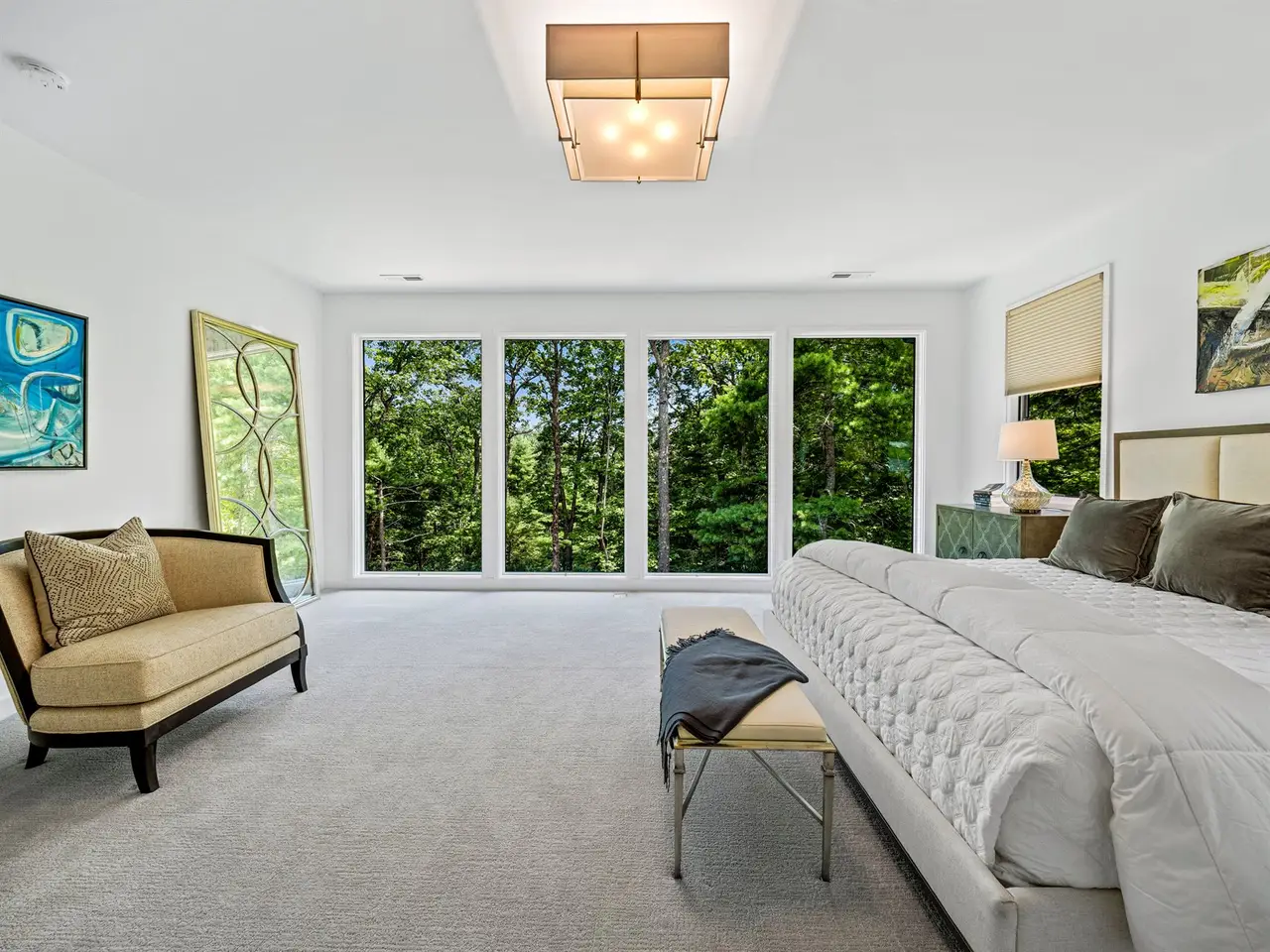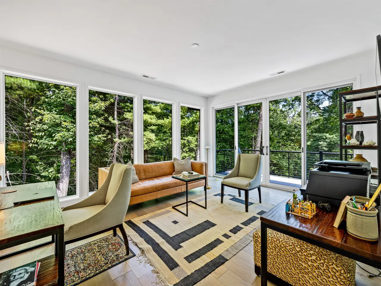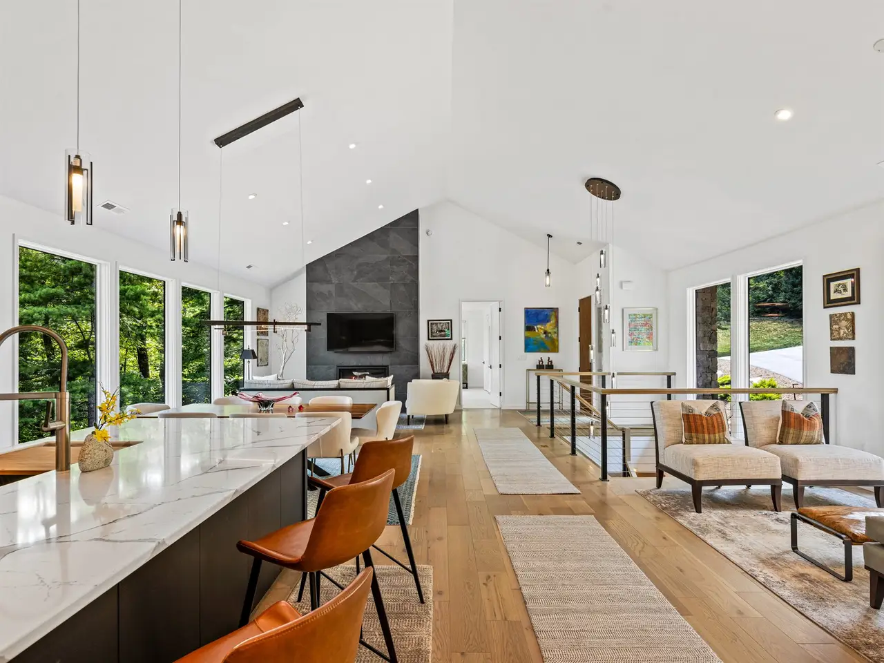 Step into this stunning modern home a true life-size treehouse with unparalleled privacy. The open-concept great room features soaring 18' ceilings and a striking fireplace wall that anchors the space. Walls of floor-to-ceiling picture windows flood the home with natural light while immersing you in nature's serene surroundings. At the heart of the home is a chef's kitchen designed for entertaining, showcasing custom Cabico cabinetry, quartz countertops and dramatic island, and premium SubZero, Wolf, and Cove appliances. Retreat to the home office a serene space for creating or peaceful reflection. The terrace level offers well appointed guest spaces with premium tile and designer finishes. Enjoy comfort year-round with three zoned HVAC one per level and one dedicated to the primary suite and a whole-house Generac generator. Designer lighting enhances each space, adding warmth and ambiance throughout. Blending sleek design with warmth and comfort, this home inspires at every turn.