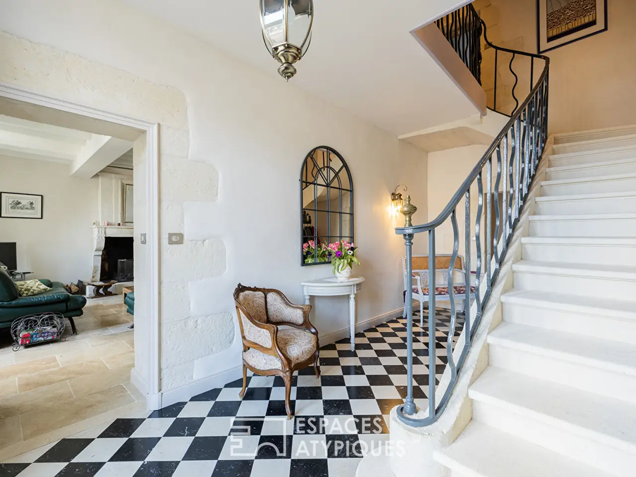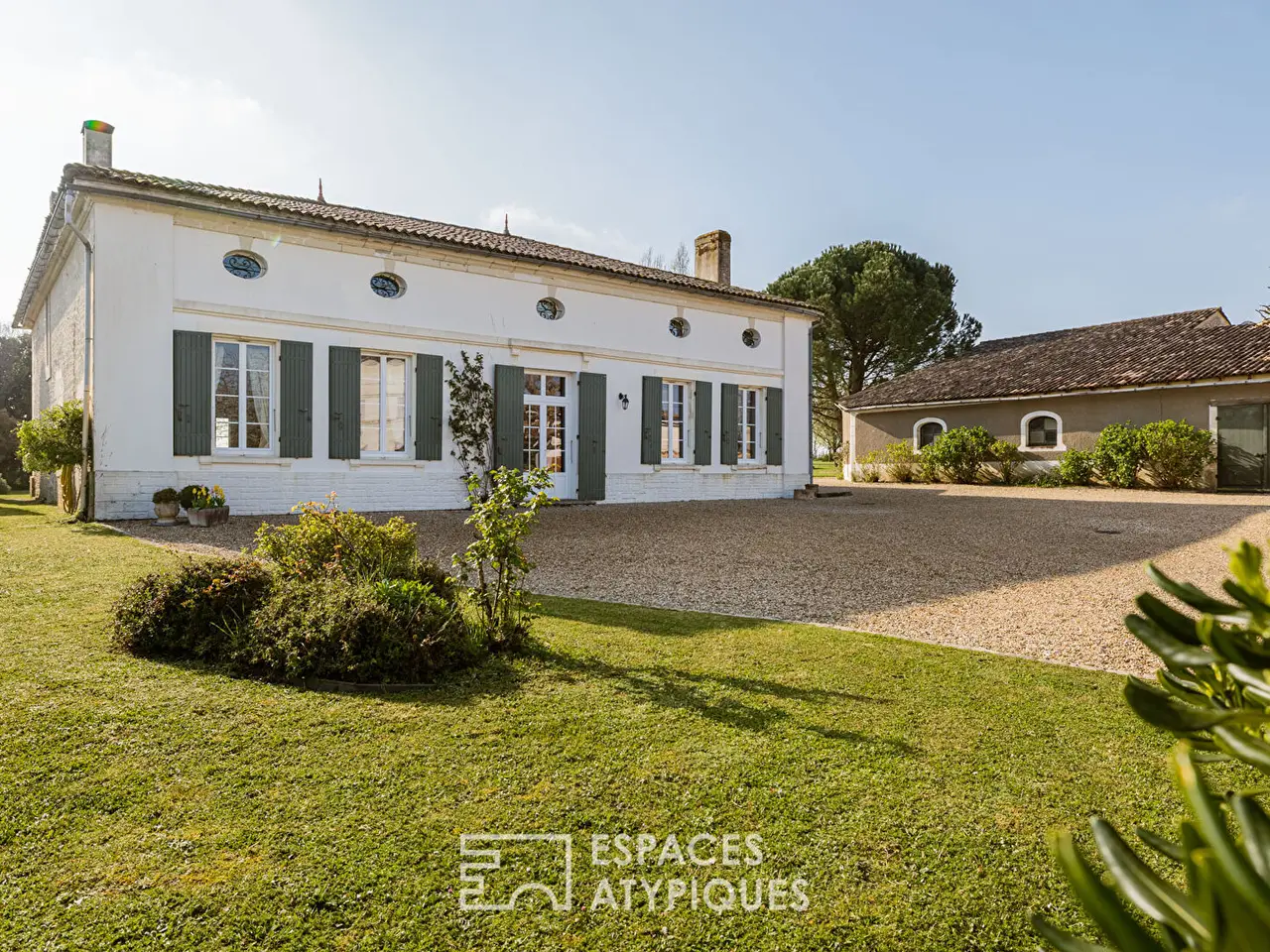 Built at the bend of a small street in the place called Floirac, a town in the heart of the Estuary a stone's throw from Mortagne-sur-Gironde, the property boasts a magnificent interior and exterior space.From the courtyard, the house stands proudly and incorporates the aesthetic codes of old Charente buildings, placing the property in an 18th-century era.The entrance is imposing. The checkerboard tiling and the splendid stone staircase leading upstairs fully contribute to the impression of entering a refined house, a sensation enhanced by high ceilings and great light. To the right and left of the entrance, two pleasant reception rooms stand out and perfectly represent the balance found in the renovation, between the preservation of an old style and the comfort of modernity.Thus, the fireplaces and stone walls sit alongside recent joinery and a travertine floor heated by a heat pump. Designed to be practical for everyday use, the ground floor was designed to preserve spaces dedicated to everyday living. A spacious office and two bedrooms with a shower room promote a single-story lifestyle, as does a functional laundry room.The kitchen, modern in its equipment and practical with its scullery, maintains this balance and leads to a particularly well-kept exterior.The upper floor constitutes the keystone of the family home. It offers six well-appointed bedrooms and two shower rooms, as well as a large games room. The exposed framework extends throughout the rooms with a unique aesthetic, preserving passage heights for easy movement. But this property has other assets to complete its versatility.An outbuilding of over 50 m2, converted into a one-bedroom apartment and currently used as a gite, completes an already large capacity. Finally, a wine storehouse and a former stable form nearly 400 m2 of additional undeveloped outbuildings, which allow for future developments. Outside, the space also dominates with a garden of more than 6,500 m2 offering absolute calm and an unobstructed view of the vineyards.The large swimming pool surrounded by a beach is welcome to fully enjoy the landscaped garden and the tranquility of the place. A perfectly well renovated property with a large reception capacity, in a green setting close to the tourist sites of the Estuary and 30 minutes from Royan.ENERGY CLASS: B / CLIMATE CLASS: A. Estimated average amount of annual energy expenditure for standard use, established from the average energy prices for the years 2021, 2022 and 2023: between EUR2,790 and EUR3,820.REF. EALR1942Additional information* 13 rooms* 8 bedrooms* 1 bathroom* 2 shower rooms* Outdoor space : 6500 SQM* Property tax : 1 996 €Energy Performance CertificatePrimary energy consumptionb : 104 kWh/m2.yearHigh performance housing*A*104kWh/m2.year3*kg CO2/m2.yearB*C*D*E*F*GExtremely poor housing performance* Of which greenhouse gas emissionsa : 3 kg CO2/m2.yearLow CO2 emissions*3kg CO2/m2.yearA*B*C*D*E*F*GVery high CO2 emissionsEstimated average annual energy costs for standard use, indexed to specific years 2021, 2022, 2023 : between 2790 € and 3820 € Subscription IncludedAgency feesThe fees include VAT and are payable by the vendorMediatorMediation Franchise-Consommateurswww.mediation-franchise.com29 Boulevard de Courcelles 75008 ParisInformation on the risks to which this property is exposed is available on the Geohazards website : www.georisques.gouv.fr