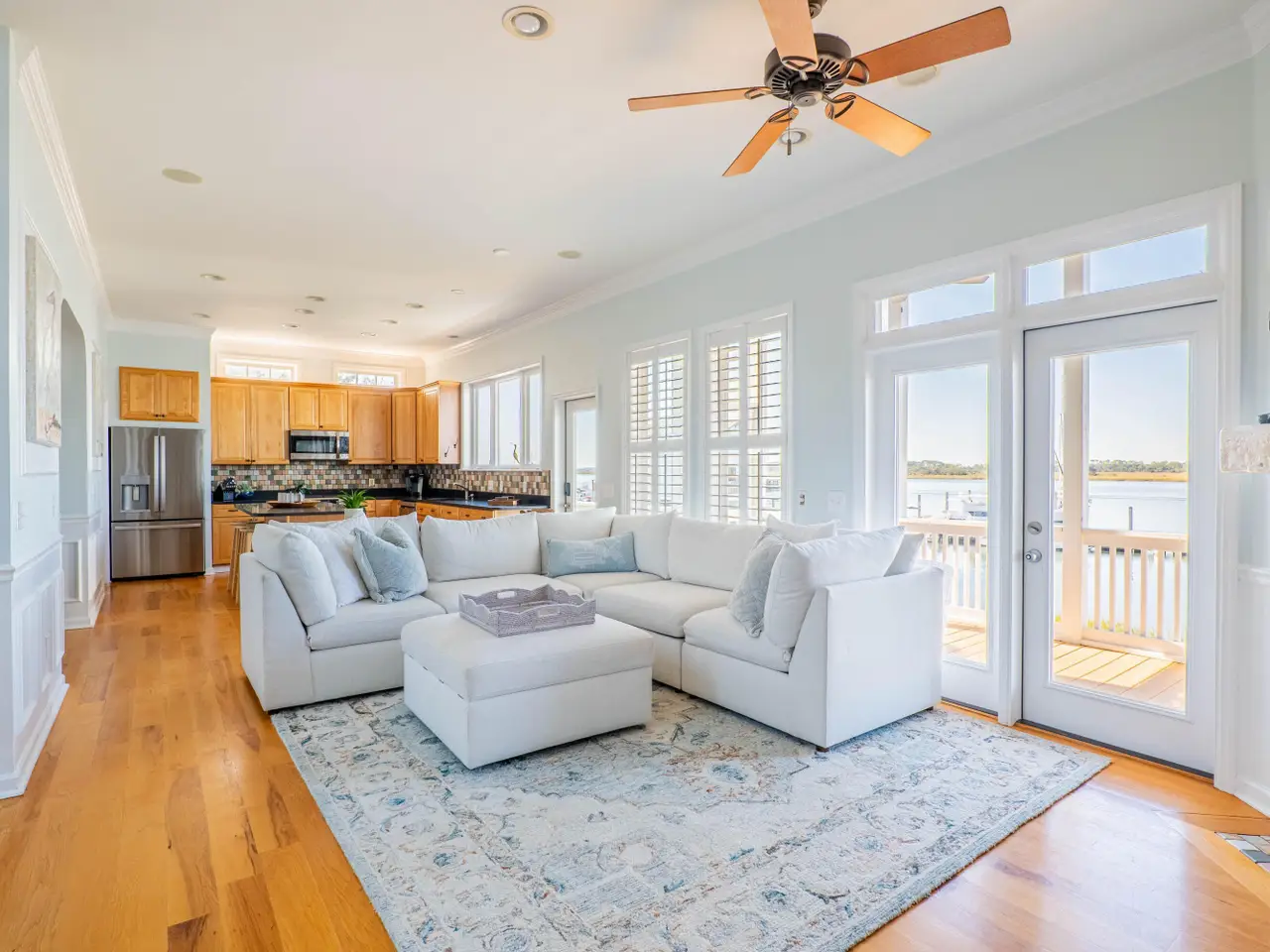 Primary suite with French doors leading to riverfront deck