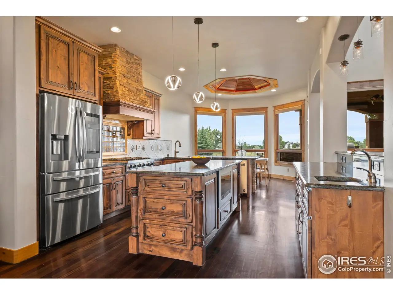 This luxury home at 863 Riparian Way in Fort Collins is a modern masterpiece. The gourmet kitchen includes granite countertops, a spacious island, and premium appliances: six-burner Viking range, double oven, wine fridge, ice maker, Samsung Smart Refrigerator, and pot filler. With under-cabinet lighting and a large walk-in pantry, breakfast nook with a custom wood-lined ceiling and bay window offers panoramic foothill views. The formal dining room has a 12' coffered ceiling, designer lighting, and a pass-through buffet perfect for entertaining. In the great room, 23' ceilings, hand-troweled walls, and a stone fireplace framed by reclaimed wood shelves create a stunning focal point. The primary suite features a gas fireplace, coffee bar, walk-in closet, bathroom with steam shower, heated floors, and access to a private patio wired for a hot tub. The main floor study doubles as a fifth bedroom with vaulted ceilings, built-in cabinetry, and an adjacent 3/4 bath. Upstairs, the ensuite has a gas fireplace, wet bar, vaulted ceilings, and 3/4 bath. Secondary bedrooms have new carpet (2022), walk-in closets, and remodeled ensuites with custom cabinets and designer fixtures. The remodeled basement (2022) includes a wet bar with quartz counters, luxury vinyl flooring, a wine cellar with copper ceiling, a theater room with projector, and ample storage. A stone gas fireplace and built-in shelving add warmth to the game room. From coffered ceilings to high-end finishes, this home showcases impeccable craftsmanship. Enjoy Colorado foothill views from the upper Trex deck with a built-in grill, heaters, sun shades, and fans. The walkout lower level has a wood-burning fireplace, water feature, and outdoor kitchen with grill, mini fridge, sink, granite island, and beverage sink. An aggregate patio leads to a garden, horseshoe pit, and fire pit. This property backs to HOA open space, with forever views and a temperature-controlled 4-car garage with electric car charger hookups.