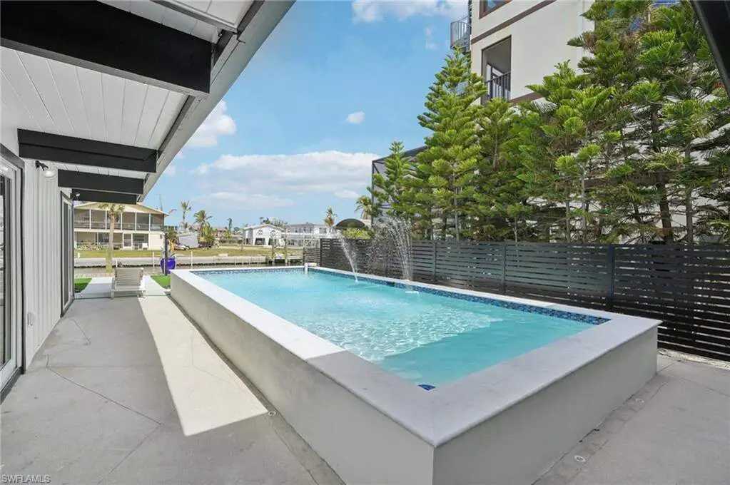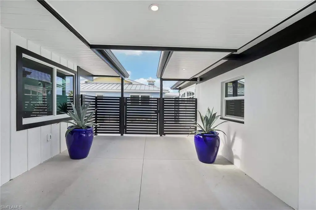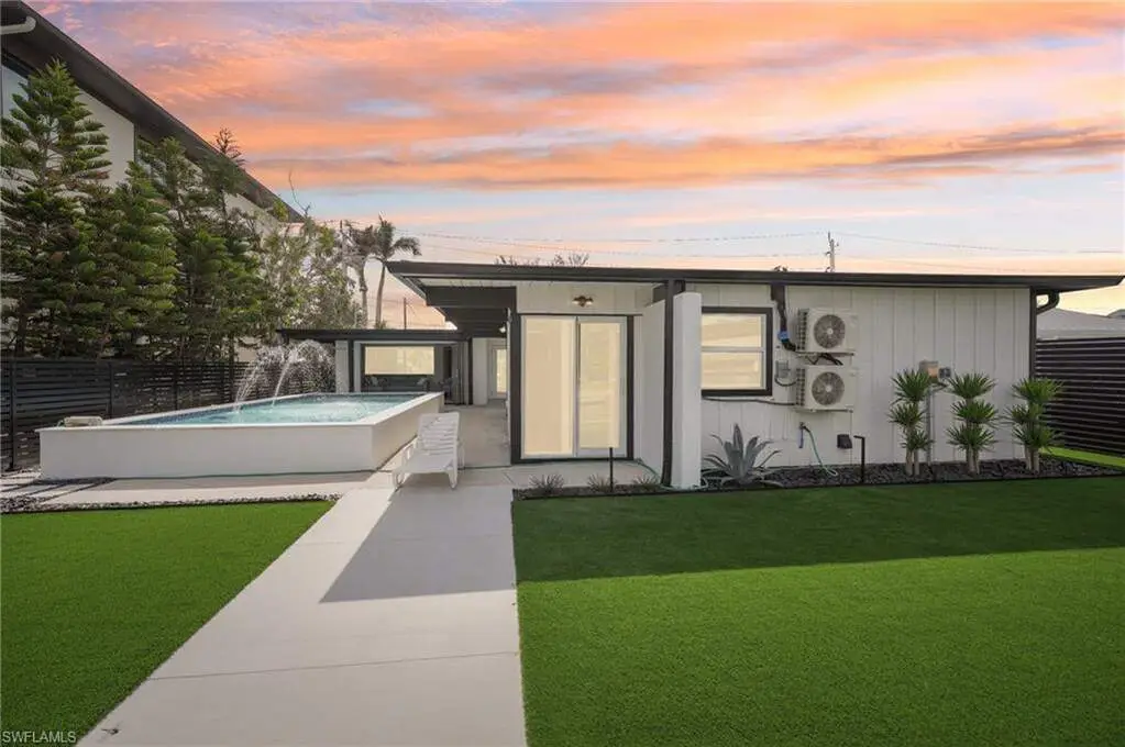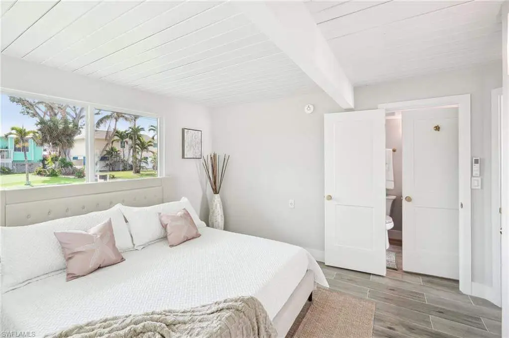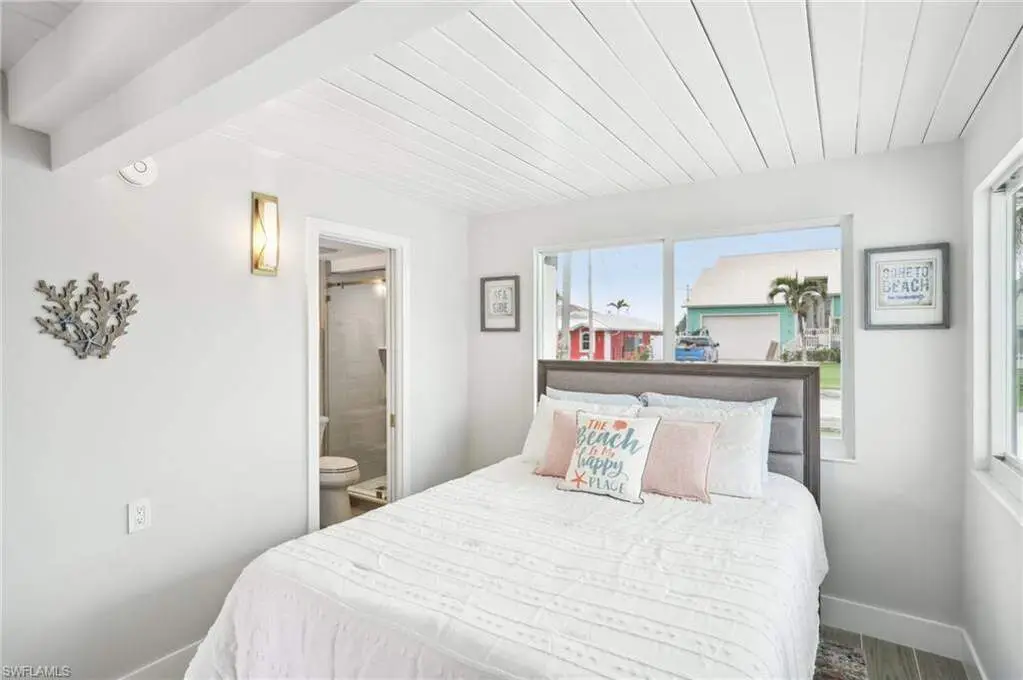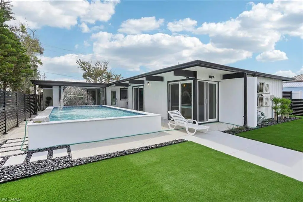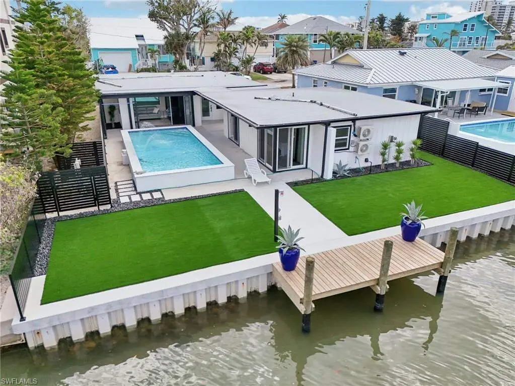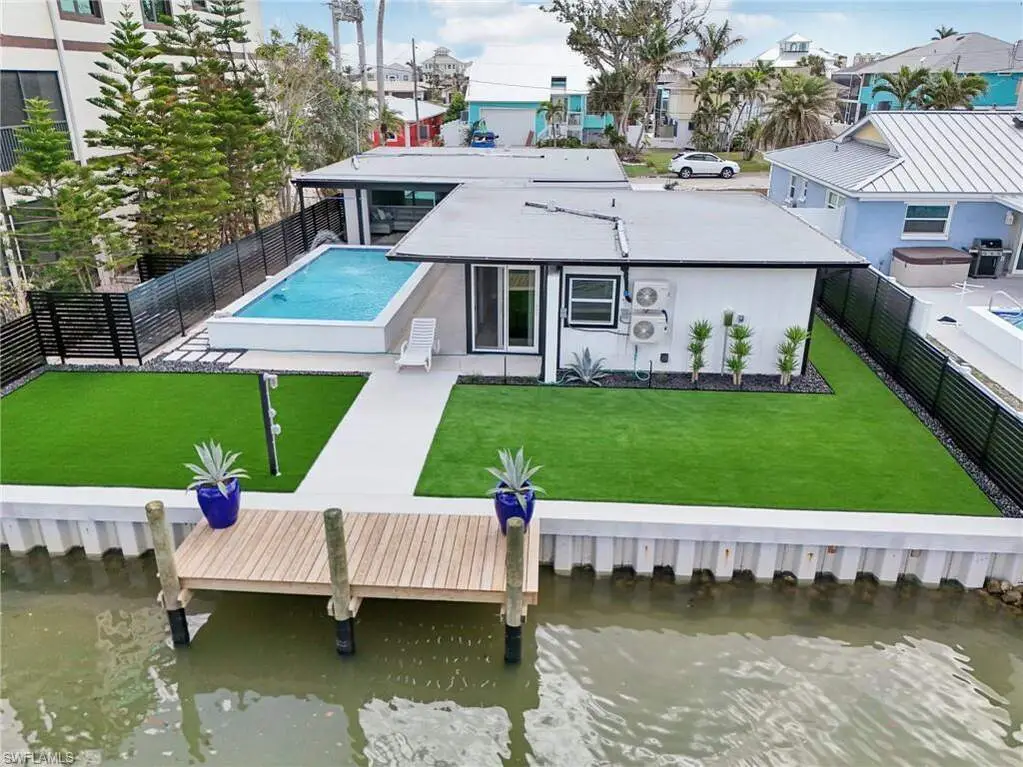 Modern elegance best describes this newly remodeled direct gulf access pool home with detached bonus guest house on Fort Myers Beach. With a total of four bedrooms and three full bathrooms, there is plenty of room for your extended family. The main home features custom cabinetry and tile work throughout the entire residence. The kitchen features not only stunning quartz counters, but a quartz wall, designer Bosch appliances, and ample size breakfast bar. While you relax in the living area, you can open your panoramic sliding doors to enjoy the breezes off the water. As you step into your detached one-bedroom guest home, you can enjoy the same level of workmanship and detail, inclusive of custom cabinetry, tile work, and modern finishings. In addition to a one and a half car garage, custom aluminum fencing and additional parking, the exterior has been meticulously zero scaped with fresh stone and a beautiful synthetic lawn for ease of maintenance and a sleek appearance. As you relax by your pool, you can enjoy Bay views and watch the Dolphin and the Manatee as they play right in your backyard complete with a brand-new seawall and dock. Why wait for new construction when everything here was fully permitted, inclusive of plumbing, electrical, impact doors and windows, roof, and so much more. Jump on your boat right in your backyard or take a short stroll to the white sands to explore all that southwest Florida has to offer!