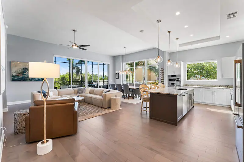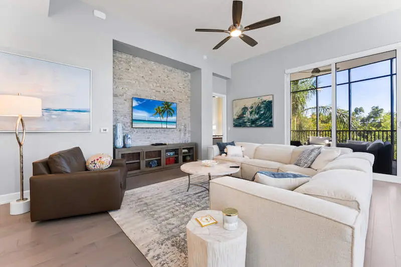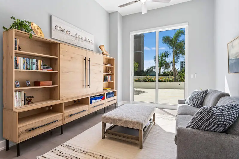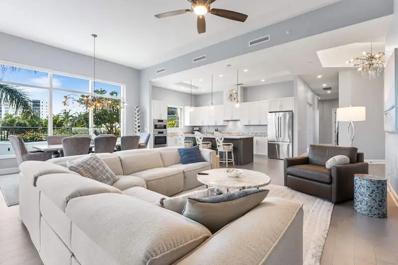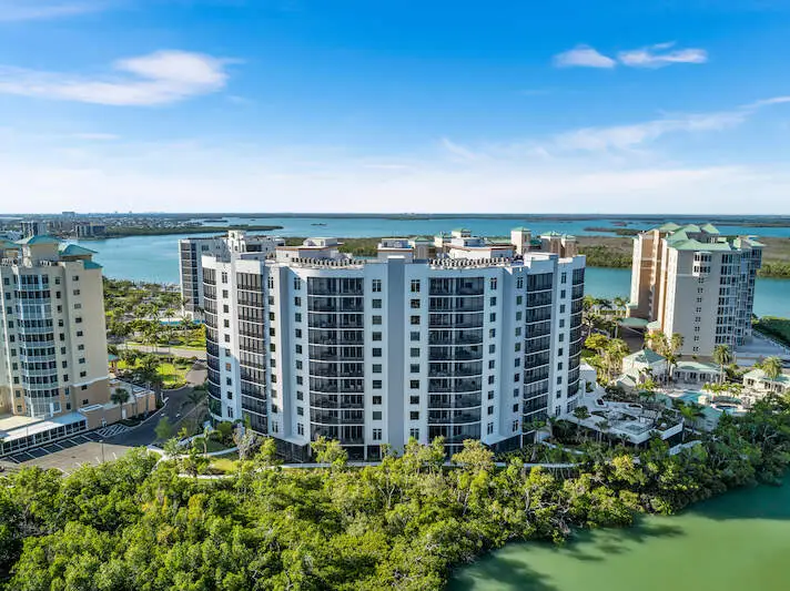 This is ONE-OF-A-KIND! This is the ONLY condo in the sought-after development of Grandview at Bay Beach with the wraparound lanai with 1,694 square feet of outdoor space! This lanai is so large it has its own zip code! The possibilities are endless with this space!!! This rare three bedroom plus den, 3.5 bath is being sold TURNKEY! There are only 58 condos in this exclusive high rise on Ft. Myers Beach. Boasting 2923 square feet of living area totaling 4,617 square feet with all of your outdoor space! There is no other condo like this one! 12-foot soaring ceilings! So much natural light spills in from every window! Newly installed electric sunshades throughout and of course, hurricane impact windows and sliders for piece of mind! Your culinary kitchen is outfitted with Bosch appliances, full island with granite countertops, two toned cabinetry, soft close doors and drawers, 42-inch custom cabinetry. Your living area has a stacked stone feature wall and awe inspiring custom lighting. All bedrooms have en suite full baths. Your open concept is perfect for entertaining large groups or intimate gatherings. Your master wing has an en suite bath with auto cabinet underlighting, walk-in shower with floor to ceiling tile, extended dual vanities with quartz countertops. Private water closet. Your two additional enjoyably sized bedrooms have full access to your outdoor lanai. 2nd bedroom has shower/tub combination while your 3rd bedroom has a walk-in shower with seamless glass enclosure. You office/den/reading/relaxing room has access to the enormous lanai as well. Carpet in all bedrooms. There are two guest suites that owners can secure for additional family or friends if needed. No need to find a hotel room on the island! First class luxury accommodations flow seamlessly in these fine guest suites. Be a part of Grandview at Bay Beach, on the Southern tip of Estero Island next to Lover's Key. Many amenities that are included are a community pool, hot tub, two BBQ grills, two firepits, yoga room, TRX, full athletic facility, Pickle Ball, Tennis, Bocce Ball, Deeded beach access, beach parking. There are future plans for a putting green in the park. There is a 60-foot boat slip in Waterside for a separate purchase. MLS #224034904. Walking distance to Santini Plaza and a quick drive off the south bridge to Lovers Key State Park, RSW international airport and Bonita/Naples for the best in shopping and dining that southwest Florida has to offer. Amazing video to watch!
