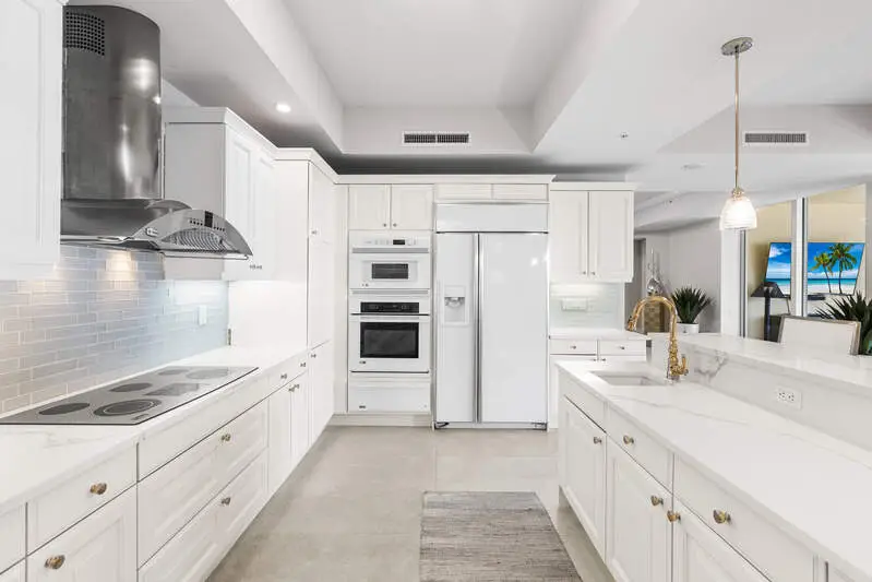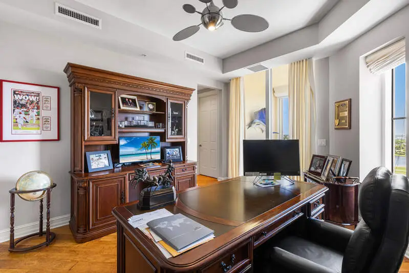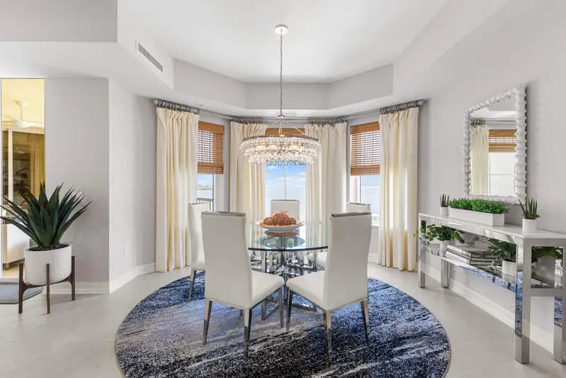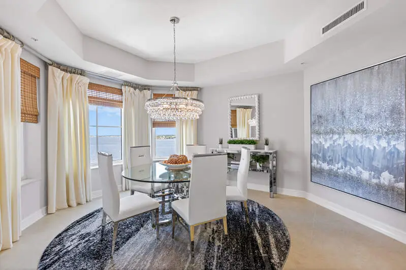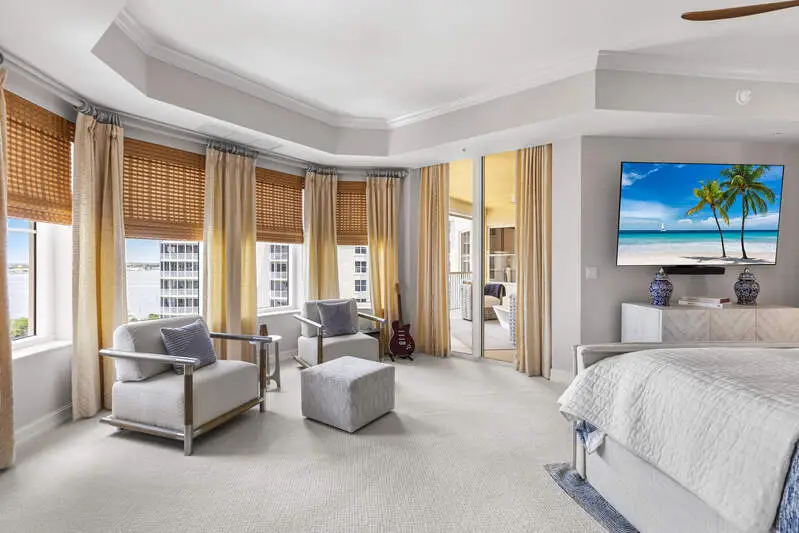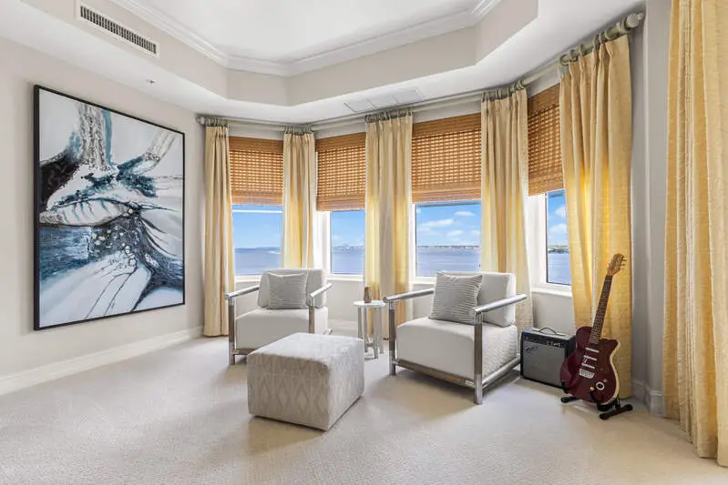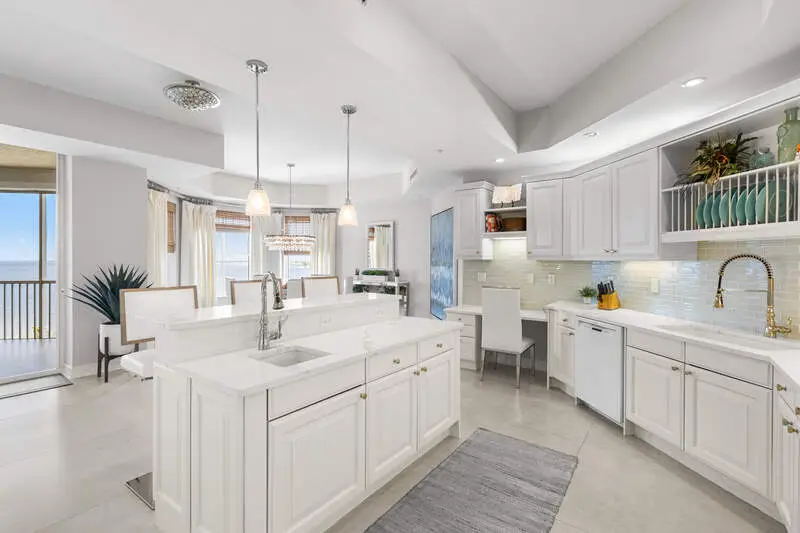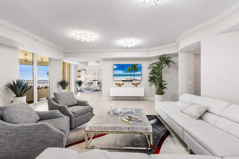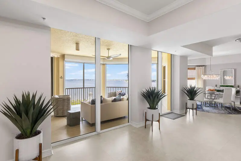 TEMPORARILY - SPORTS MEMBERSHIP JOINING FEE HAS BEEN REDUCED BY $32,000! Take advantage now of Gulf Harbour's temporary reduction. For a limited time you can obtain a sports membership for a joining fee of $20,000. Light-Filled Luxury with Unmatched Sunset Views at The Paramount in Gulf Harbour Experience elevated coastal living in one of Gulf Harbour's most prestigious addresses-The Paramount. This stunning Torriera floorplan residence features 3 bedrooms, 3.5 baths, and offers a sprawling 3,340 sq. ft. of beautiful living space, complete with breathtaking panoramic westerly waterfront views that deliver spectacular sunsets nightly is being sold turnkey. Step off your private elevator into an Artist Hand-Painted foyer that sets the tone for the thoughtful elegance throughout. Redesigned and remodeled in 2022, the home features a seamless flow of 24" x 24" quartz-infused flooring extending from the living area to the lanai. The gourmet kitchen is a showstopper, boasting marble countertops, white appliances, a warming drawer, center island, built-in desk, and ample space for both function and style. The great room opens to a riverfront lanai with sunshades, perfect for entertaining or relaxing while taking in the tranquil water views. The primary suite is a true retreat with its own waterfront seating area, dual marble vanities, zen soaking tub, walk-in shower, and dressing area. Enormous walk in closet.Both guest bedrooms are private ensuites, one featuring its own lanai with views of the golf course, lakes and downtown Ft. Myers. Additional highlights include: Wet bar and wine cooler with marble counters Artist Hand-Painted powder bath and unique lighting throughout Crown molding, new carpet, and fresh interior paint Hurricane-rated windows, doors, and shutters on both lanais Large laundry room A/C storage area Two deeded parking spaces Enjoy resort-style amenities without ever leaving the building, including a community pool, fitness room, steam room, meeting room, and BBQ area-all within The Paramount. This residence represents the pinnacle of high-rise luxury and is move-in ready for the discerning buyer. Private memberships to Gulf Harbour are available for a separate purchase. Don't miss the 2 awe-inspiring videos!