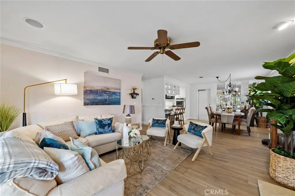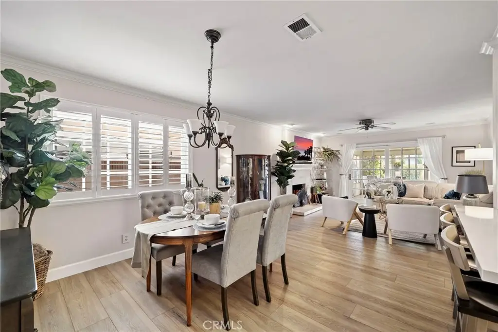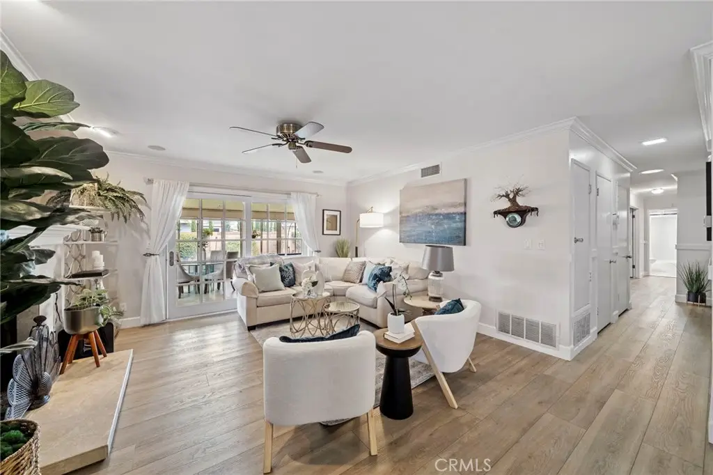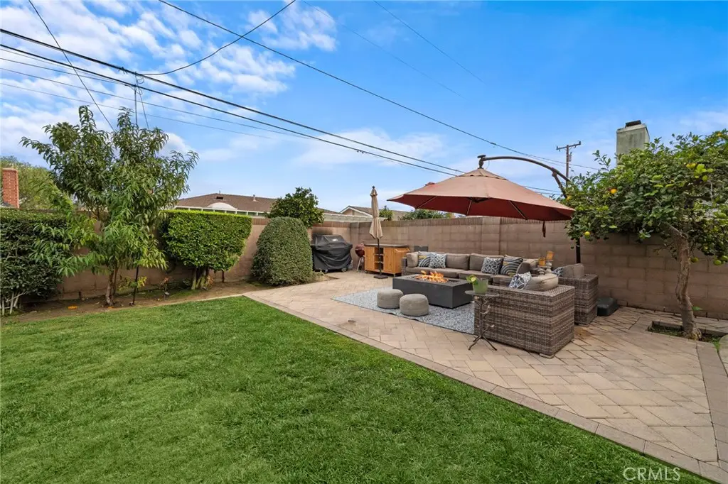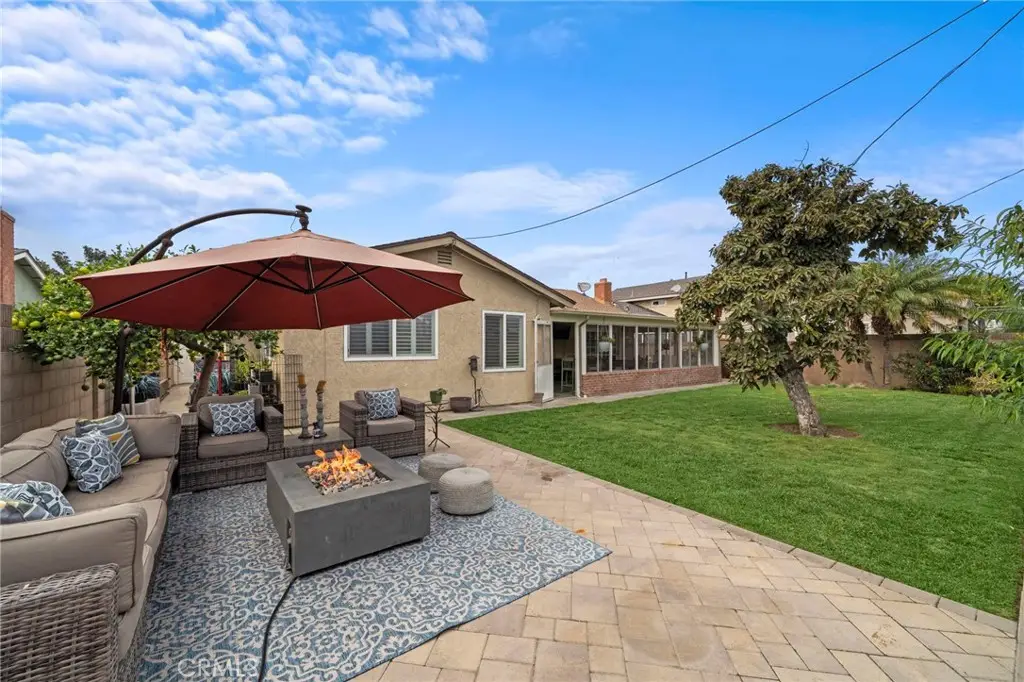 Absolutely Stunning Single-Level Home -- Expanded, Exquisite, and Impeccably Maintained. This extraordinary ranch-style Stratford home is a true masterpiece of comfort, elegance, and craftsmanship. Boasting nearly 1,700 sqft of beautifully upgraded living space plus a 450-sqft enclosed patio, it offers an entertainer's dream for dining, parties, or relaxing with family and friends. From its picture-perfect curb appeal--featuring pristine tropical landscaping, lush lawn, brick siding and walkway, and a charming front porch--to its sun-drenched open-concept interior, every inch radiates pride of ownership and timeless sophistication. Step through the inviting foyer into your dream kitchen with quartz countertops, white shaker cabinetry with pullouts and glass display panels, and a wrap-around breakfast bar open to the formal dining and living rooms. The spacious living area is accented by a travertine-style fireplace with custom mantel and elegant French doors opening to the enclosed patio--an impressive bonus space ideal for game nights, dining al fresco, or lounging year-round. The primary suite, expanded by 266 sqft, is a true retreat with a sitting area, walk-in closet, and spa-inspired bath featuring jetted soaking tub, separate walk-in shower w/bench, and travertine-style tile w/glass mosaic inlay. Three additional bedrooms are equally lovely, one currently an office/den with French doors to the patio. The hall bath offers an antique vanity and tiled tub/shower combo. Additional upgrades include wide-plank luxury waterproof vinyl flooring, tile floors in baths, dual-pane windows w/custom casings, real wood French doors, plantation shutters, recessed lighting, ceiling fans, chair railing, crown molding, tall baseboards, surround sound, and central A/C. The backyard is a tranquil paradise with an expansive lawn, interlocking paver patio, manicured landscaping, and fruit trees (lemon, pomegranate, avocado, peach) surrounded by block wall fencing for exceptional privacy. The extra-deep finished garage features a laundry area w/utility sink, cabinetry, walk-in pantry, workbenches, reinforced beams, and attic storage. Located in one of Fountain Valley's most sought-after neighborhoods near award-winning schools, McDowell Park, and just minutes from Mile Square Park, shopping, dining, and the beach--this exquisite single-story home offers the lifestyle and location buyers dream of but rarely find.