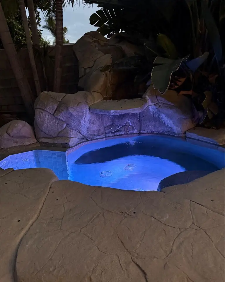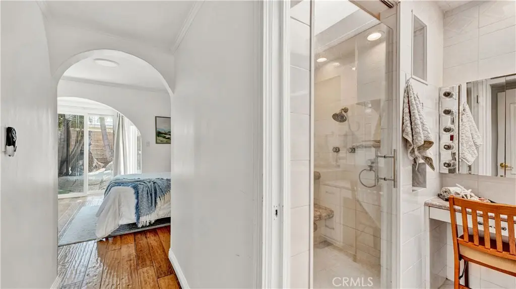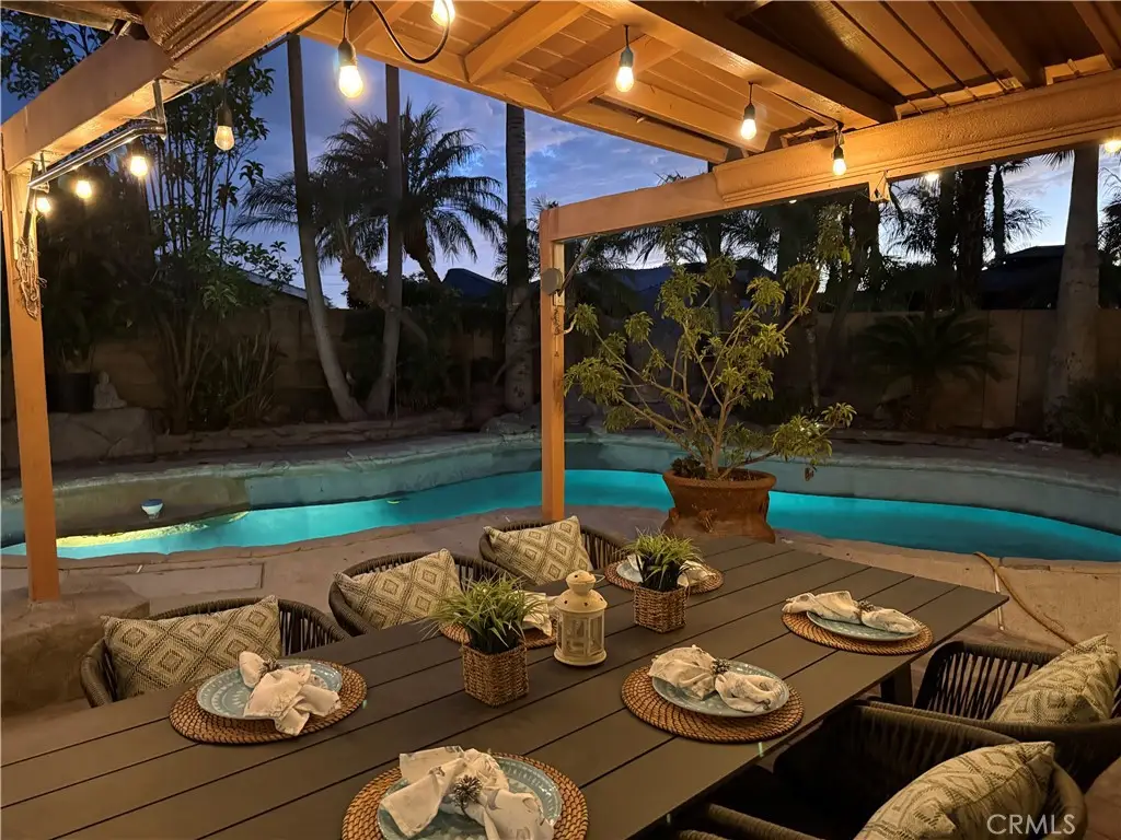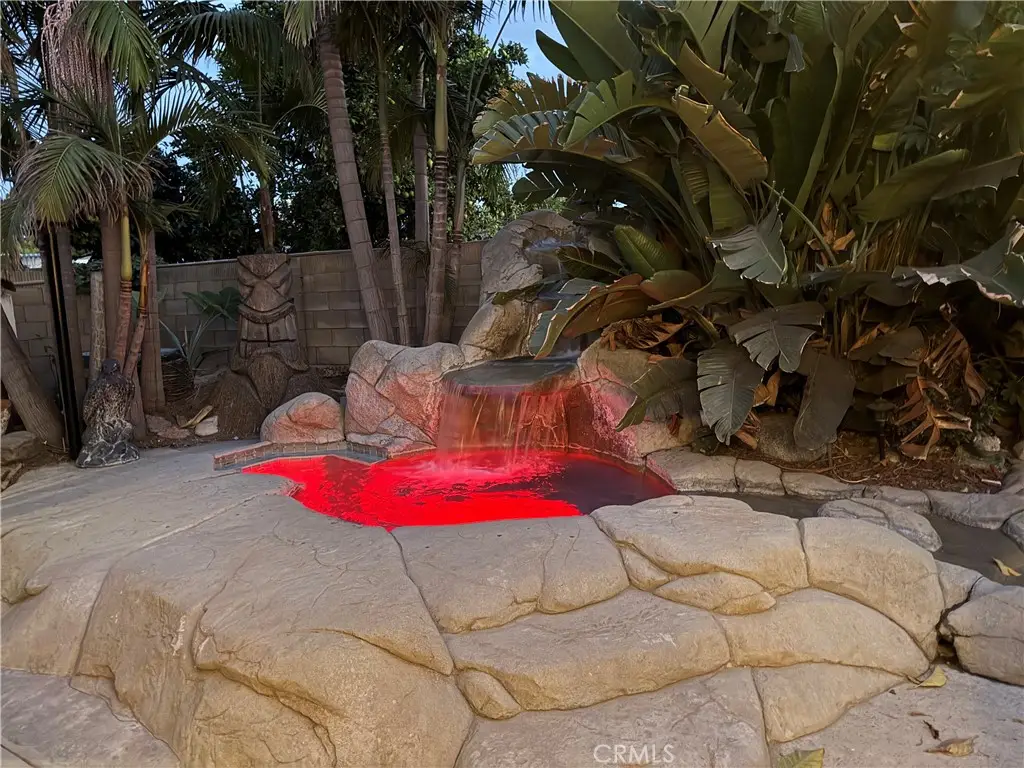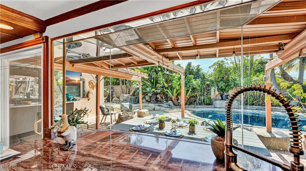 Absolutely unique and highly upgraded Spanish-style single story home on an interior cul-de-sac street just 4 miles from the beach and walking distance to neighborhood park with tennis, featuring 3 bedrooms, 2 baths, 1,509 square feet, finished garage, and an incredible 40-foot covered RV parking area with gated access--ideal for RV, boat, OR build an ADU - Home Comes with CITY APPROVED BLUEPRINTS for ADU. This home is an entertainer's dream, inside and out, showcasing a stunning tropical oasis backyard with sparkling pool and spa set into natural boulders, waterfalls, river feature connecting spa to pool, lava fire pit, extensive outdoor lighting, two covered patios, a wrap-around wet bar, built-in Lynx BBQ center with river rock surround, stamped concrete and paver decking, and lush mature landscaping with palm trees and block wall fencing. Step inside this remarkable home through a solid wood & beveled glass entry door that opens to a tiled foyer and an elegant formal living room with cathedral open-beam ceiling, custom fireplace, decor niches, and French doors leading to the backyard. The spacious family room boasts hardwood plank flooring and custom oak built-ins with glass display cabinets, wine storage, wine cooler, and buffet counter, flowing seamlessly to the remodeled kitchen with granite countertops, stainless steel appliances, tile backsplash, breakfast bar, pantry, and a frameless bay window overlooking the resort-style yard. The luxurious primary suite offers French doors to the spa, a large walk-in closet with custom organizers, and a spa-like bath with skylight, huge steam shower with seating, vanity area, and heated toilet. The guest bath features glass block accents and an oversized jetted soaking tub, and skylight. Additional amenities include dual pane windows, plantation shutters, arched passages, recessed lighting, central A/C, and a finished garage with epoxy flooring, built-in storage cabinets, pull-down ladder to attic storage, and washer/dryer hookups. A one-of-a-kind property blending comfort, function, and resort living in one of the area's most desirable neighborhoods with award-winning schools.