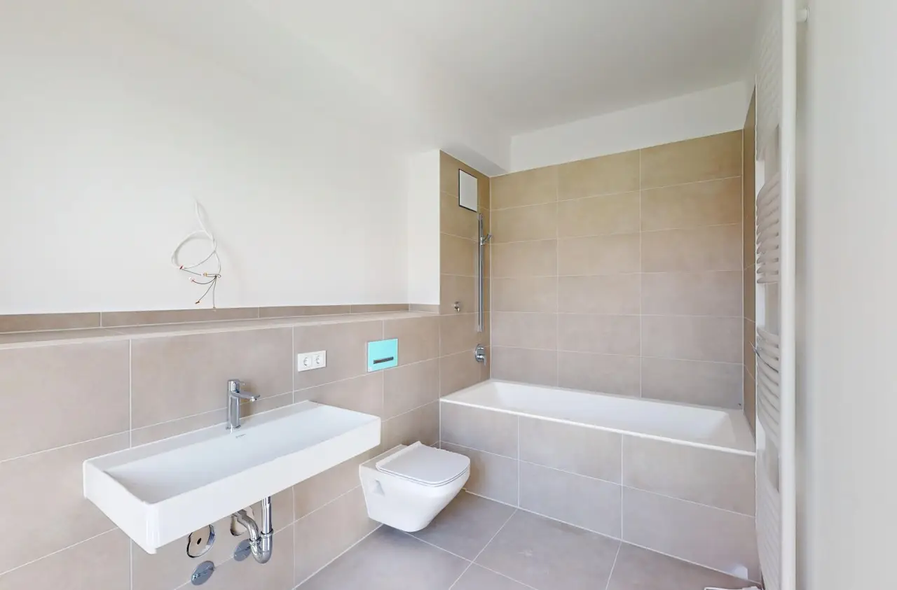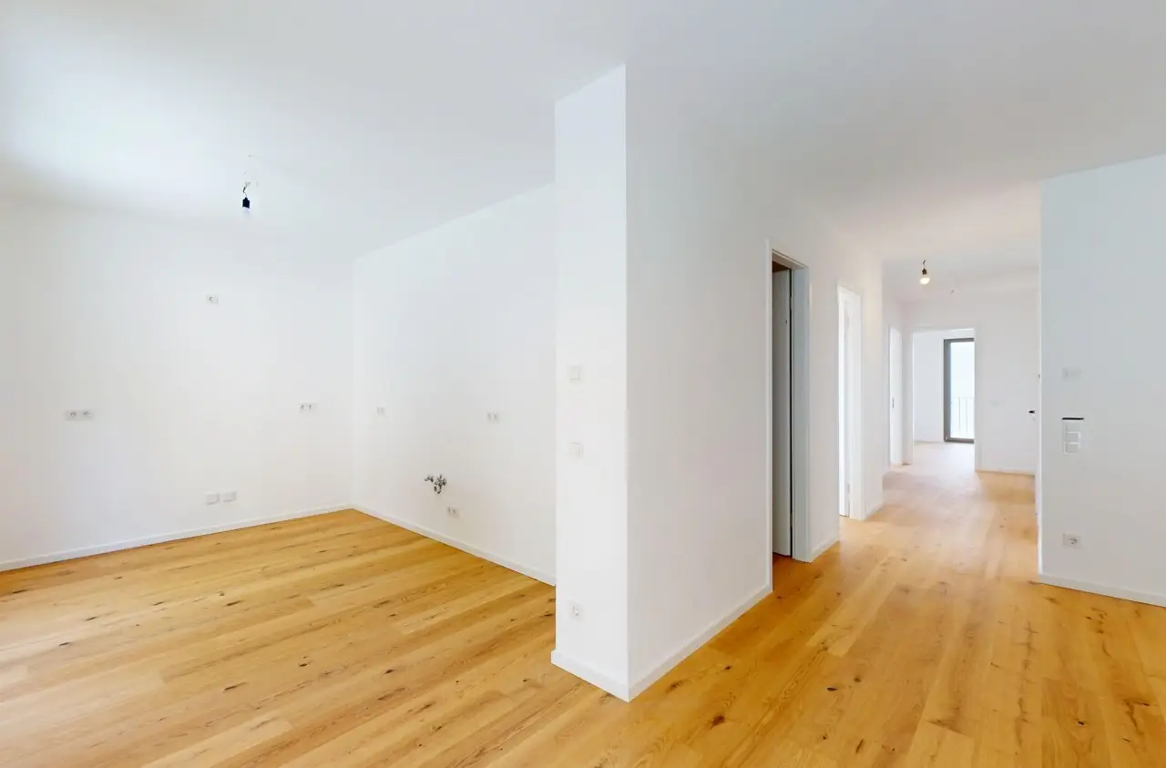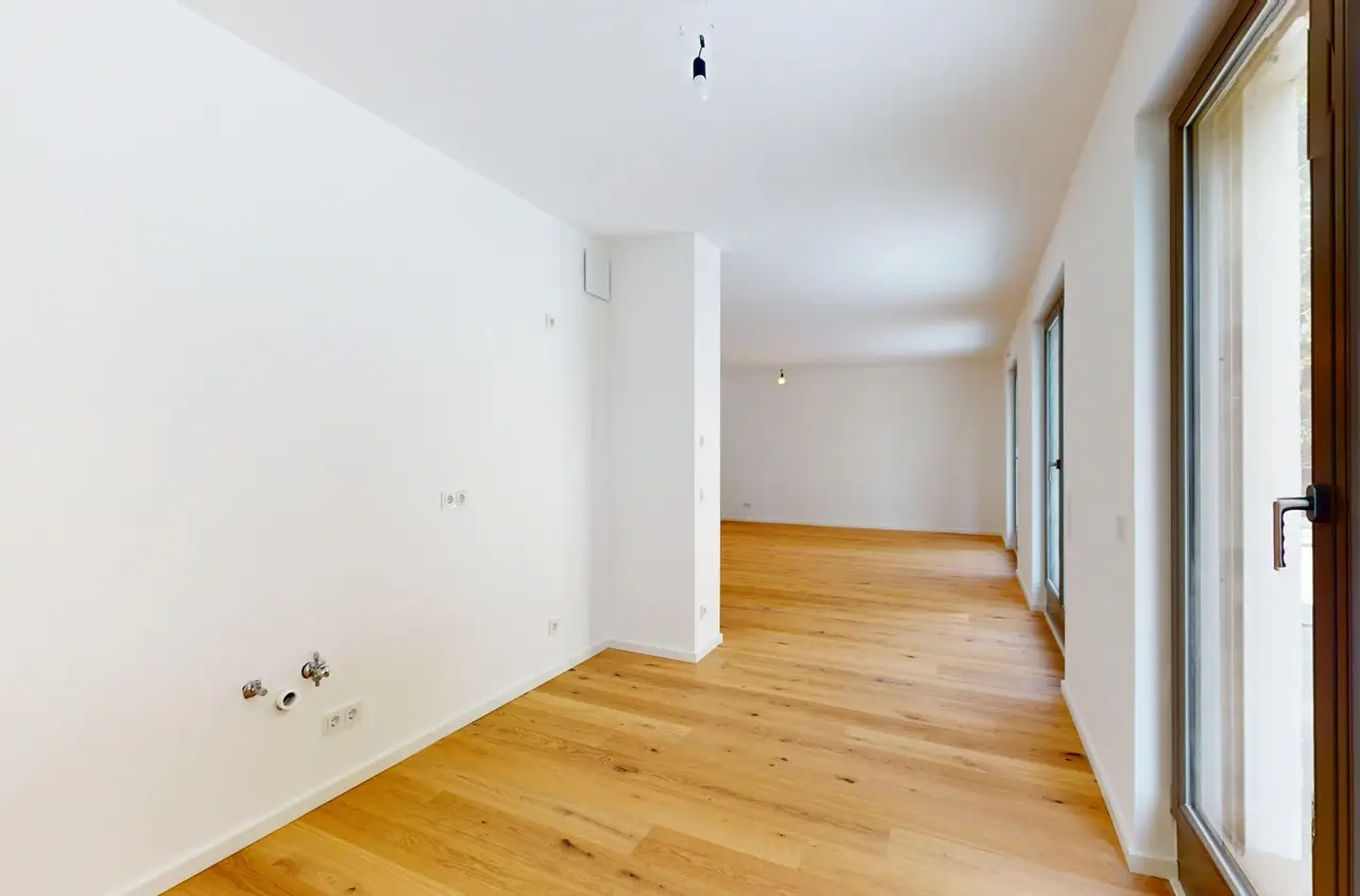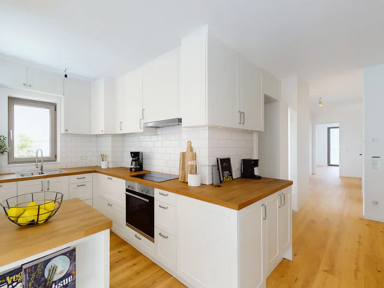 This exclusive penthouse apartment combines contemporary living with high-quality comfort and a well thought-out floor plan. It is located in an architecturally appealing new building ensemble in a quiet, mature location in Alt-Eschersheim and offers you the special advantage of first-time occupancy. Access to the apartment is via a well-kept front garden, which emphasizes the private and inviting character of the building. You can reach the second floor via the spacious staircase or the elevator and enter the penthouse apartment without steps. As soon as you enter, you are greeted by an open, elegant entrance area from which all rooms are accessed. The hallway opens harmoniously into a spacious living, dining and cooking area, which forms the heart of the apartment and provides access to the roof terrace measuring around 58 m². Two bedrooms and two bathrooms provide modern comfort. Floor-to-ceiling windows and the south-east orientation ensure light-flooded rooms and a bright, friendly living atmosphere. High-quality oak parquet flooring with a plank look creates a warm, stylish ambience, while large-format porcelain stoneware tiles in the two bathrooms exude timeless elegance. The bathrooms are equipped to a high standard with walk-in showers and bathtubs, elegant designer washbasins and branded fittings. A special highlight of this apartment: the spacious roof terrace, which offers plenty of space for sunbathing, relaxing and entertaining and beautiful views. The apartment is located in an energy-efficient KfW Efficiency House 55 and is equipped with a future-oriented, hybrid heating system - consisting of an air heat pump, modern gas condensing technology and photovoltaics. This property is ideal for discerning couples, families or senior citizens who place particular value on quality, tranquillity and spacious outdoor areas - without having to sacrifice proximity to Frankfurt city center. A spacious, exclusive penthouse apartment for discerning aesthetes.