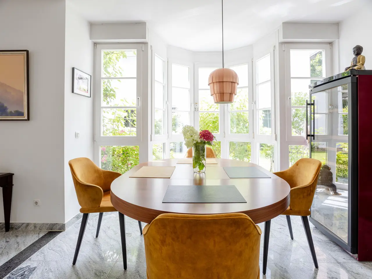This exclusive three-bedroom garden apartment is located in a luxurious villa built in 1998 and offers a high-quality and spacious living ambience on approximately 138 m² of living space. The open-plan living/dining area is fitted with elegant marble flooring and impresses with floor-to-ceiling windows that create a bright, friendly atmosphere. From here, you have direct access to the terrace and the spacious, well-kept garden of around 300 m² - an ideal place to relax or socialize outdoors. The apartment has a comfortable bedroom and a further room that can be used flexibly as a children's room or office. The stylish daylight bathroom is equipped with a double washbasin, a bathtub and a separate shower; there is also a guest WC. A fitted kitchen is available and blends harmoniously into the elegant living concept. Two practical storage rooms within the apartment offer additional storage space. The apartment also has two underground parking spaces. The entire property is located in a quiet, upmarket residential area and combines privacy with stylish living at a high level. Two cellar rooms round off this offer. This garden apartment is the perfect choice for anyone looking for an exclusive home with generous space and high-quality fixtures and fittings in a quiet location.