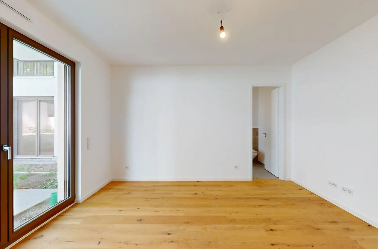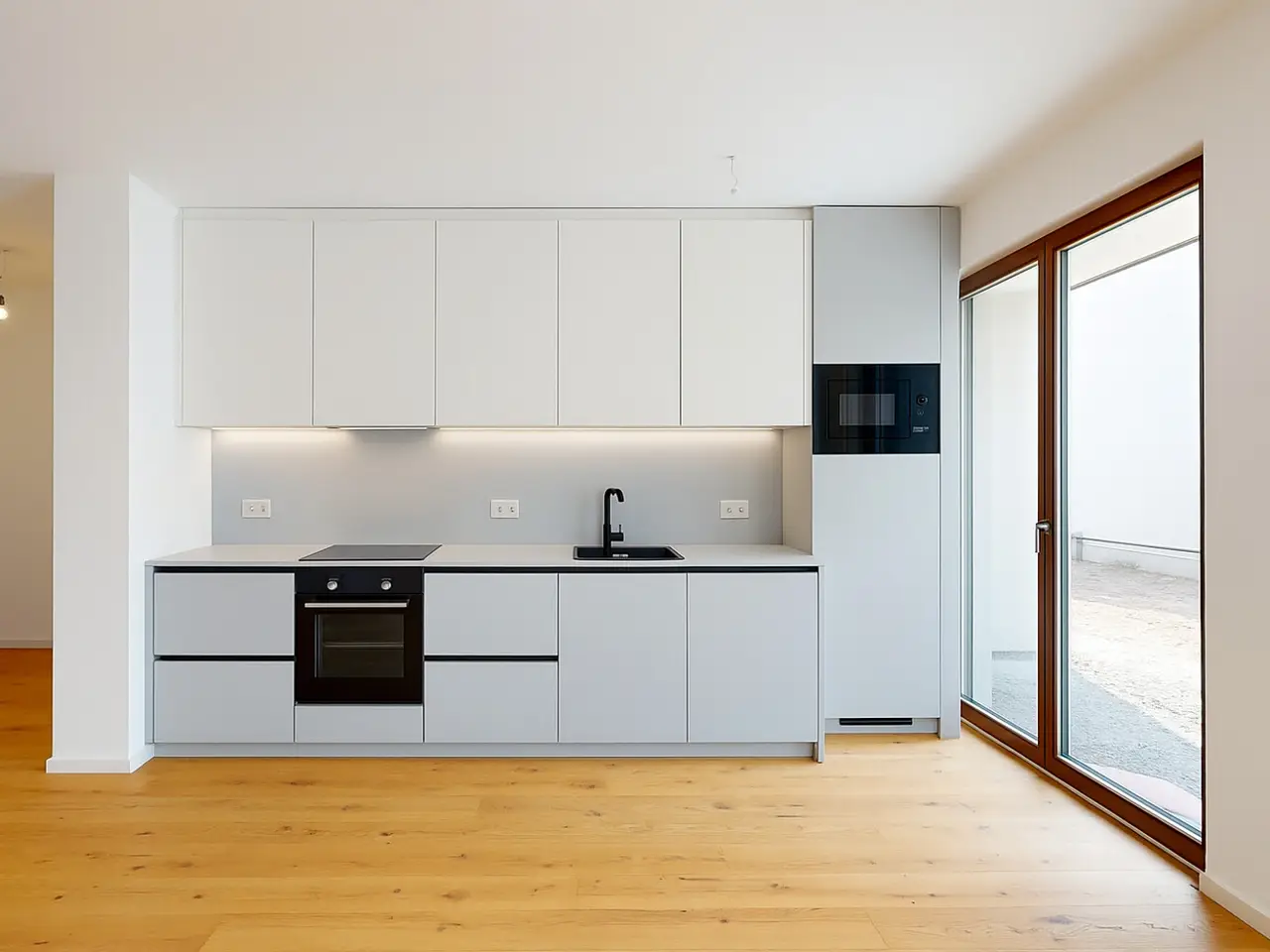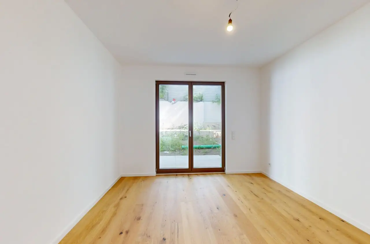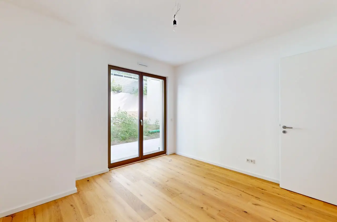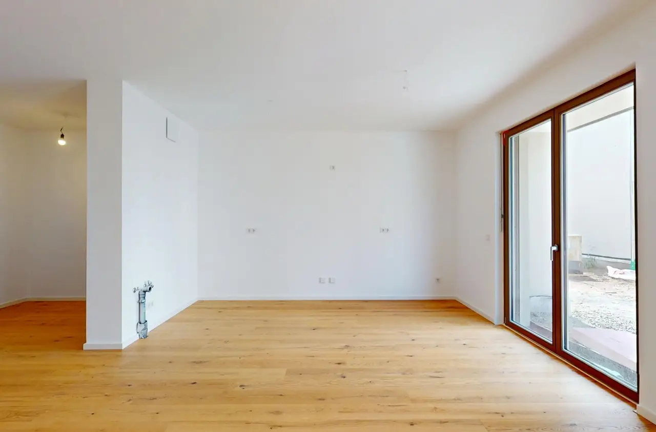 This exclusive first floor apartment combines contemporary living with superior comfort and a well thought-out, functional floor plan. It is located in an architecturally appealing new building in a quiet, mature location in Alt-Eschersheim - and offers you the special advantage of first-time occupancy. Access to the apartment is via a lovingly designed front garden, which emphasizes the private and inviting character of the building. Upon entering the apartment, you are greeted by the entrance area. To the left is the spacious living, dining and cooking area with an open kitchen - the communicative heart of the apartment. From the dining area, you have direct access to the west-facing terrace, which leads into the quiet inner courtyard of the houses and offers a charming view of the small bridge over the Nidda - a place for sunny afternoons and relaxing evenings. Floor-to-ceiling windows in all living areas create a bright, friendly atmosphere with plenty of natural light. Noble oak parquet flooring with a plank look lends the rooms warmth and style, while large-format porcelain stoneware tiles in the two bathrooms stand for timeless elegance. The high-quality bathrooms have walk-in showers or a bathtub, modern designer washbasins and fittings from renowned manufacturers. An absolute highlight of this apartment is the private outdoor space: two terraces, a sun deck as a retreat and a lovingly planted garden area enhance the outdoor living experience. These green spaces are exclusively available to this unit and offer the highest level of living quality. The apartment is located in an energy-efficient new KfW 55 building and is equipped with a pioneering hybrid heating system - consisting of an air heat pump in combination with modern gas condensing technology and photovoltaics - for sustainable living comfort. This property is ideal for discerning couples or families who value architectural quality, tranquillity and an apartment with garden space and terraces - without wanting to compromise on proximity to Frankfurt city center.