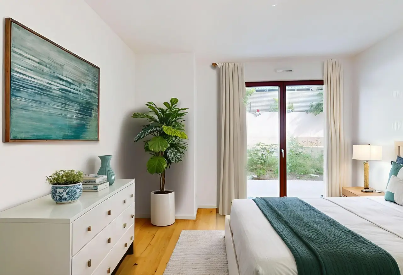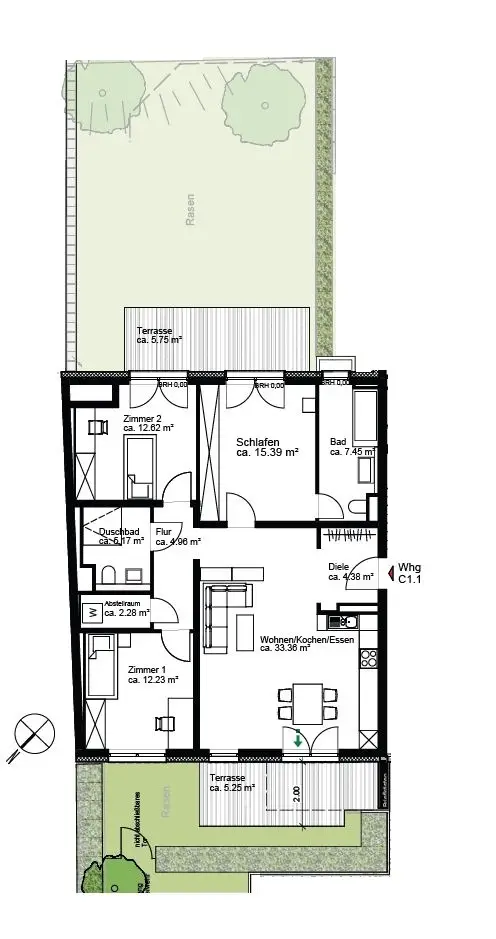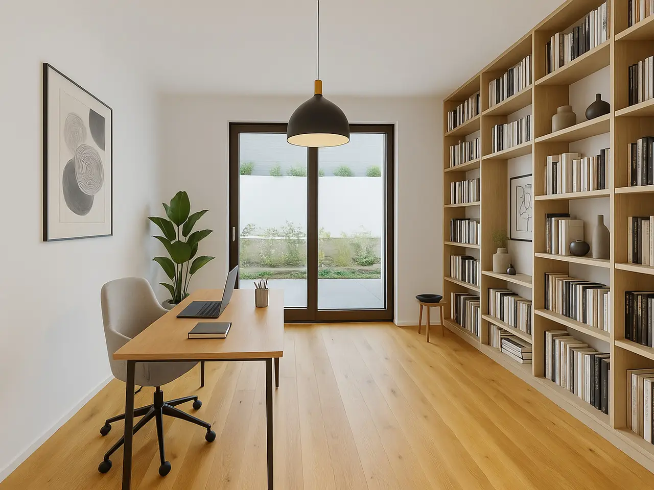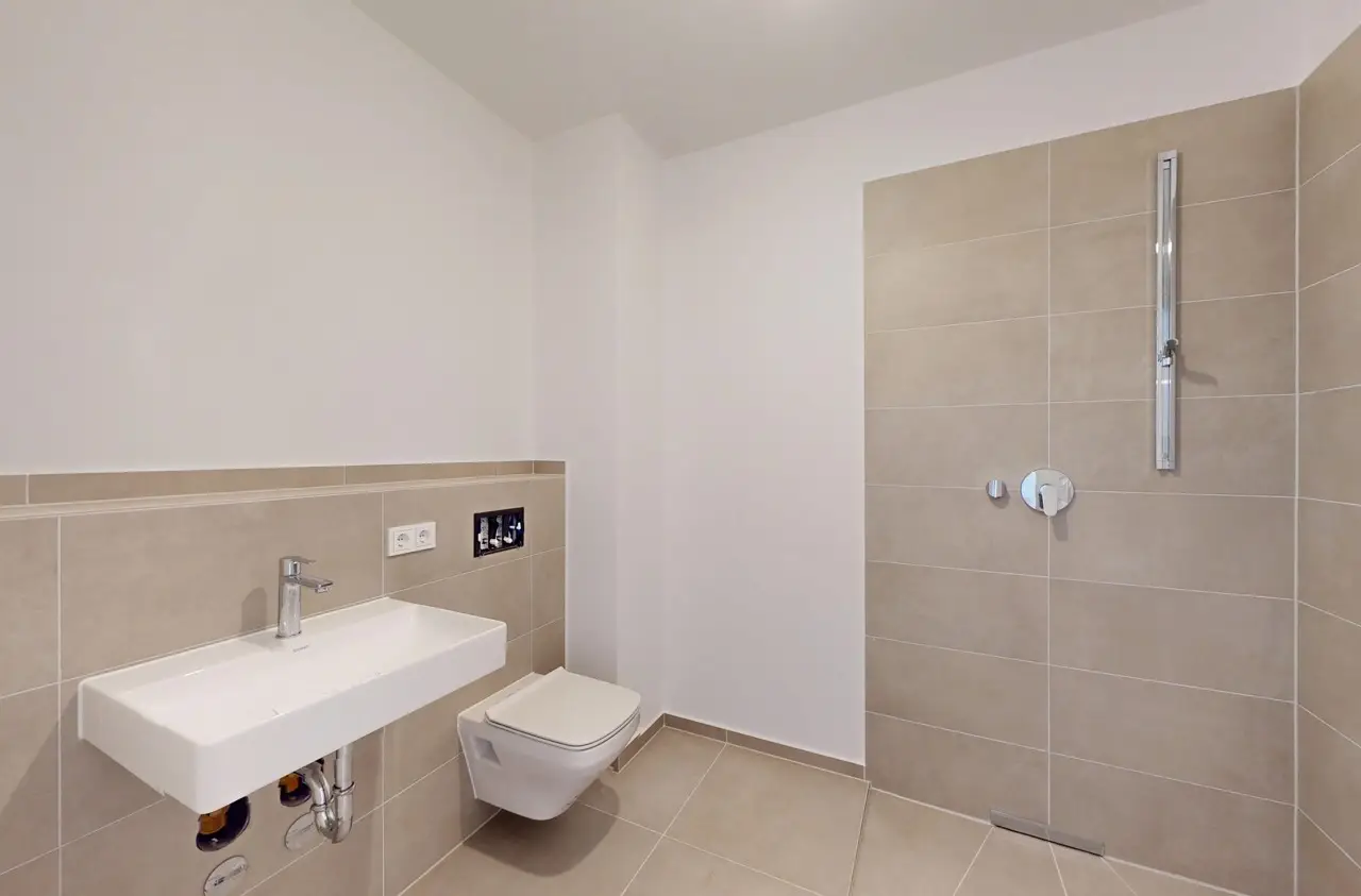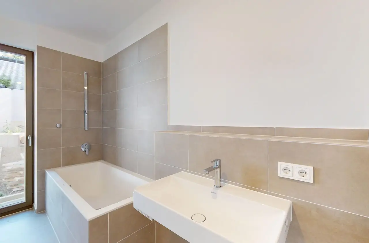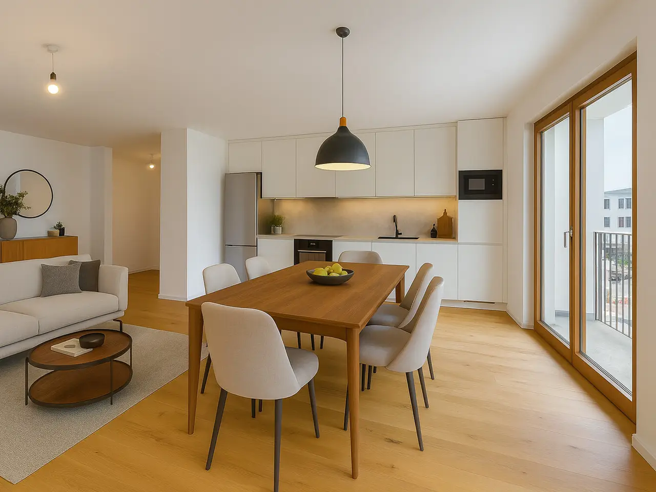 This exclusive first floor apartment combines contemporary living with superior comfort and a well thought-out, functional floor plan. It is located in an architecturally appealing new building in a quiet, mature location in Alt-Eschersheim - and offers you the special advantage of first-time occupancy. Access to the apartment is via a lovingly designed front garden, which emphasizes the private and inviting character of the building. Upon entering the apartment, you are greeted by the entrance area. To the left is the spacious living, dining and cooking area with an open kitchen - the communicative heart of the apartment. From the dining area, you have direct access to the west-facing terrace, which leads into the quiet inner courtyard of the houses and offers a charming view of the small bridge over the Nidda - a place for sunny afternoons and relaxing evenings. Floor-to-ceiling windows in all living areas create a bright, friendly atmosphere with plenty of natural light. Noble oak parquet flooring with a plank look lends the rooms warmth and style, while large-format porcelain stoneware tiles in the two bathrooms stand for timeless elegance. The high-quality bathrooms have walk-in showers or a bathtub, modern designer washbasins and fittings from renowned manufacturers. An absolute highlight of this apartment is the private outdoor space: two terraces, a sun deck as a retreat and a lovingly planted garden area enhance the outdoor living experience. These green spaces are exclusively available to this unit and offer the highest level of living quality. The apartment is located in an energy-efficient new KfW 55 building and is equipped with a pioneering hybrid heating system - consisting of an air heat pump in combination with modern gas condensing technology and photovoltaics - for sustainable living comfort. This property is ideal for discerning couples or families who value architectural quality, tranquillity and an apartment with garden space and terraces - without wanting to compromise on proximity to Frankfurt city center.