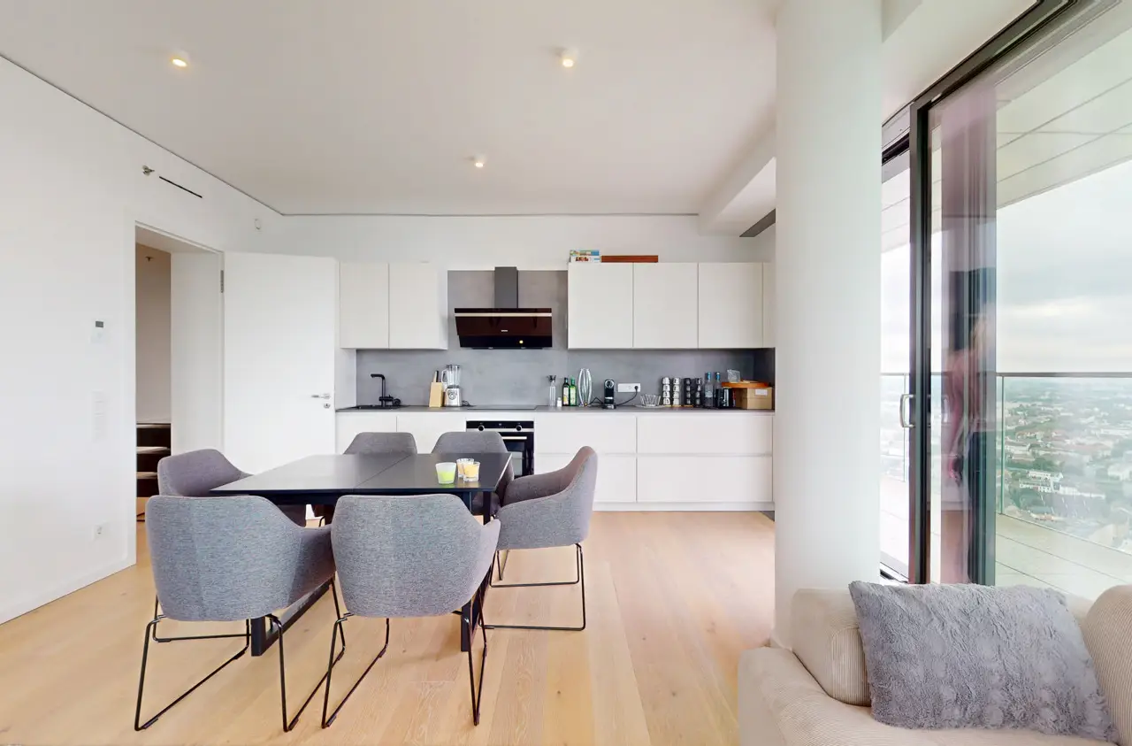 This absolute premium apartment is located on the fortieth floor of the Grand Tower, currently Germany's tallest residential tower at 180 meters - the most sought-after landmark building in Frankfurt. The transparent architecture, reminiscent of honeycombs, and the floor-to-ceiling windows offer airy living and magnificent views. The living/dining area is flooded with light and features curved glass fronts. From here, you have access to the balcony with all-round glass balustrade and views of Frankfurt and its skyline, as well as the Taunus and the entire surrounding area. The three bedrooms, one of which has its own balcony, offer great and practical living space. The communal Grand Garden on the seventh floor with lounge areas and herb garden and the Sunset Terrace on the 43rd floor invite you to relax and provide a communicative, urban atmosphere and magnificent views of the sunsets. The 24-hour concierge service and the Club Kitchen on the seventh floor are further highlights of this exceptional apartment. An underground parking space is included in the purchase price. The apartment is ideal for singles, couples or small families with up to one child who appreciate urban living in the Grandtower, combined with a high level of living comfort and communal areas for relaxing.