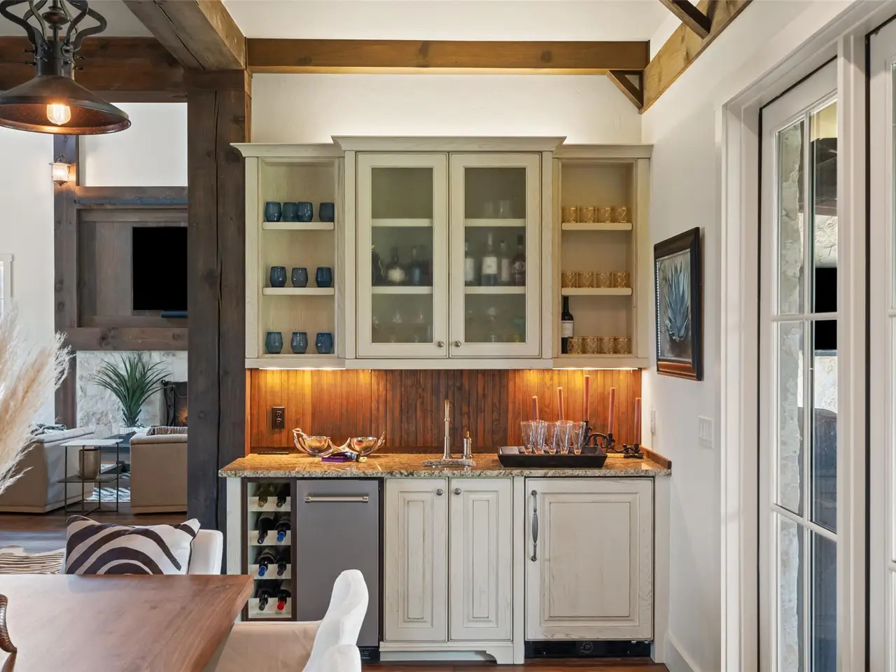 OPEN HOUSE ATTENDEES MUST REGISTER WITH AGENT! Discover the perfect blend of rustic charm and refined living in this expansive custom-built 6-bedroom, 6.5-bath, 5,637-square foot ranch-style retreat--featuring 3 private casitas, ideal for multigenerational living or hosting guests in style. Nestled in the heart of the Hill Country on 2.54 acres, this serene property offers comfort, flair, and Texas hospitality. Inside, you'll find a beautifully crafted interior that brings the outdoors in, with rich wood beams, interior limestone walls, custom cabinetry, and hand-selected moldings throughout. The great room impresses with soaring ceilings, abundant natural light from large windows, and one of the home's five wood-burning fireplaces. The kitchen is a chef's dream, featuring granite countertops, a 6-burner stove, and a wet bar perfect for entertaining. Bar top seating along with a formal dining area, a walk in pantry and generously sized laundry room complete the space. The property's two spacious indoor living areas offer plenty of room to relax or host, while plantation shutters and hardwood floors from a distillery add timeless charm and privacy. The owner's retreat is a true sanctuary, featuring its own fireplace and thoughtful upgrades throughout. Whether you're looking for a private getaway, or a place to host family and friends, this home offers it all--luxury, warmth, and tranquility. Step outside to expansive outdoor living spaces, where multiple patios invite dining, lounging, and entertaining under the Texas sky. Enjoy peaceful views from the covered patio or gather around one of the fireplaces for a cozy evening under the stars. Boot Ranch is a private, gated community spanning 2,080 acres, featuring a top-tier golf club, three heated pools, a pavilion with a bar and grill, tennis courts, pickleball, basketball, a fitness center, Longhorn Lake, a shooting range, bike trails, and a market center--all just 4 miles from the nearest grocery store.