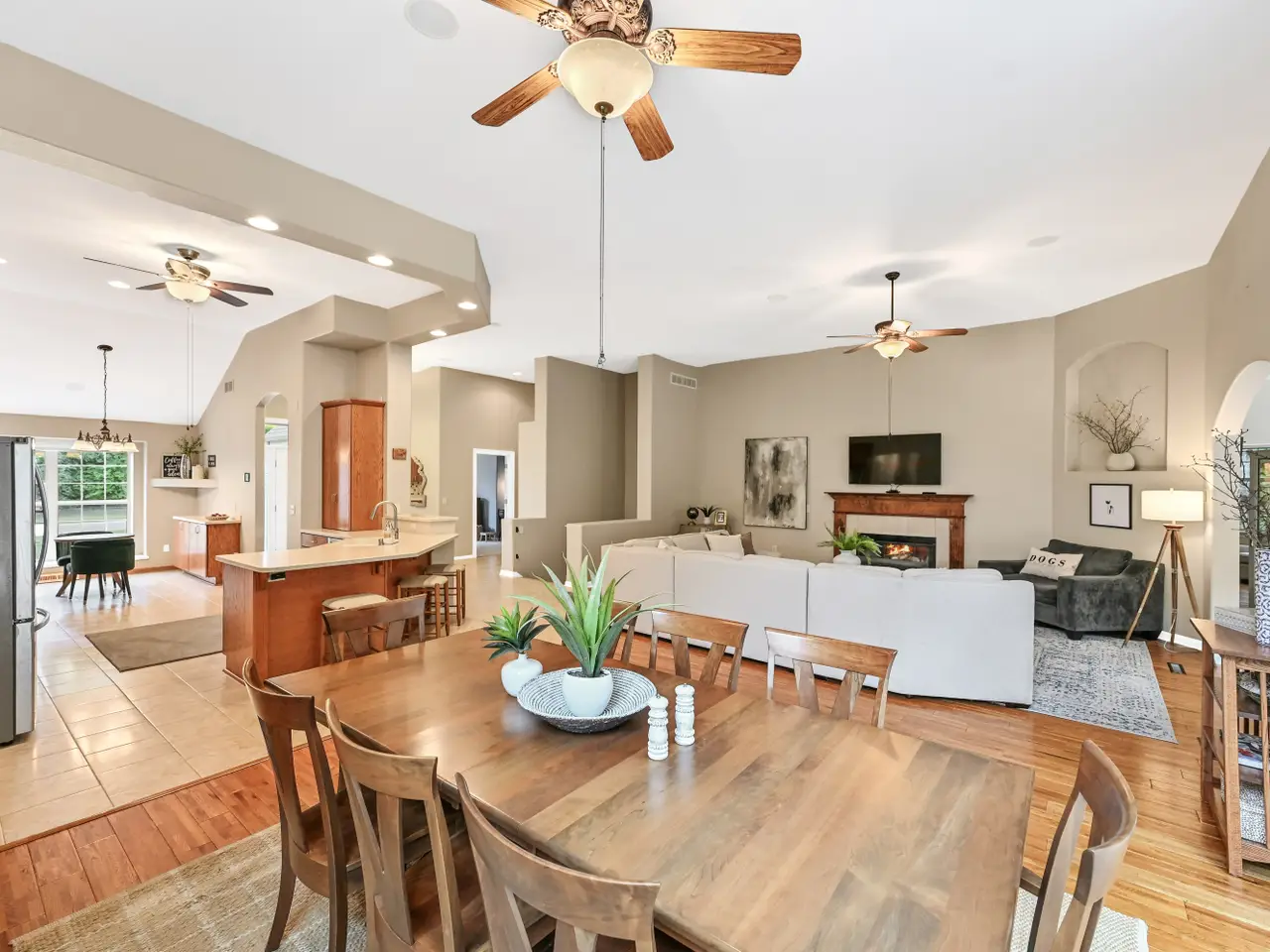 Welcome to Tree Tops! This impressive home will have you at hello. Step inside to soaring ceilings and an open layout that seamlessly connects the great room, dining area, and kitchen, perfect for everyday living or entertaining a crowd. Walls of windows fill the home with natural light and frame views of the private, wooded lot. Retreat to the expansive patio for outdoor dining, fireside chats, or simply soaking in the serene setting. Luxurious primary suite, plus two more spacious bedrooms and split entry second bath on main level. Half bath and large laundry room also on main. Fourth bedroom and third bath found in finished lower level, along with a large family room with bar, wine room, library with secret room, plus plenty of storage space. Enjoy the subdivision park and the convenient location, close to shopping and restaurants. Long list of updates too. Truly an exceptional opportunity.