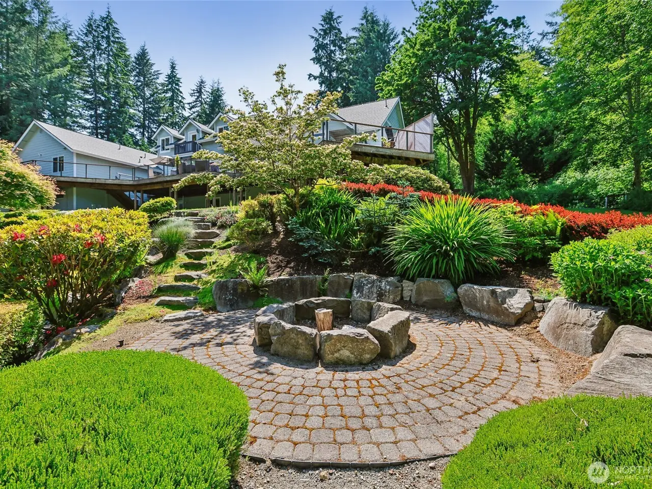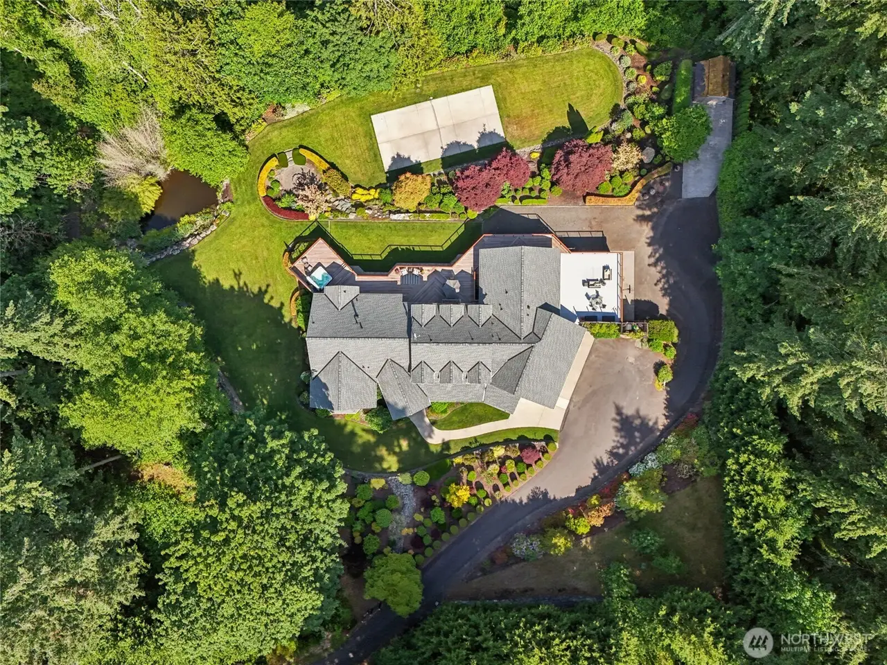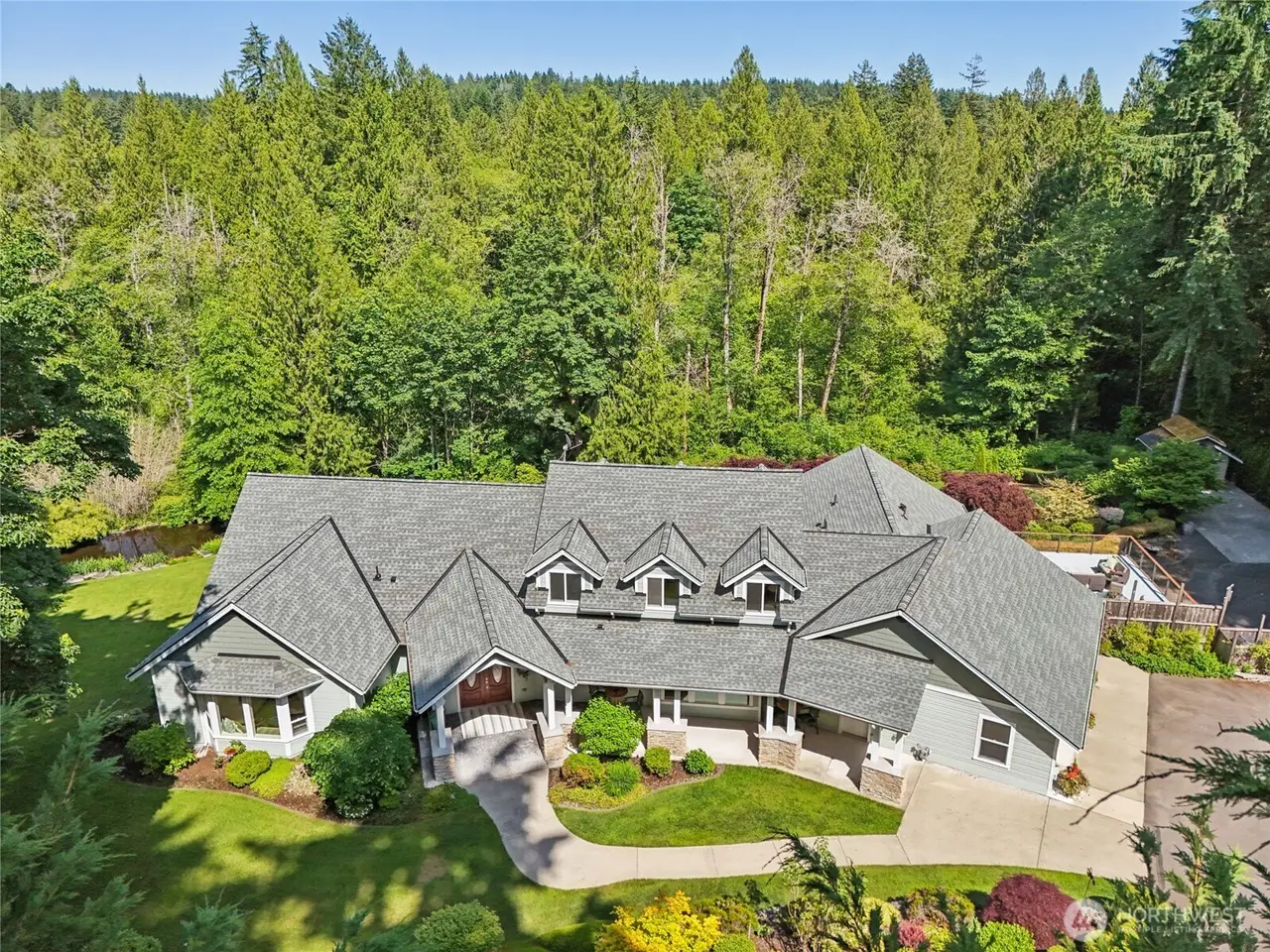 Gorgeous acreage property with multigenerational living & 826sf of garages. Meander through the trees to this breathtaking property. Covered wrap around porch guides you into the open & bright great room with walls of windows overlooking the trees. Primary suite on main with walk in shower & access to hot tub. Gracious office with built-ins. Chef's kitchen with granite counters. Bonus room & extra finished rooms. Lower floor features wet bar, wine room & 2 full baths. 1 bed/1 bath attached apartment with no stairs. Radiant in-floor heating in main house. Nearly 2000sf of decks overlook ponds, greenbelt, everchanging landscaping & sport court! (2) garages = 6 cars. RV parking w/hookups. Surrounded by greenbelt of forest, yet gets all day sun.