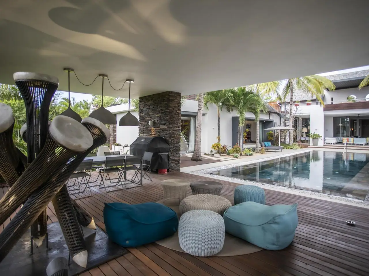 Set within the prestigious Mont Choisy Le Parc, part of the visionary Mont Choisy Smart City, this Island Signature Villa with four en suite bedrooms embodies the essence of contemporary elegance and refined island living. Mont Choisy Le Parc stands as a testament to the perfected amalgamation of design, construction, and vision, offering a lifestyle destination that sets new benchmarks in luxury living. Within the secure and serene environment of Mont Choisy Smart City, the estate provides a sophisticated and stress-free community for those who expect nothing but the very best. To bring this vision to life, the development collaborated with world-acclaimed South African architect Stefan Antoni of SAOTA, whose award-winning firm designed a collection of bespoke freehold villas and apartments that redefine modern tropical living. Occupying an exceptional 3,131 m² plot, this villa offers over 1,050 m² of refined living space arranged around a magnificent central pool. Its U-shaped design creates a seamless flow between the interior and exterior, blending open volumes, transparency, and natural light. The double-volume living room, opening onto the terrace and tropical garden, forms the heart of the home. A private TV lounge and a glass-walled mezzanine office add comfort and intimacy to this grand space. At its center lies a minimalist open-plan kitchen, harmoniously extending to the dining and lounge areas, enhanced by a glass-fronted wine cellar. To the rear, a fully equipped service kitchen, dedicated laundry, and independent staff access ensure discreet functionality and ease when entertaining. The master suite, located in its own wing, offers a large dressing room for her, a separate dressing for him, and a recently renovated bathroom with a walk-in shower, bathtub, double vanity, and abundant natural light — a true private retreat. On the opposite side, the three guest suites, each opening directly onto the pool deck, offer privacy and refined comfort in a tranquil tropical setting. Outdoors, the villa reveals exceptional living spaces designed for relaxation and entertaining. Around the pool, spacious covered terraces open onto a large open pavilion, an elegant extension of the villa ideal for hosting friends and family in a refined tropical atmosphere. The rooftop terrace, fitted with a bioclimatic pergola and jacuzzi, enjoys a dominant view over the property and a beautiful evening ambiance, offering a unique setting to enjoy the island’s soft light and sunset glow. Photovoltaic panels ensure energy efficiency, combining contemporary comfort with sustainability. Mont Choisy Golf & Beach – The Spirit of Northern Mauritius The estate is anchored by Mont Choisy Le Golf, Grand Baie’s only championship course, designed by renowned golf architect Peter Matkovich, often called the “land listener.” Sculpted between sugarcane fields and outcrops of black volcanic rock, this 18-hole course captures the island’s spirit with its natural ponds, sand hazards, and majestic palms. The elegant clubhouse, surrounded by banyan trees, provides a serene vantage point over the nearby greens. Just minutes from the estate’s western gates lies Mont Choisy Beach, stretching nearly three kilometres from Trou aux Biches to Pointe aux Canonniers. This gently curving expanse of golden sand, shaded by filao trees and kissed by crystal-clear turquoise waters, is perfect for long walks, swimming, and romantic sunsets. Developed under the IRS (Integrated Resort Scheme), the property grants Permanent Residency in Mauritius to the purchaser and their family. A home of character and distinction — the purest expression of Mauritian luxury living.
