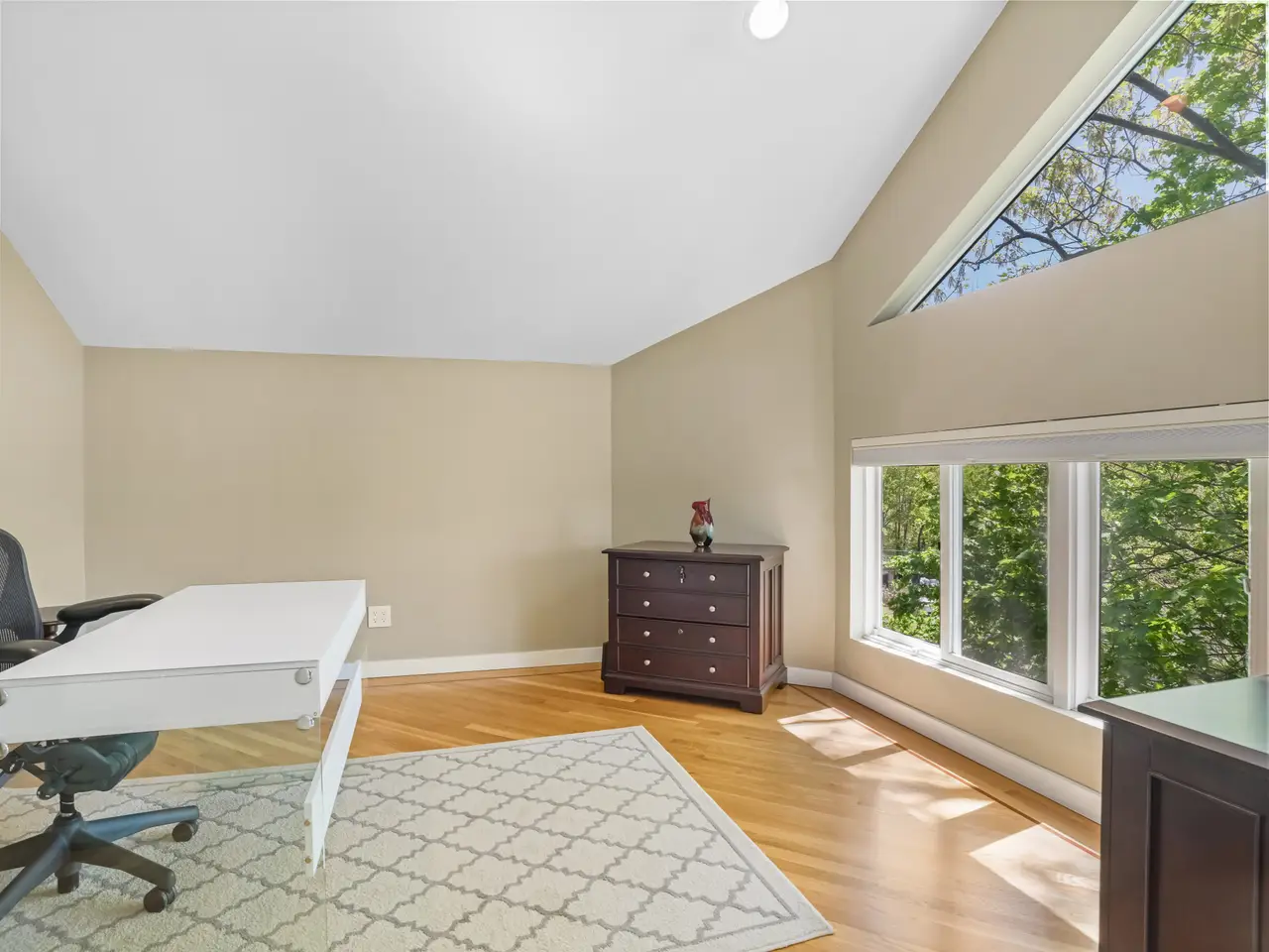 Possible five+ bedroom Contemporary with treetop views and expansive Zuri deck offers a great alternative to Condo living conveniently close to schools, shops, and Greenwich/PC trains. Sunny 2869 sq. ft. interior spans three generous levels with newly refinished wood floors and stunning glass enclosed center staircase. Open plan with so many possibilities; main level features chef's kitchen with breakfast bar seating; dining and living rooms, deck as well as bedroom, full bath and laundry room. Top floor features vaulted ceilings in office/bedroom, family room, two bedrooms with Jack/Jill bath and large dressing room/walk-in closet. Lower level entry affords kitchenette, two bedrooms, full bath and garage access. Adjacent conservation land offers privacy and yard without ownership costs