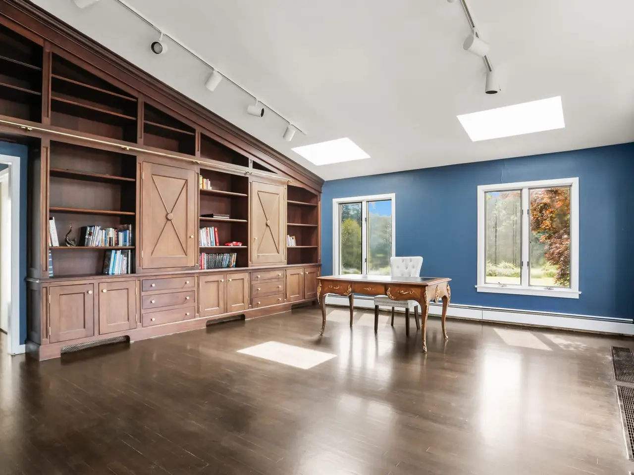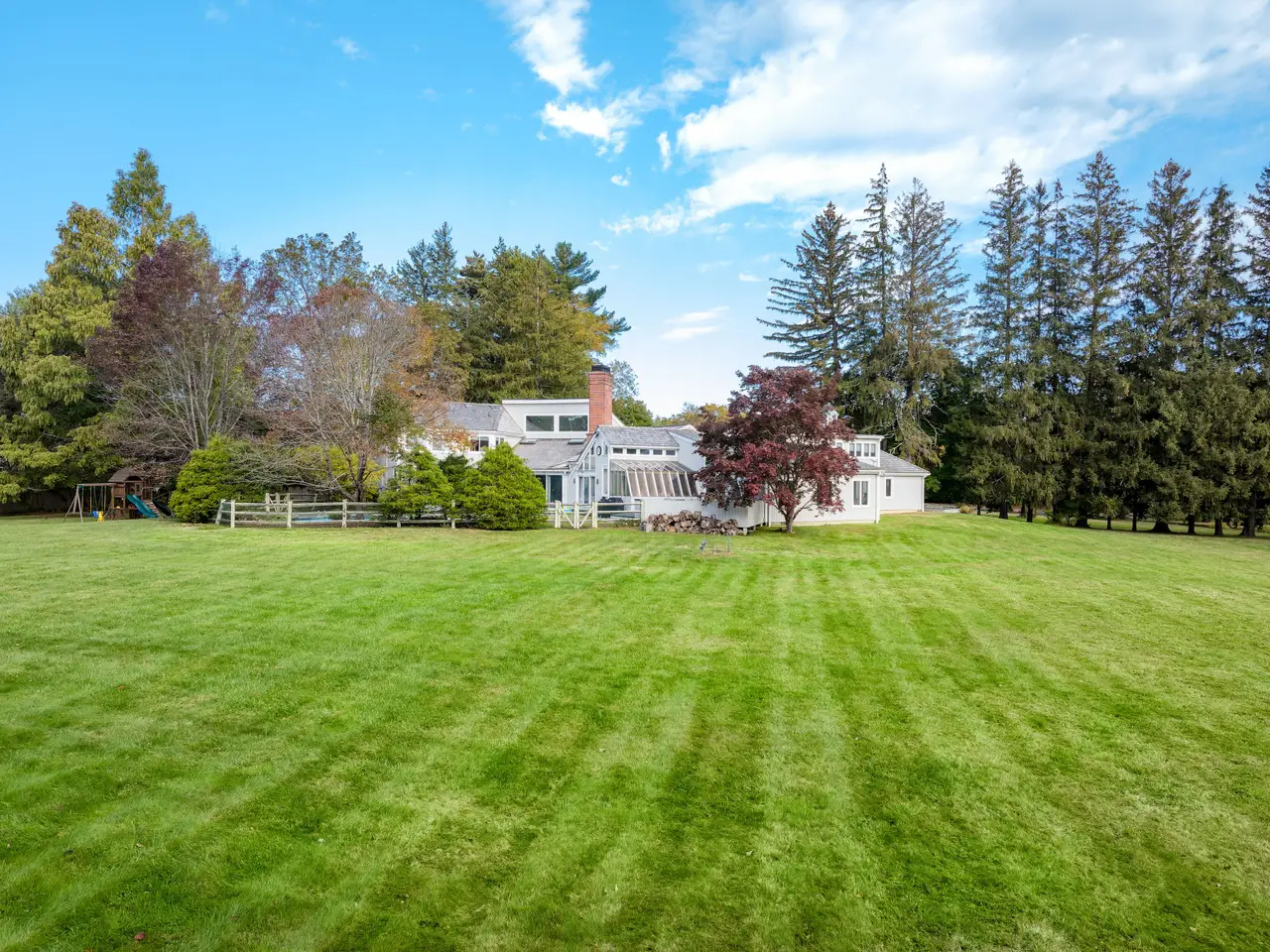 Reynwood Manor | set on completely flat 4 serene acres in coveted Back Country Greenwich, this impressive contemporary estate blends striking architecture with comfortable, light-filled living. The main level showcases 9-ft + ceilings, hardwood floors, and walls of glass that open to expansive terraces and level lawns. A gracious living room with fireplace, formal dining room, and library with custom built-ins complement the cathedral-ceiling family room and wet-bar den, creating ideal flow for entertaining. The primary suite on the main floor provides a peaceful retreat with a remodeled bath, walk-in closet, hardwood floors, and private sliders to the terrace. Upstairs are three additional bedrooms, two full baths, and access to the in-law suite. The lower level adds over 3,500 sq ft of unfinished space perfect for a gym, media room, or recreation area. FAR is 10,970 sf +/- and there is also a designated area for expansion of the existing septic system.