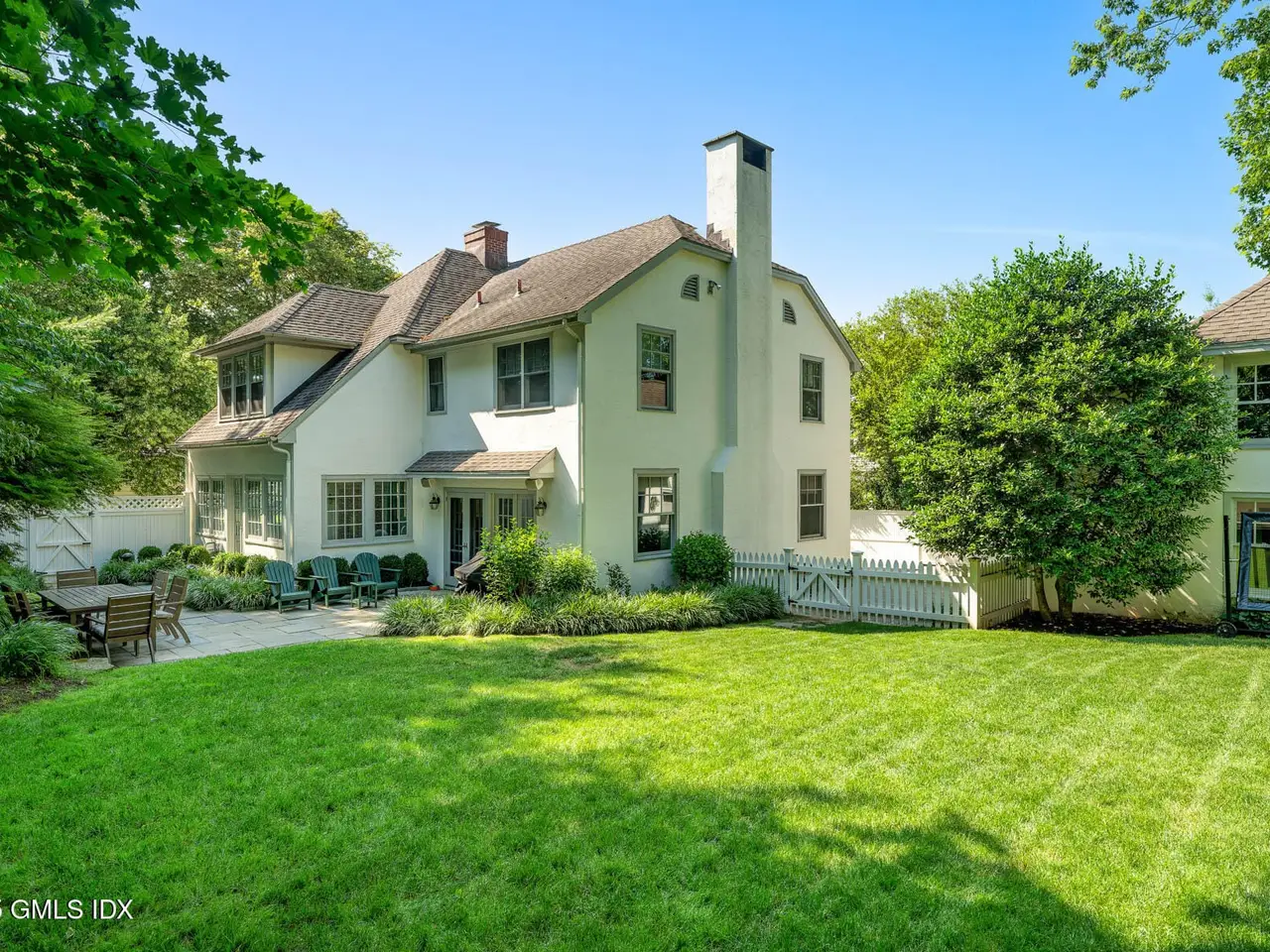 Perfectly positioned between conservation land and one of Greenwich's most prestigious roads, this five-bedroom home combines exceptional convenience with refined privacy. A tree-lined sidewalk provides direct access to downtown, while the property offers a serene, retreat-like setting. French doors open to a spacious terrace with outdoor lighting and a fully fenced yard, adjacent to an oversized two-car garage with bonus space above. The elegant family room showcases a grand stone fireplace and views of the manicured lawn, and don't miss the lower level complete with a playroom, laundry, and wine cellar.