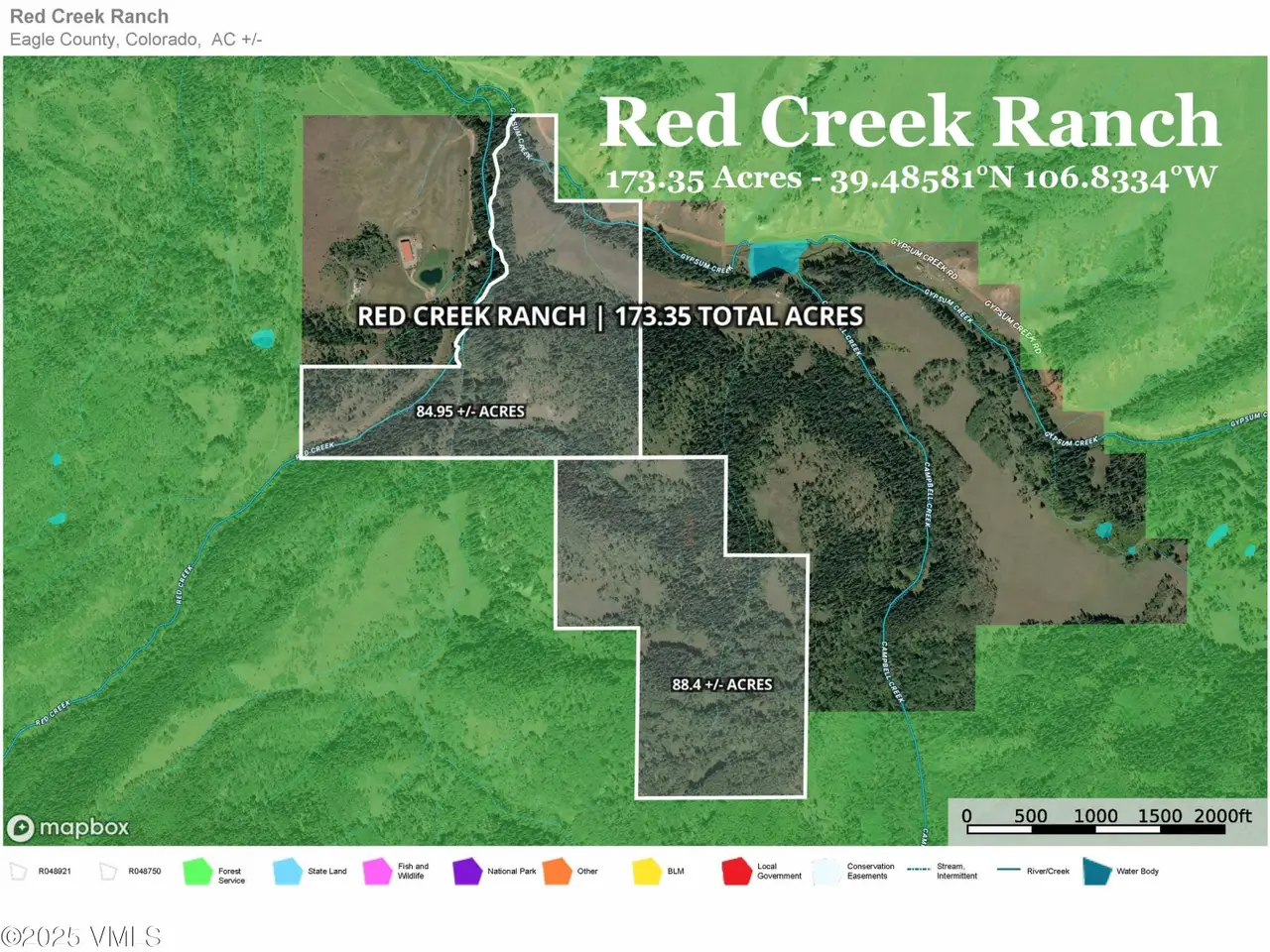 The Red Creek Ranch (RCR) is conveniently located between Colorado's Vail and Aspen ski resorts. The 173-acre property borders - and is virtually surrounded by - the White River National Forest. 'Live Water' flows through the CCR from Red Creek and Gypsum Creek. The elevation of the ranch ranges from 8,400' to 9,160' and supports a wide range of Colorado's diverse flora [riparian creeks, aspen groves, pine forests, sagebrush hills, open pastures] and fauna [deer, elk, moose, bear, coyote, fox]. The property is in Game Management Unit (GMU) 44 and offers direct access to thousands of acres of hunting and hundreds of miles of USFS off-road-vehicle-approved (ORV) roads leading to Sylvan Lake, Ruedi Reservoir, and beyond. Located 52 miles from Vail, 47 miles from Beaver Creek, 17 miles from the Vail Valley Jet Center, and 80.4 miles from Aspen, the Campbell Creek Ranch offers privacy, accessibility, and is the starting point of the ideal Colorado mountain getaway. The gentle topography also offers abundant options to build your 'cabin in the woods'. The Red Creek Ranch is adjacent to the 'available-for-sale' Campbell Creek Ranch [71.6 acres] and recently sold Red Creek Trail Ranch [65 acres]. Red Creek Ranch GPS Coordinates are 39.48581 degrees N 106.8334 degrees W. A custom interactive map of the ranch and surrounding area is available upon request.