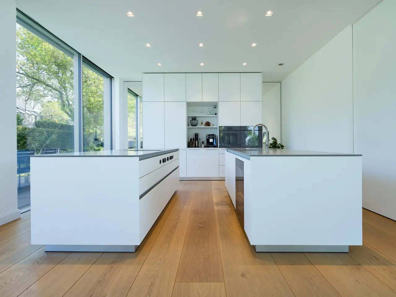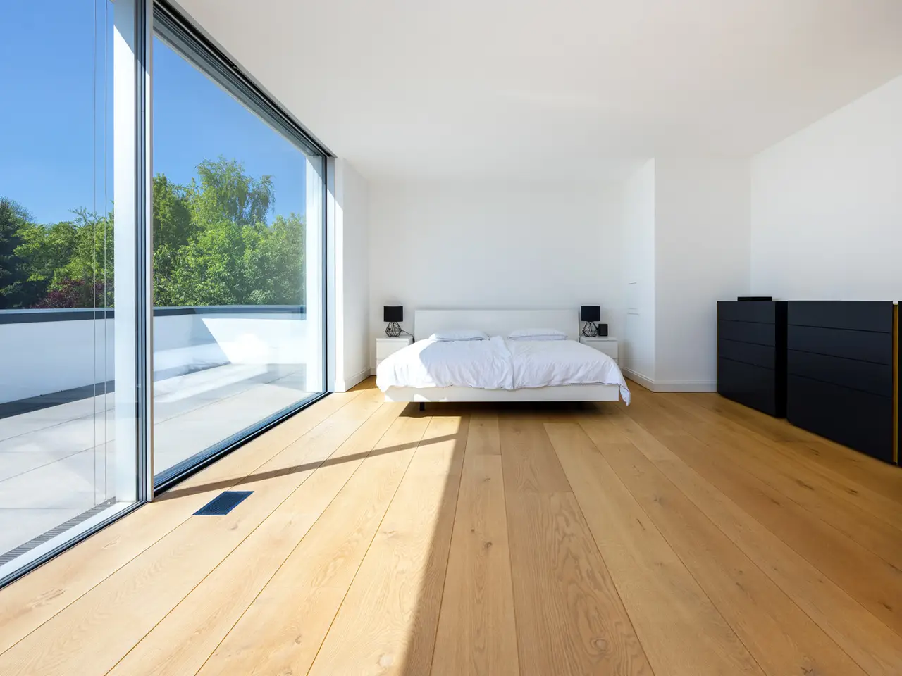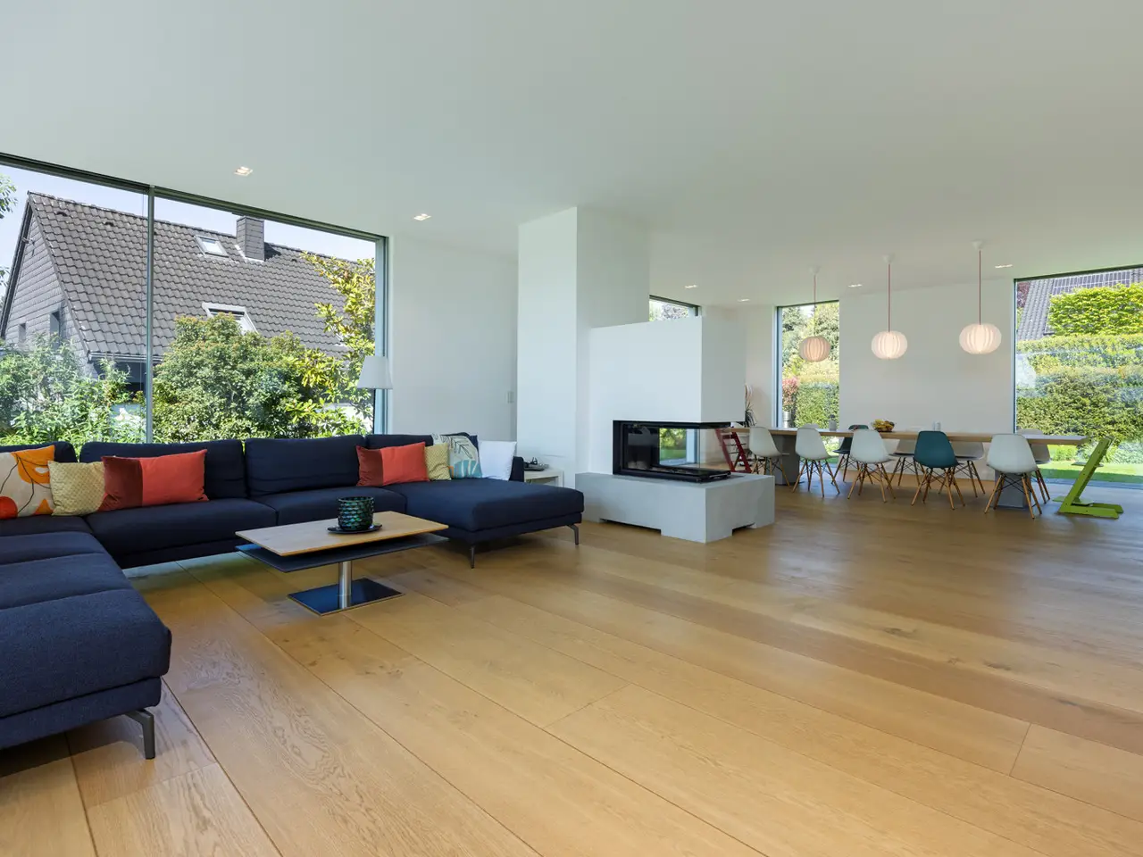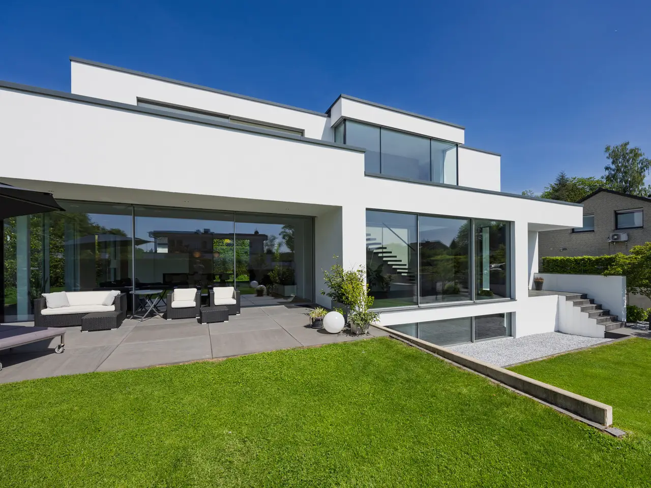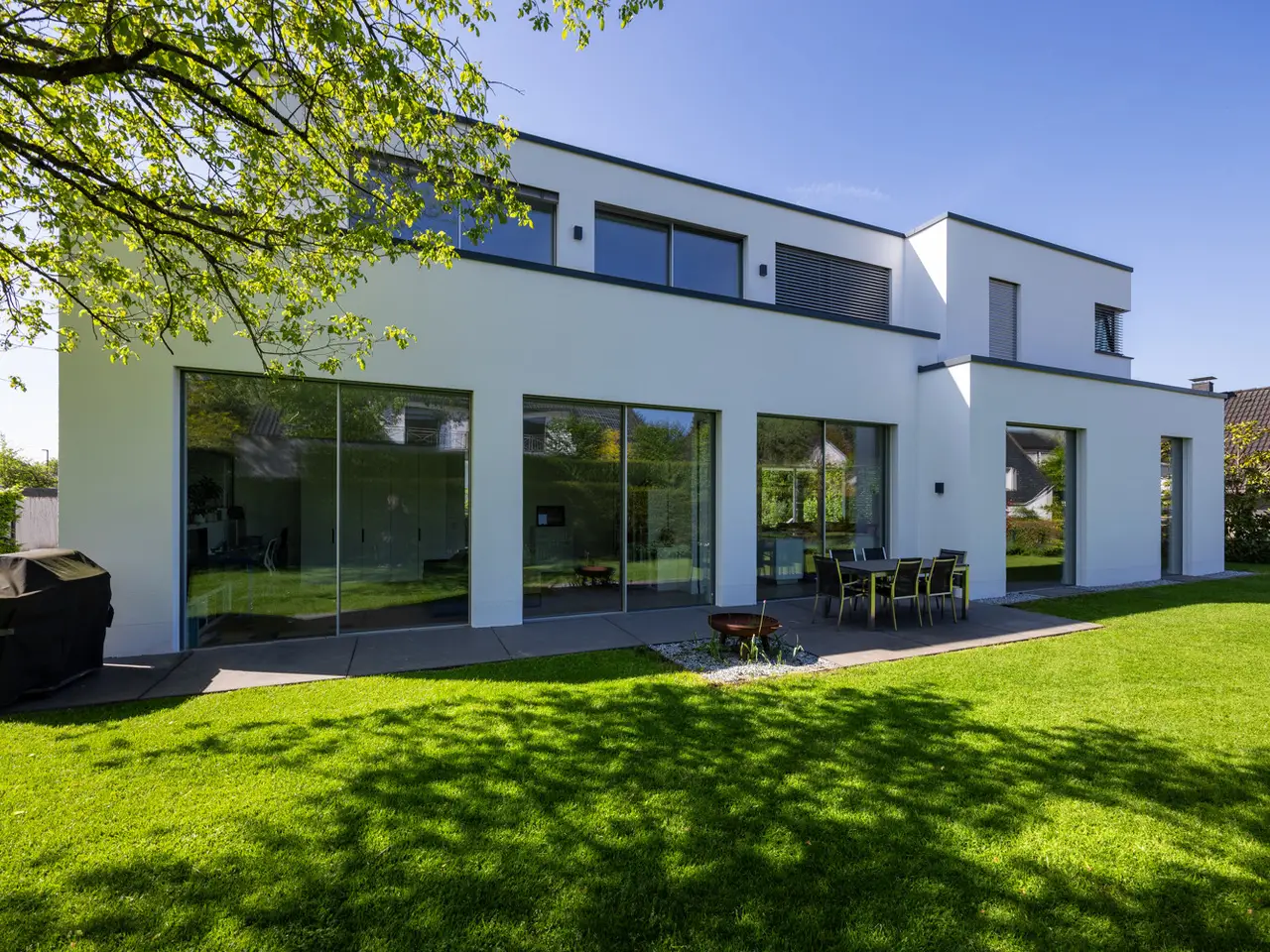 This modern villa, including a large granny apartment, completed in 2019, is situated on a plot of approx. 1,088 m² and offers a living space of around 380 m². This as-new property with its exceptional design and high-quality fixtures and fittings impresses with its generous room layout and technical refinements. The light-flooded first floor with a room height of 3.00 meters impresses with floor-to-ceiling Sky Frame windows, some equipped with electric drives and complemented by electric blinds in a Venetian blind design. Floor-to-ceiling sliding doors on the first floor and floor-to-ceiling doors on the upper floor ensure an extraordinary sense of space as well as perfect lines of sight and light. There are eight spacious rooms in the villa, including five bedrooms. The three stylishly furnished bathrooms offer maximum comfort and have been designed with extra-long and wide tiles. The living/dining area is divided by an elegant fireplace, which can be seen from three sides through glass surfaces, creating a pleasant atmosphere. High-quality oak floorboards, five meters long and extra wide, underline the elegant ambience of the house. The modern Bulthaup kitchen is equipped with high-quality appliances and offers plenty of space for culinary development. Another gastronomic highlight is the in-house wine cellar. The villa's climate-friendly energy concept is supported by a geothermal heat pump, a photovoltaic system and underfloor heating. A central ventilation system ensures a pleasant indoor climate. The property also has a smart KNX bus system for convenient control of the building services. An outstanding feature of this villa is the heated underground garage with six parking spaces and three additional outdoor parking spaces. A separate apartment with two rooms, fitted kitchen and bathroom is available for guests or staff and can be accessed via a separate entrance. The property meets the highest standards of living quality and energy efficiency and is ideal for families or discerning individualists who value exclusive living. The residential location offers good connections and a quiet but central residential area. Please contact us for further information or to arrange a viewing appointment to see this unique residential offer for yourself.