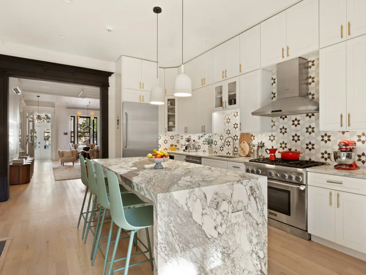 Exquisite, Fully Renovated Limestone Townhouse in Historic Hamilton Heights A tour de force of timeless elegance and modern luxury, 472 West 143rd Street is a restored and fully renovated Gothic-style townhouse nestled in the prestigious Hamilton Heights Historic District. This architectural gem, built in 1896 by architect John P. Leo, sits on the historic block once home to Alexander Hamilton's estate, Hamilton Grange. This 5,300-square-foot, two-family residence offers an unparalleled living experience just two express subway stops from Midtown Manhattan, sitting right between two major subway lines. Modern Systems, Historic Fabric This townhouse has undergone an extensive restoration, preserving its Gothic-style heritage while integrating state-of-the-art upgrades. Fully modernized electric and mechanical systems, smart-thermostat controlled central (split) air conditioning and heating ensure year-round comfort. European-inspired design elements, including wide-plank oak floors and marble countertops elevate the home's luxurious appeal, while historic details like fireplaces and carved woodwork display its storied past. A Masterfully Designed 4-Story Owner's Unit Step into the four-story owner's residence, a sprawling 3,300-square-foot haven, starting on the parlor floor. Enter through a chic vestibule up the stoop, where the open parlor level unfolds into over 30 feet of loft-like living and dining space. A striking exposed brick wall and a beautifully preserved historic staircase anchor the space, harmonizing with sleek oak floors. The dining area, bathed in light from a bay window, comfortably seats eight and is in conversation with a large central living area. The south-facing kitchen, through an intricately carved historic doorframe, is a sunlit masterpiece on the south side of the parlor floor. 11-foot ceilings accentuate the airy ambiance. A Breccia Cabraia marble island and a historic fireplace are the focal points. Expansive countertops provide ample prep and entertaining space, while a premium stainless steel appliance suite-featuring a six-burner Thermador range, large refrigerator, and dishwasher-elevates the culinary experience. A full, marble-clad bathroom with a broom closet completes this level, adding convenience and functionality. Serene Outdoor Oasis From the kitchen, step directly into a south-facing private garden, a tranquil retreat designed for relaxation and entertainment with a striking backdrop of the landmark Our Lady of Lourdes facade. Bluestone pavers, a built-in bench, and a lush planting area create an inviting atmosphere, enhanced by integrated lighting for enchanting evenings under the stars. Luxurious Upper Levels The third floor is dedicated to a full-floor primary suite, encompassing two expansive, sun-drenched rooms connected by a walk-in closet with accent lighting. The south-facing primary bedroom, with over 21 feet of depth and 9'8" ceilings, offers serene garden views and a historic fireplace with hand-painted Moroccan tile as its centerpiece. Across the hall, a versatile north-facing room-ideal as a bedroom, sitting area, or home office-overlooks the charming townhouse facades of West 143rd Street, also featuring a historic fireplace. A windowed primary bathroom with a claw-foot tub completes this serene retreat. The fourth floor houses two generously sized bedrooms, each with excellent closet space, a hall bathroom adorned with hand-painted Turkish tile and a skylight, and a laundry area. The north-facing bedroom boasts a charming bay window with panoramic views of the historic district, while the south-facing bedroom opens to a private terrace with stunning vistas of the landmark Our Lady of Lourdes church. Crowning the home is the top floor, a versatile space perfect as a fifth bedroom, home office, gym, or recreation room. Exposed brick and abundant south-facing light create a warm, inviting ambiance, with direct access to a roof terrace offering sweeping views and endless possibilities for outdoor enjoyment. Income-Producing Garden Apartment Below the stoop lies a completely separate 1,500+ square foot garden apartment, ideal for supplemental income or guest accommodations. This modern two-bedroom, two-bathroom duplex includes a fully finished cellar, a renovated kitchen, a washer-dryer, and several additional flexible spaces for home offices. With a private entrance and no interior connection to the owner's unit, this apartment ensures complete privacy. Direct garden access can be allocated for tenant use, enhancing its appeal. Prime Location in Hamilton Heights Nestled within the serene and leafy Hamilton Heights Historic District, this home offers a rare blend of tranquility and urban convenience. Surrounded by stunning townhouses and ecclesiastical architecture, the neighborhood is a charming enclave unique in Manhattan. Enjoy proximity to outdoor amenities like St. Nicholas Park, Jackie Robinson Park, and Alexander Hamilton Playground. Subway service is just blocks away, with express A, B, C, D or local 1 service at their respective 145th Street stations. This extraordinary townhouse is a rare opportunity to own a piece of New York history, reimagined for modern living.