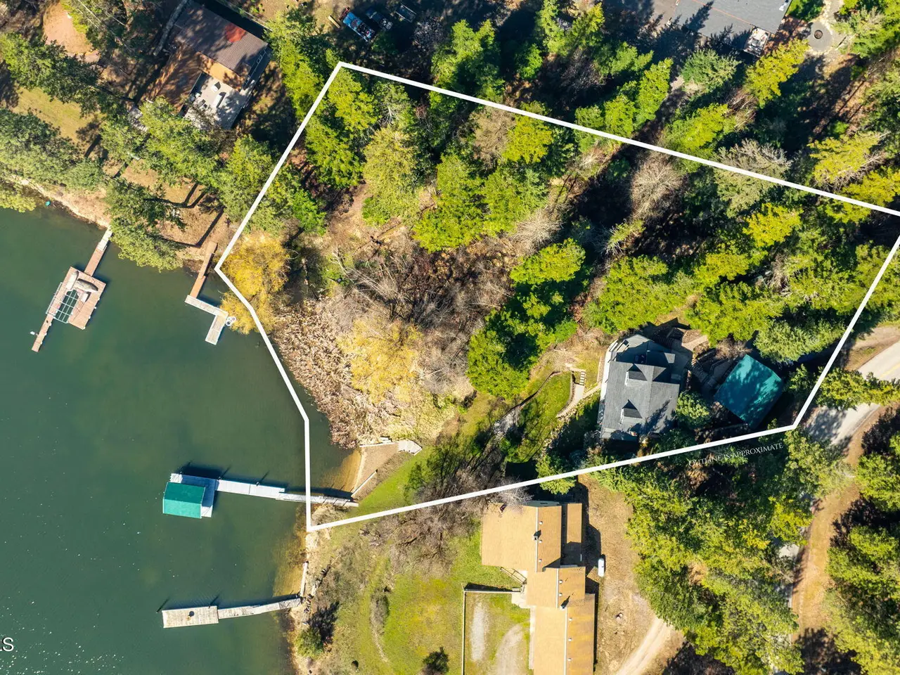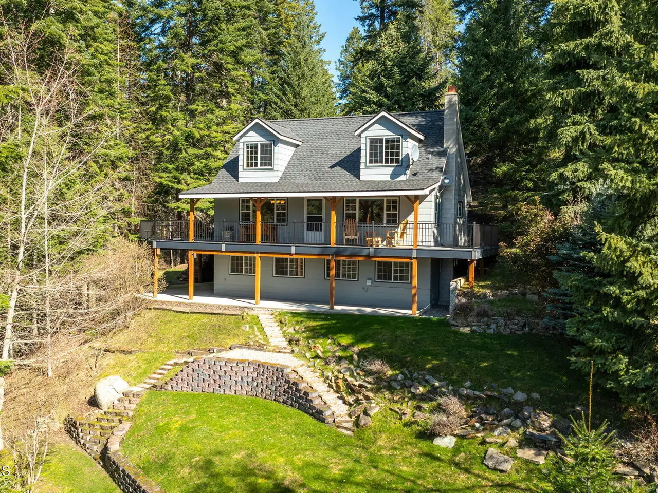 Nestled on Hayden Lake's coveted Mokins Bay, this waterfront retreat offers tranquility and recreation. Walk down to the covered dock and enjoy boating, kayaking, canoeing or fishing in the deep scenic bay that features a no wake zone. With 172 feet of waterfrontage and a sandy beach, the property spans 1.17 acres, comprising two lots, with a year-round creek running between the lots. The terraced landscaping has been thoughtfully designed to blend with the natural surroundings, creating a serene and inviting atmosphere. Originally built as a cozy lake cabin, this home has undergone a complete transformation to offer modern comforts and conveniences while retaining its rustic charm. Step inside to discover a beautifully remodeled interior, featuring updated kitchen and bathrooms, new flooring, and fresh paint throughout. With ample natural light, the home offers a warm and inviting ambiance, perfect for gatherings. Updated plumbing ensures worry-free living, allowing you to fully embrace the lakefront lifestyle. Whether you're seeking a private retreat for your family or an investment opportunity in the vacation rental market, this property offers endless possibilities. Previously, it operated as a successful vacation rental, the home comfortably accommodates 10+ guests. The detached garage provides convenient storage for all your lake toys and equipment, ensuring that you have everything you need to make the most of your time on the water. With its unbeatable combination of natural beauty, recreational amenities, and modern comforts, this Hayden Lake waterfront retreat offers a truly unparalleled living experience.