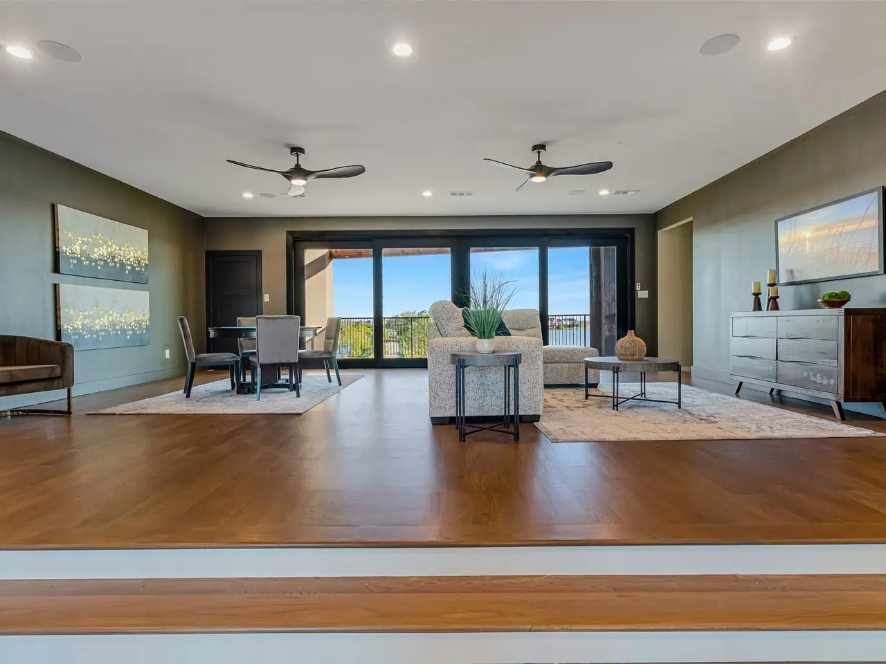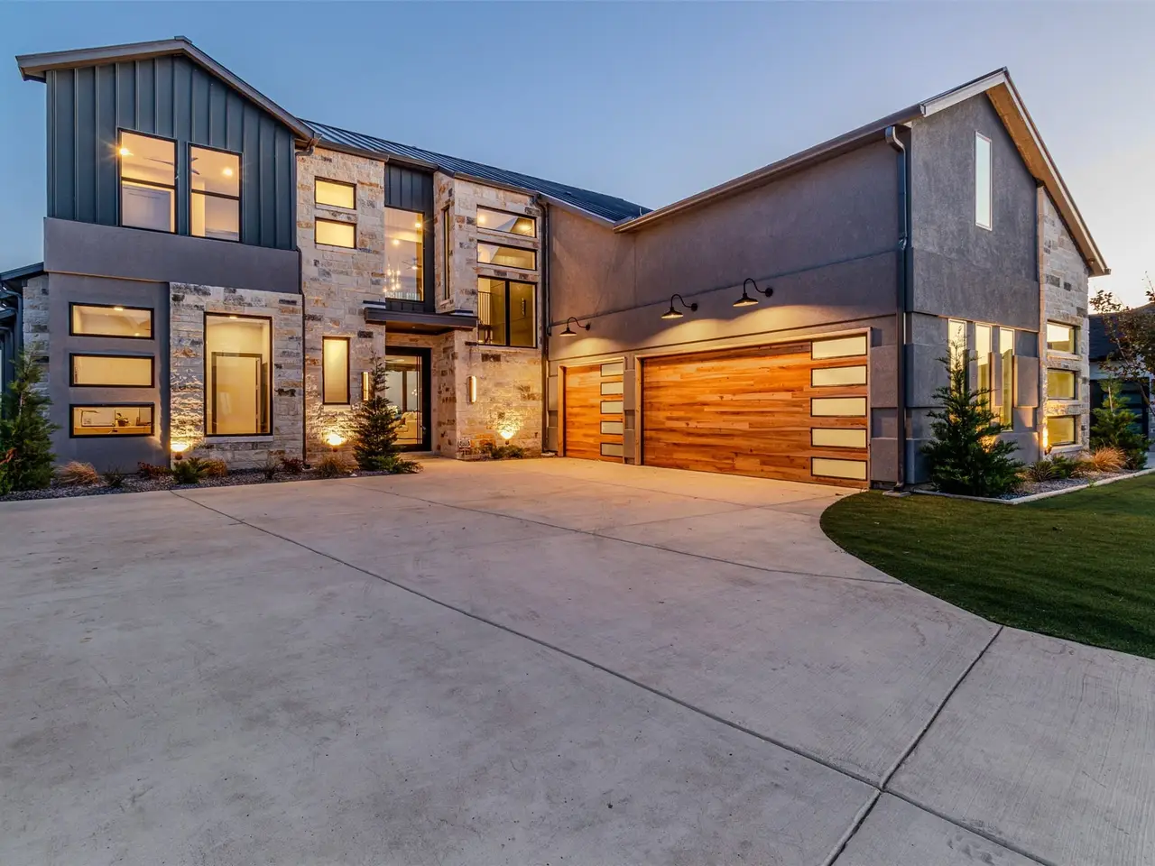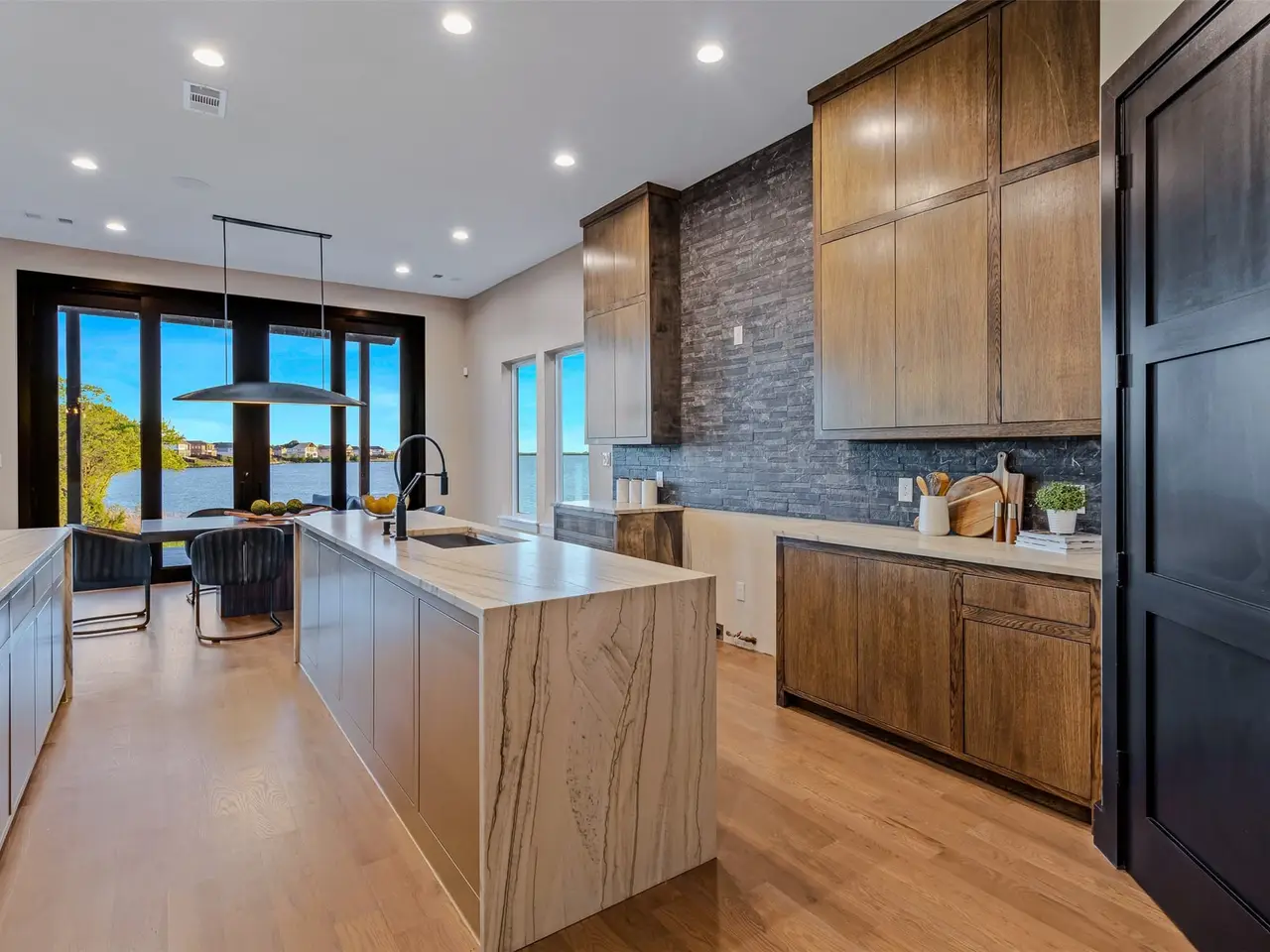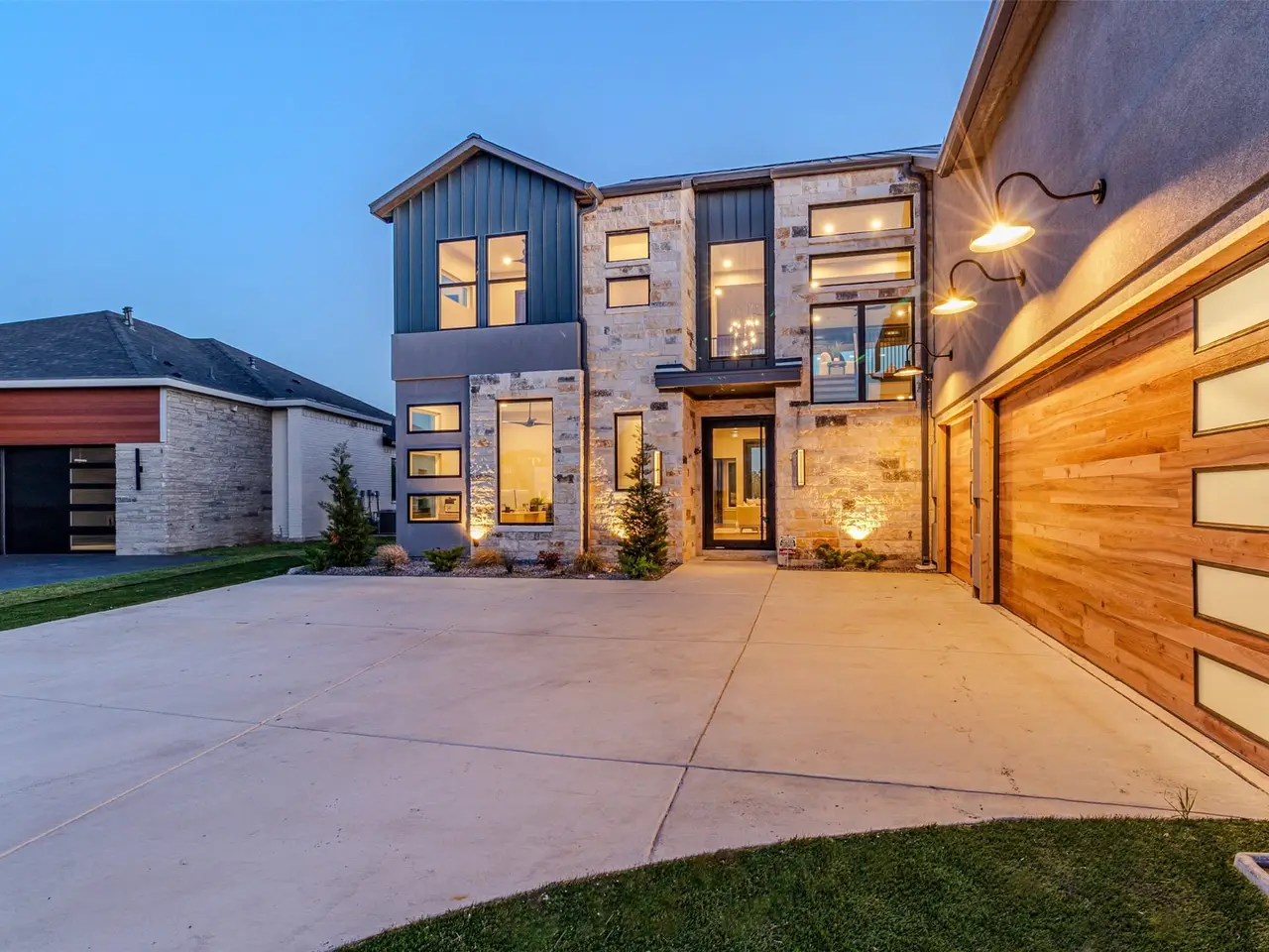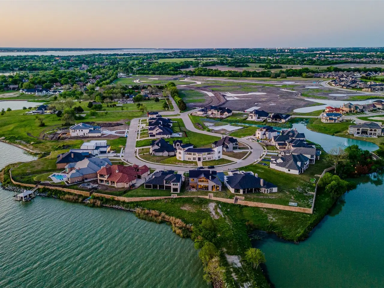 Luxury Lakefront Home, Modern Custom Architectural Design. Private peninsula on Lake Ray Hubbard with enough shoreline for a boathouse. Bespoke designer finishes throughout including Ivory Macabus quartzite countertops, European oak wood and large format slate tile floors, designer lighting and 12-foot ceilings throughout. Immediately walking into the grandeur of the open concept living space, dining room, and kitchen the stunning 12' sliding iron doors with floor to ceiling windows envelop you into this luxury lake home with picturesque views of Lake Ray Hubbard. Enjoy the peaceful tranquility of these waterfront views from the master bedroom which features cathedral ceilings, ensuite bath with walk-in dual shower, freestanding soaking tub, custom closet system, quartz countertops and dual sinks. Upstairs the spacious loft perfectly suited for both a media room and game room feature sliding glass door system open to the balcony where you can enjoy watching the sunset sailing regatta.