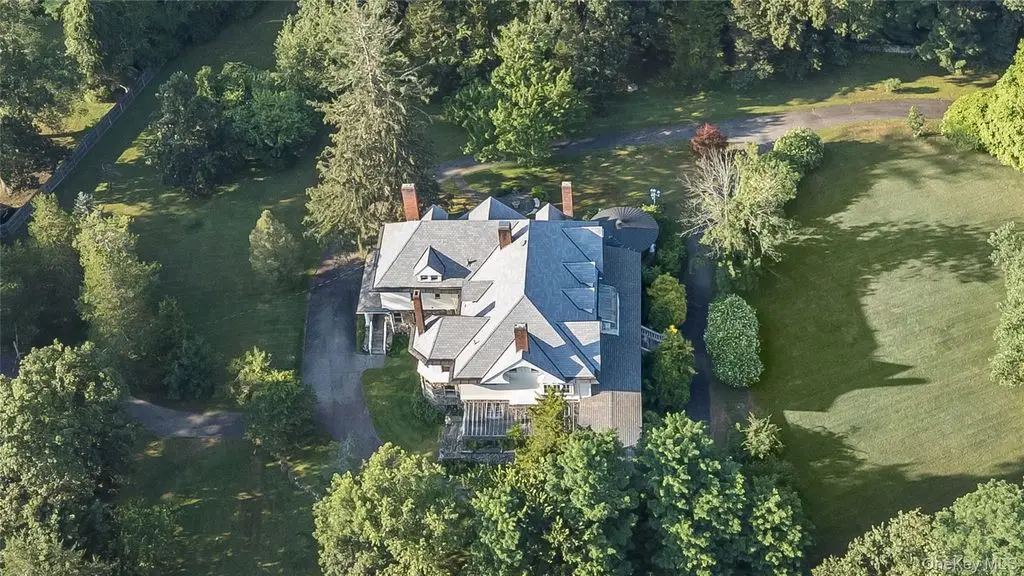 Evoking the charms of a more serene life, this Victorian center hall mansion, set on 5.7 glorious acres, is a study in paradise. The curved balustrade entry leads to a commanding multi column 100 foot veranda highlighted by a tongue & groove wood ceiling. Sit outside & enjoy the mountain view & parklike property. A highlight too is the copper cupola & new Davinci slate roof! Upon entering, timeless beauty matches impeccable luxury with the grand foyer, crowned by a stained glass window & fireplace. Pocket doors open to the dining room on one side & the living room on the other. The living room is highlighted by another fireplace (which has a dual opening to the outside patio) & a hexagon parlor. There's easy access to the patio too. The enchanting dining room, with special detailing & oak paneling, has a commanding fireplace. The butler's pantry is replete with cabinets & sink. The chef's eat in dream kitchen provides furniture-quality cabinets, a Viking 6 burner cooktop, warming drawer, alcove grill & Subzero refrigerator. A powder room is conveniently located nearby. With easy access out & to the servants staircase, the charm continues. Take the sweeping staircase to the second floor, where multiple bedrooms & baths cluster around a family room. The primary bedroom has glorious views & a marble bathroom with shower, tub with jets & dual sink as well as a huge walk in closet & private study (with gorgeous built in bookcases). Off the family room is a solarium with stunning views. The huge cellar has high ceilings, a Bilco door & young boiler. A second house on the property hosts a garage & lots of possibilities. This one of a kind Hudson Valley gem is truly amazing!